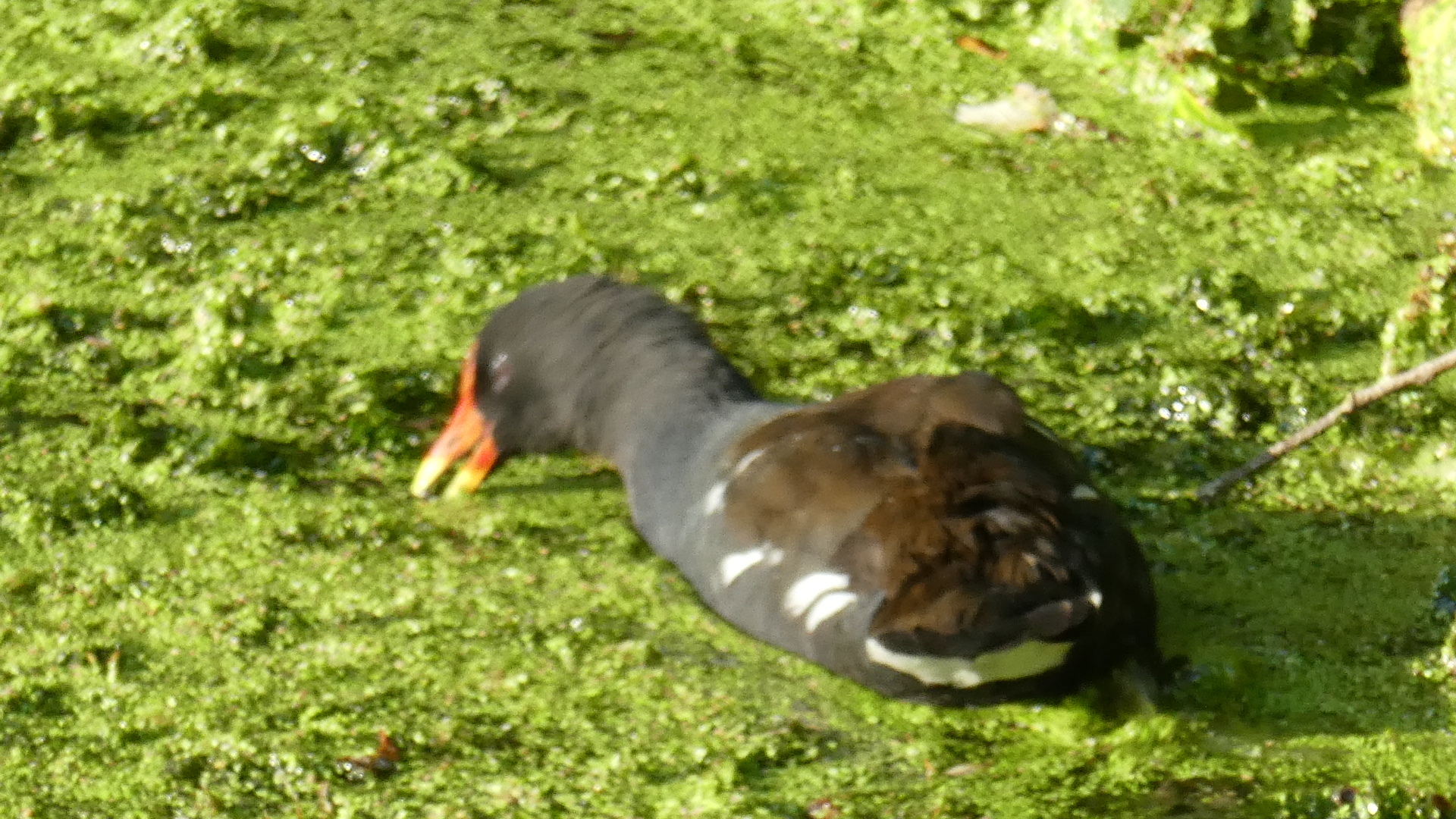 There was a ditch on the non-canal side of the path, and this contained a lot of Coots, but another type of bird that always waddled under cover a we approached. Here is our best shot of it. Any ideas?