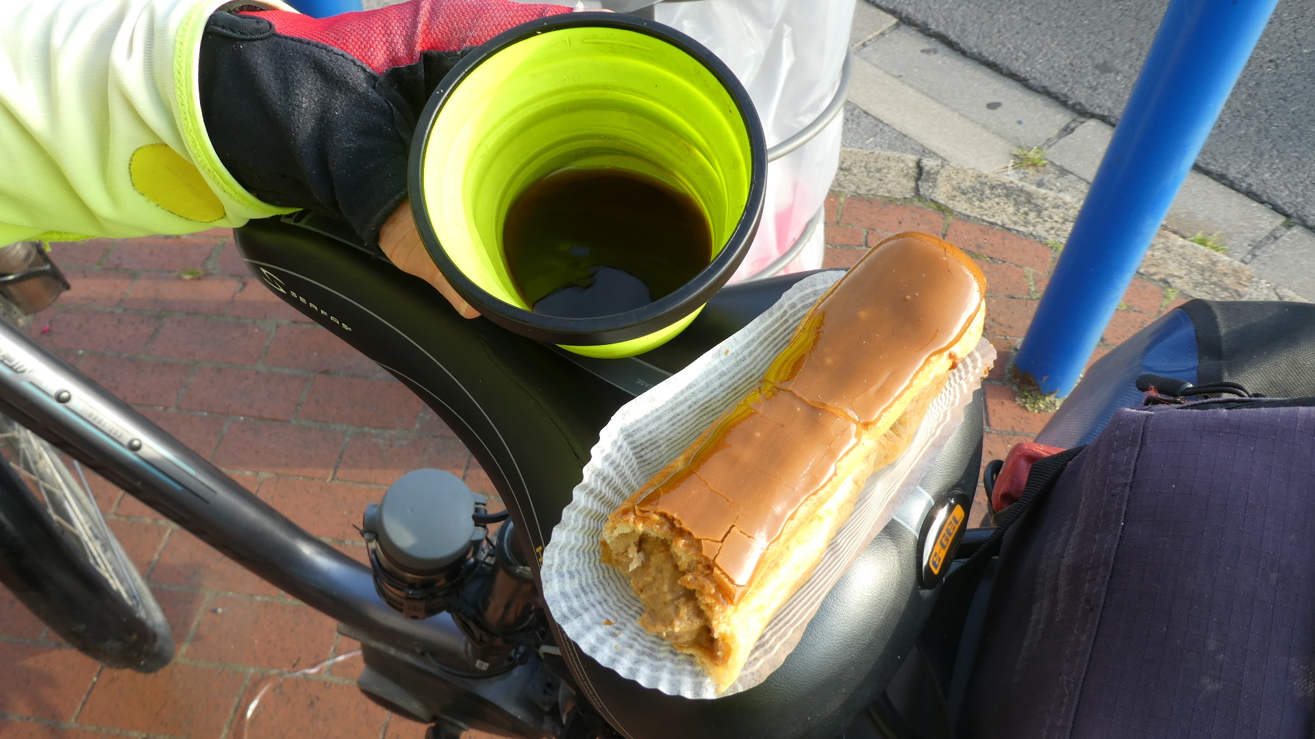 Here is our street as we started out this morning. It is technically in Chauny, which is adjacent to Ognes. You would have to class the towns like this as "unassuming" - kind of typical rural French. But unassuming or not, every town that has some commerce has at least one great bakery. We stopped at one, and picked up the French Breakfast of Champions - chocolate (or in this case, coffee, eclair. Our calling it this does mean that any sensible French person would eat this at breakfast. Only we not sensible tourists are into this.