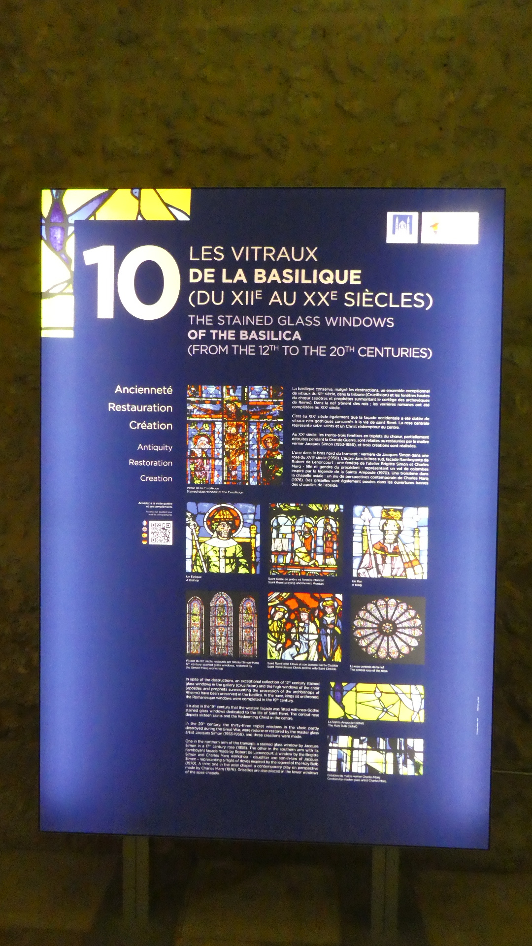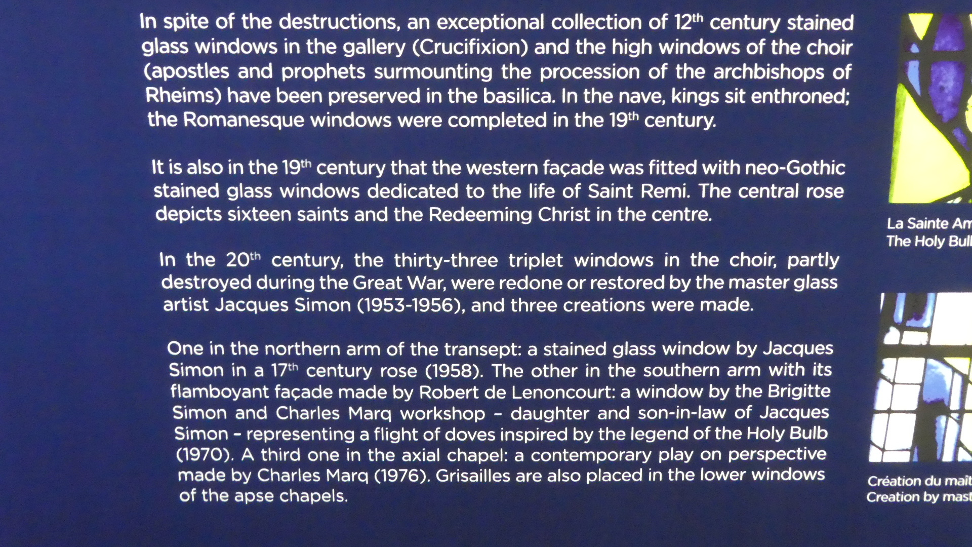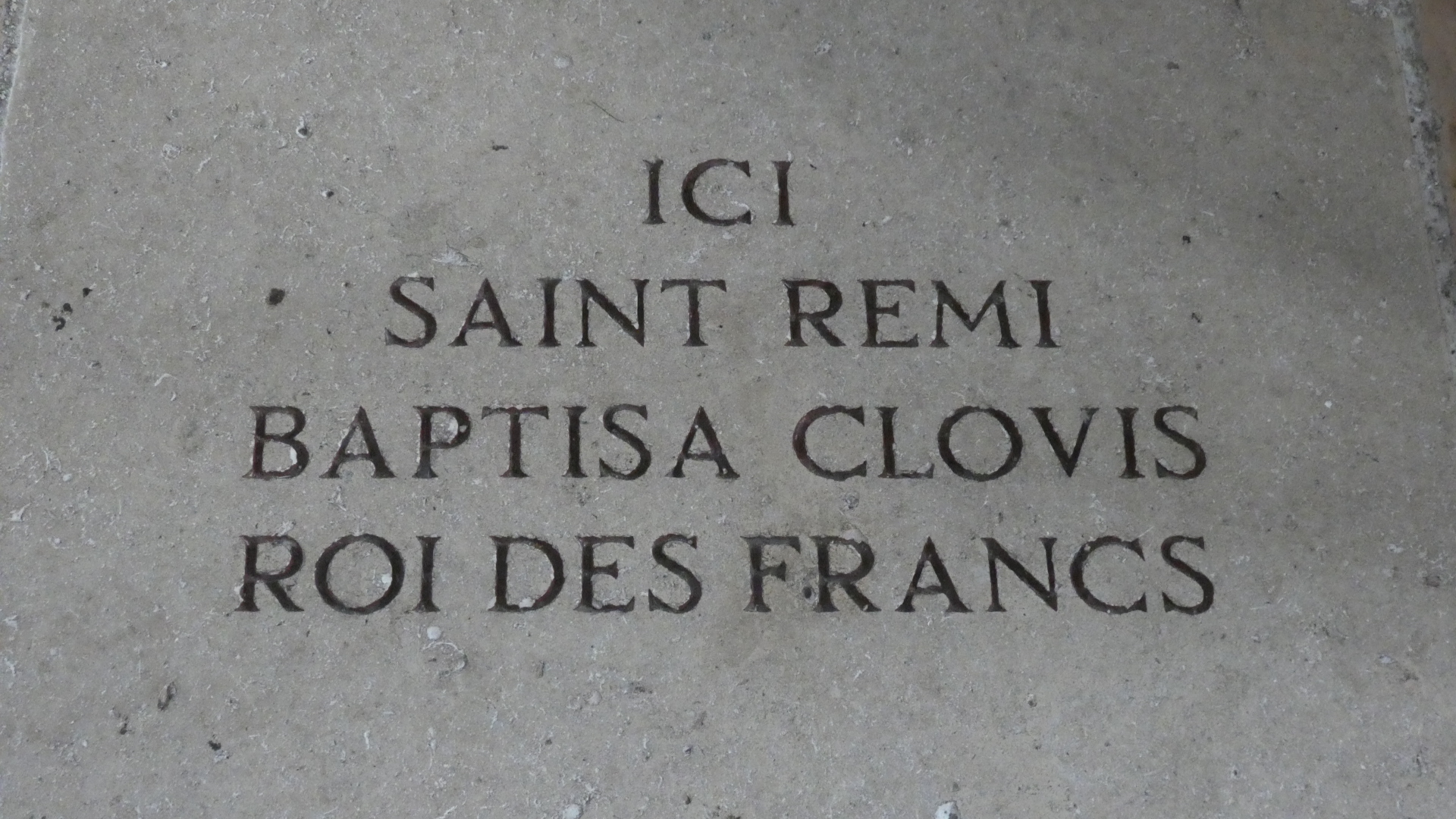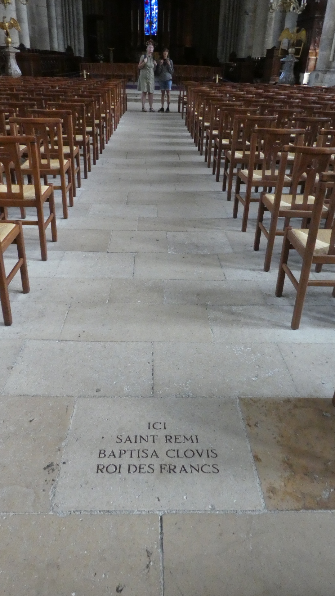 Reims cathedral has been the site of numerous coronations. For example in a really famous one, in 1429 Charles VII was crowned here, in the presence of Joan of Arc. But the one most mentioned (in town tourist literature or posters) is the baptising of 15 year old Clovis, King of the Francs, by Bishop (Saint) Remi, in about 496. The spot for that is marked by a plaque in the floor:
