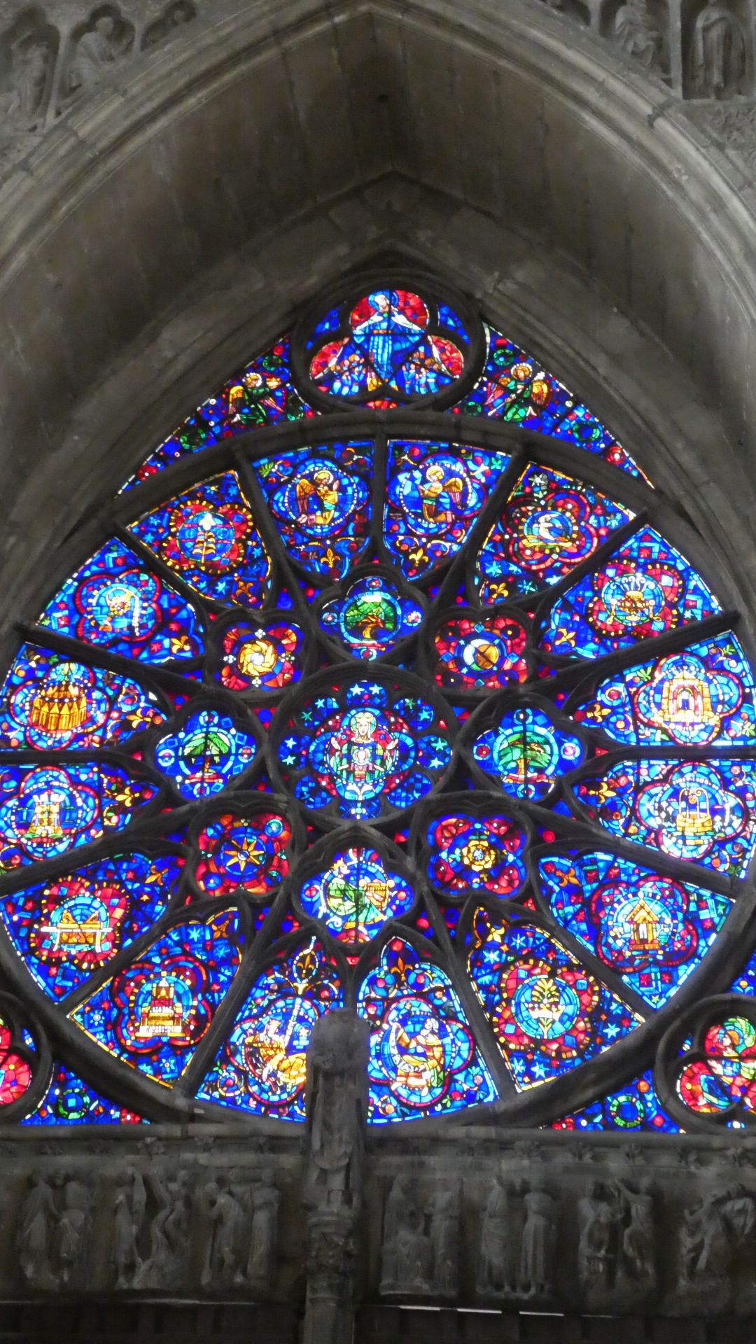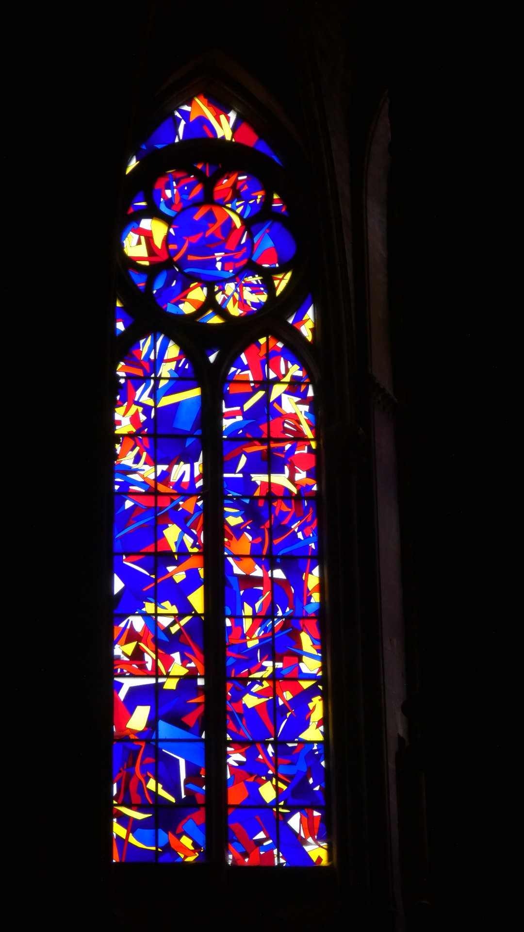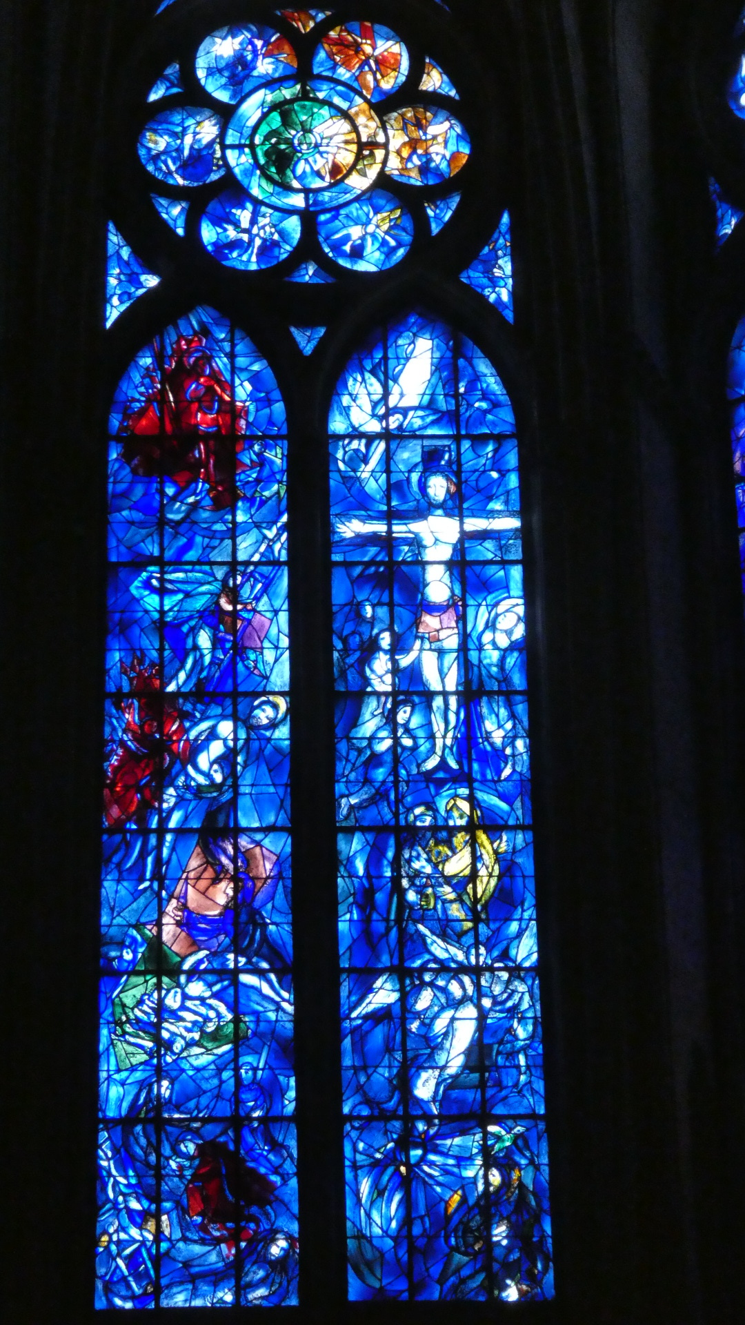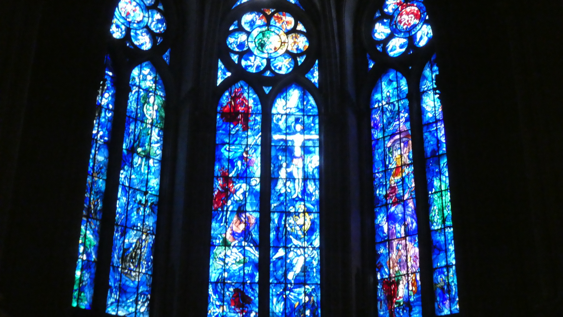 Inside the cathedral another very notable thing is the stained glass work at either end. There are two large rose windows, one from the 13th century and one from 1937, and at the altar end, some major pieces by Marc Chagall (from 1974). We have seen Chagall in other churches too - he likes blue a lot!