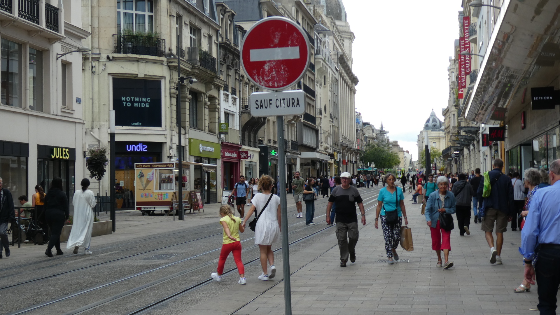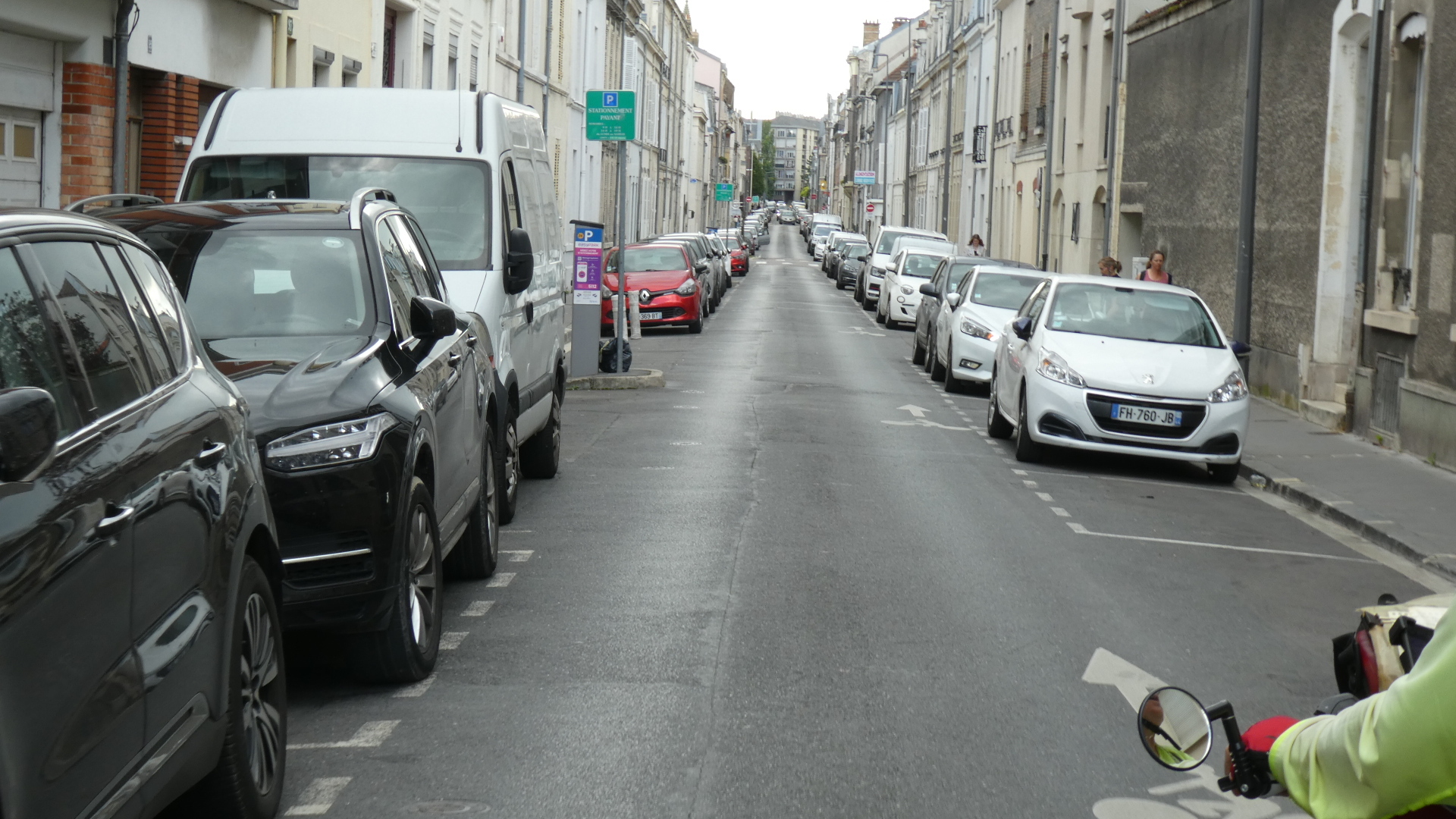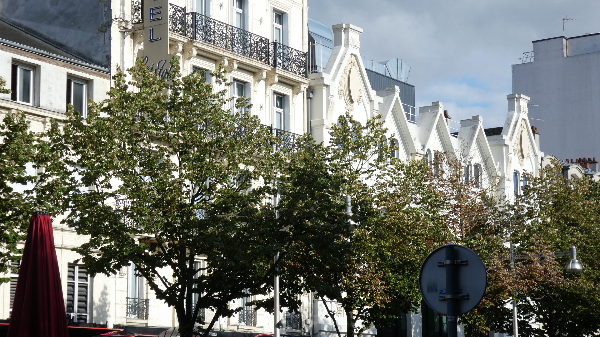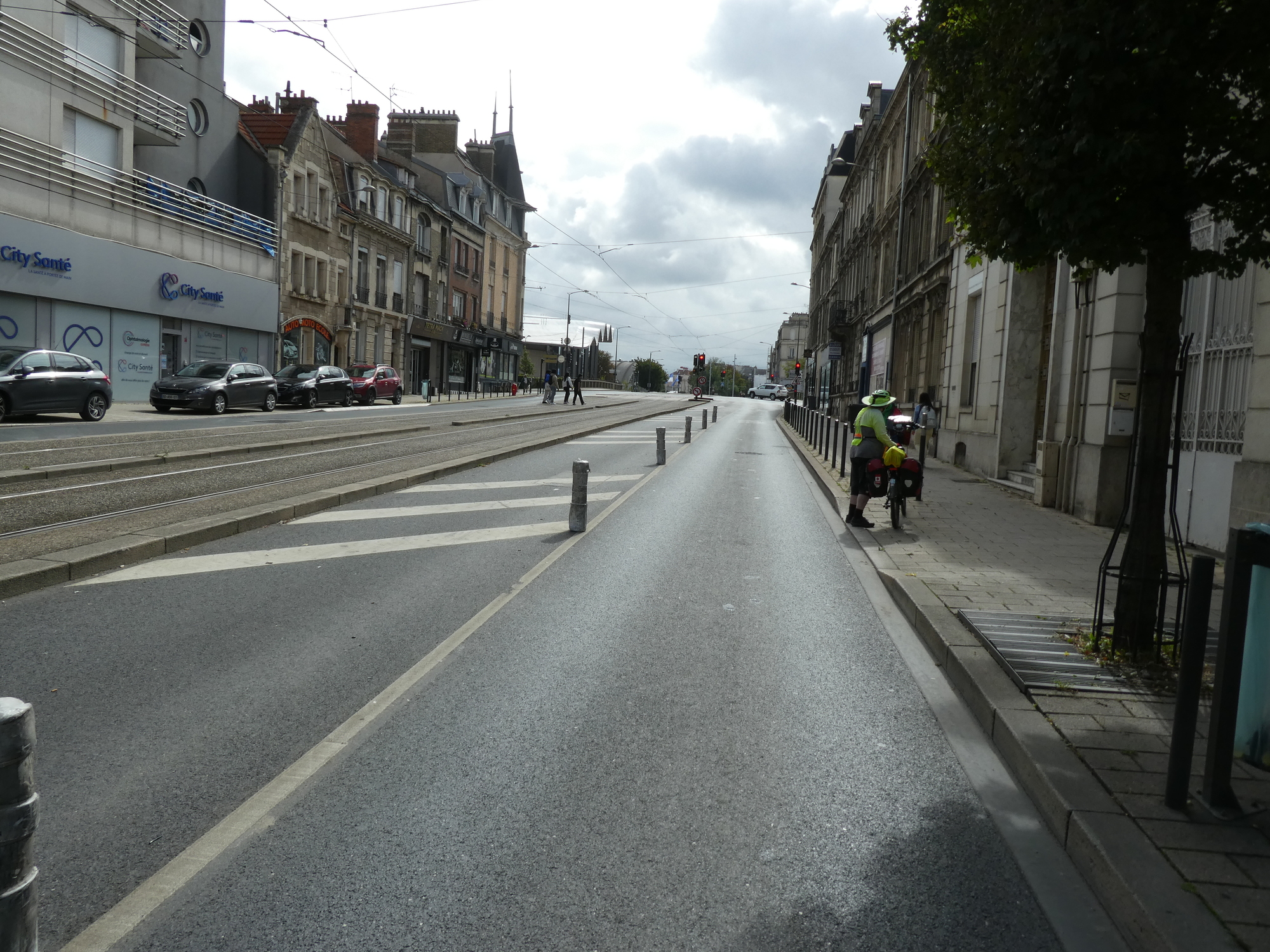 One thing about cycling the farm field was that it was deserted and quiet. But once we arrived at the outskirts of Reims, things changed. Now we had that outskirts of a wonderful old city which are always a horrible phenomenon. Aside from the traffic, noise, and ugliness, we had a road with a tram line in the middle and a parking lane on the right. That left one narrow driving lane, and oops, no place for bikes. Jockeying with the cars in such a case is really wearing!