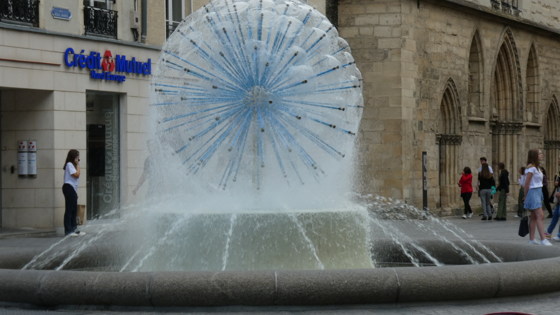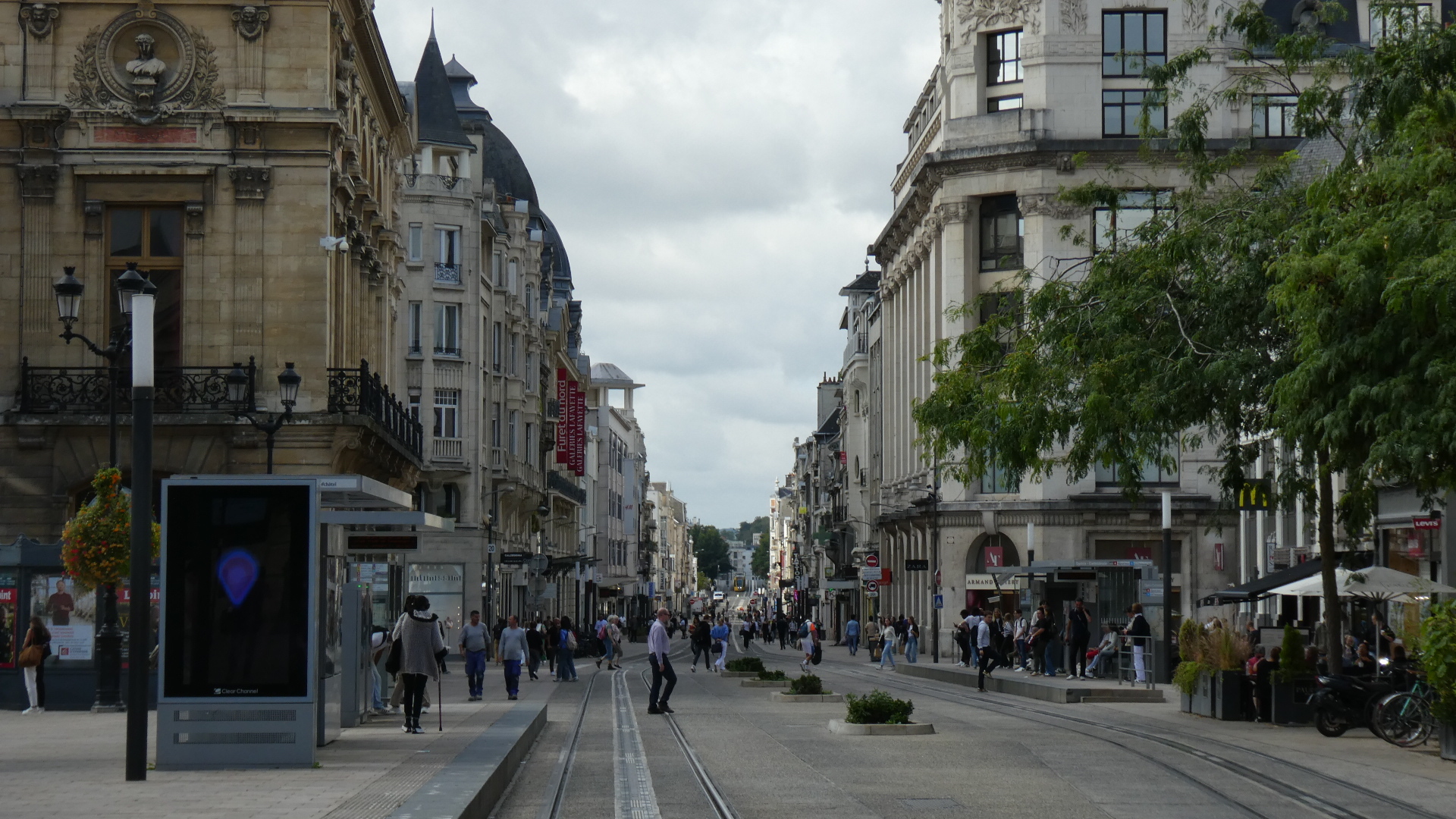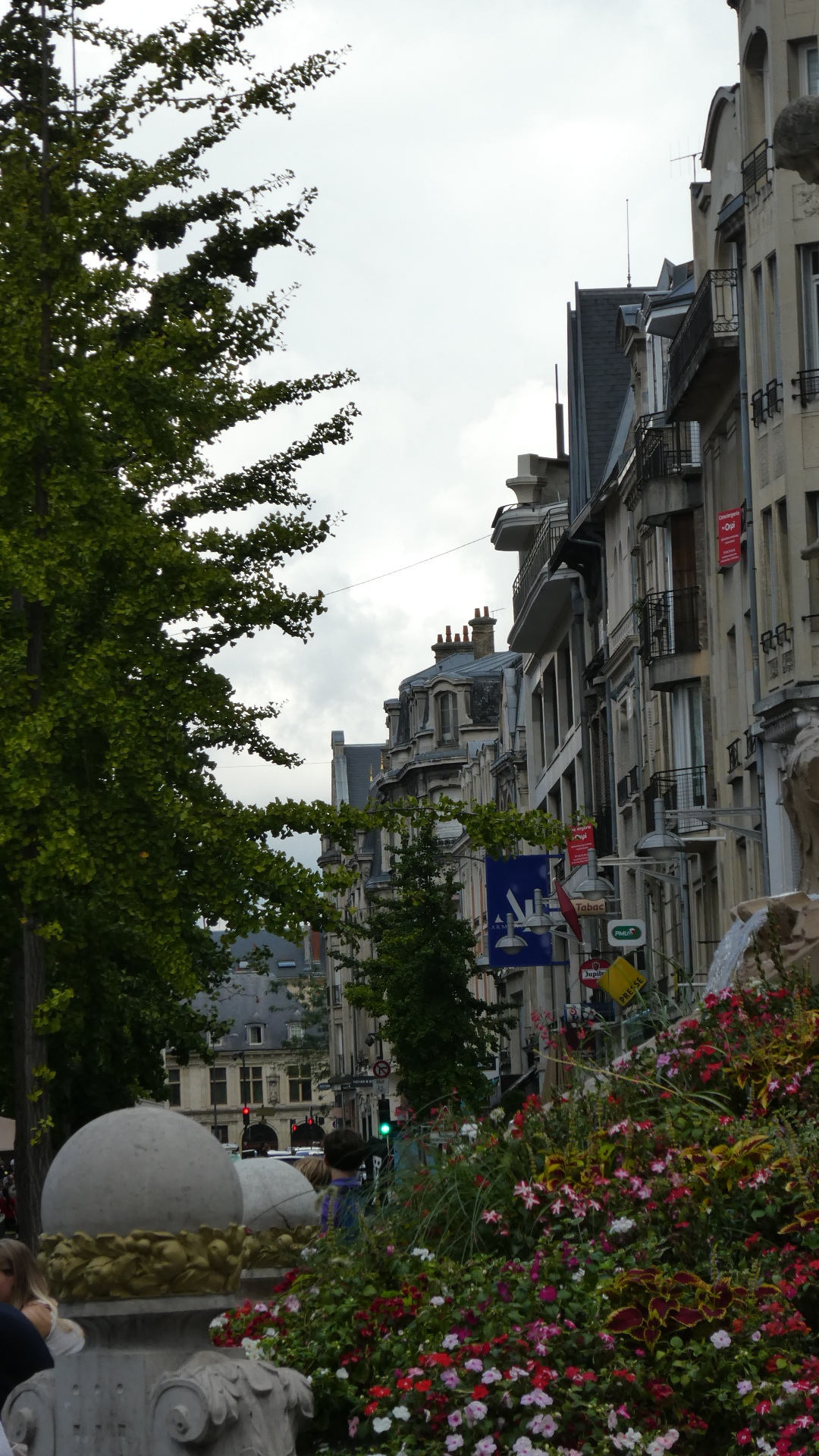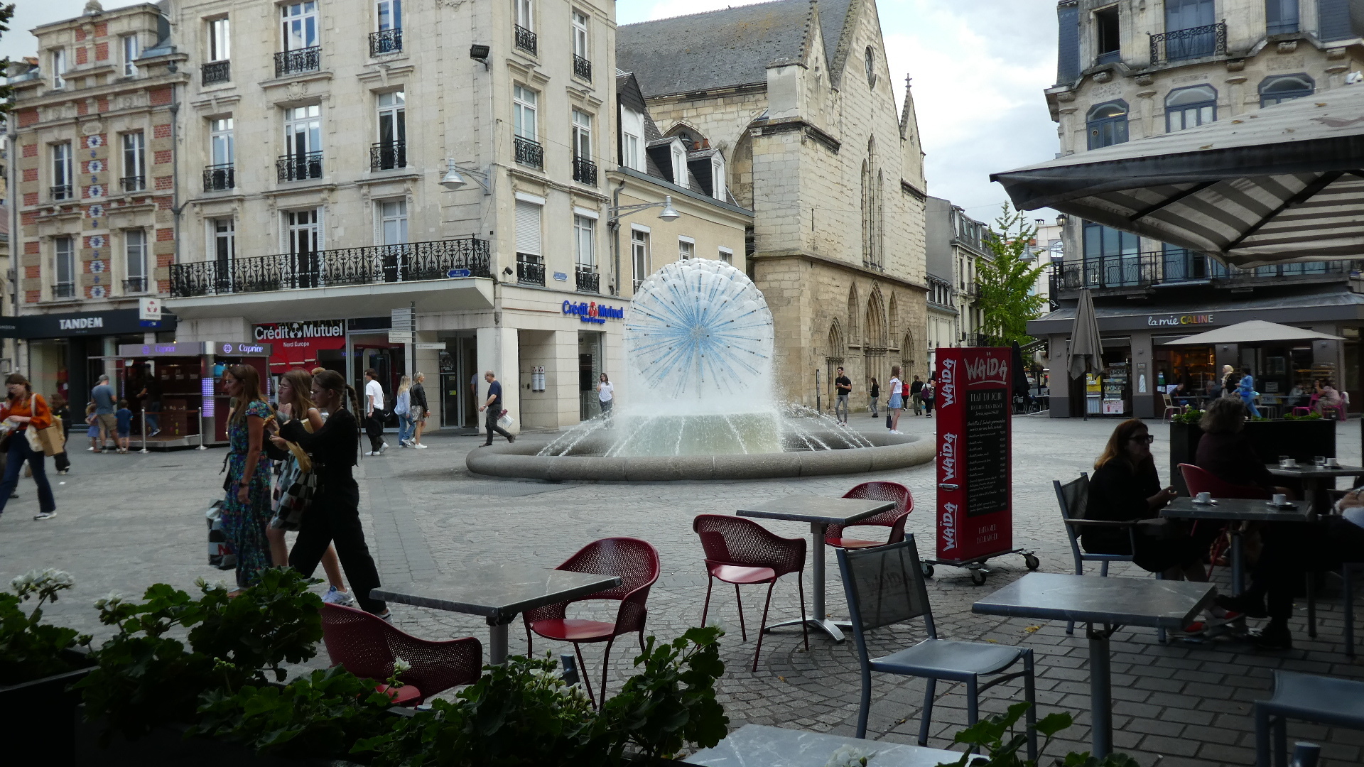 At this point we come to a part of our visit to Reims that we really did not expect. We discovered that the town has a large pedestrian zone, stuffed with exciting shops and restaurants, and surrounded by beautiful buildings. Beautiful people are sitting out at restaurant tables, and the whole population is enjoying itself. At the centre of the area is a large statue, which makes it easy to stay oriented, and a little further on is a very attractive fountain.