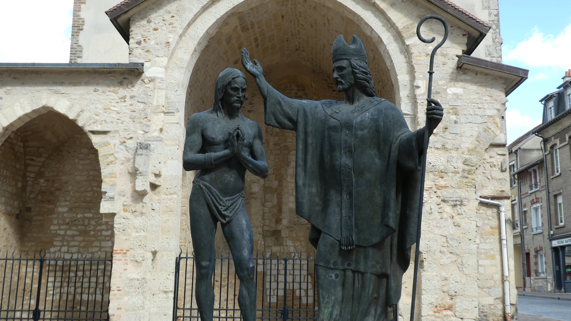 Outside we have a statue depicting the baptism of Clovis by Remi. Clovis sure does not look 15!