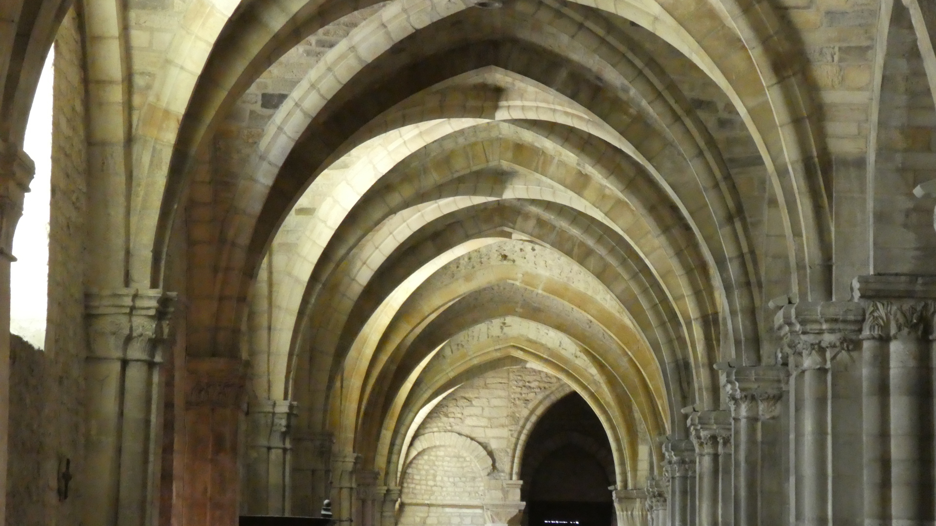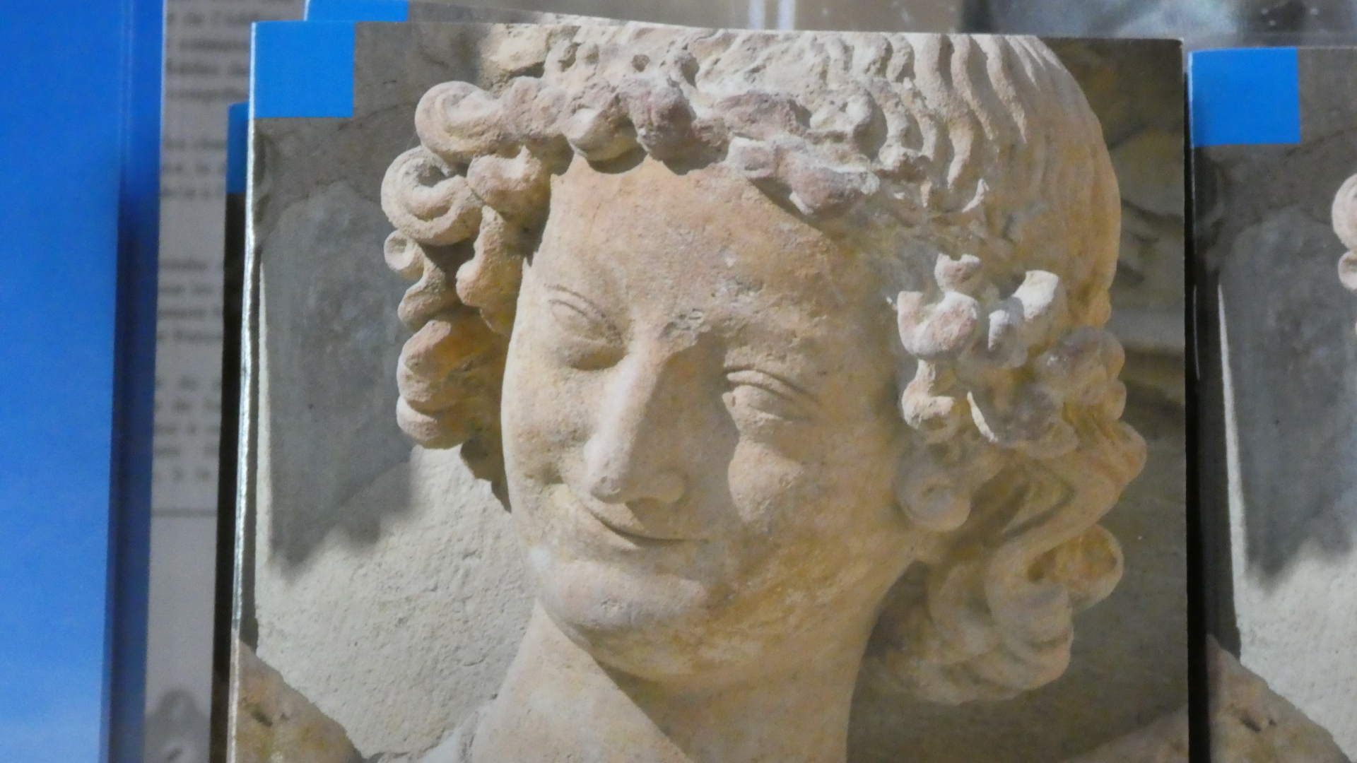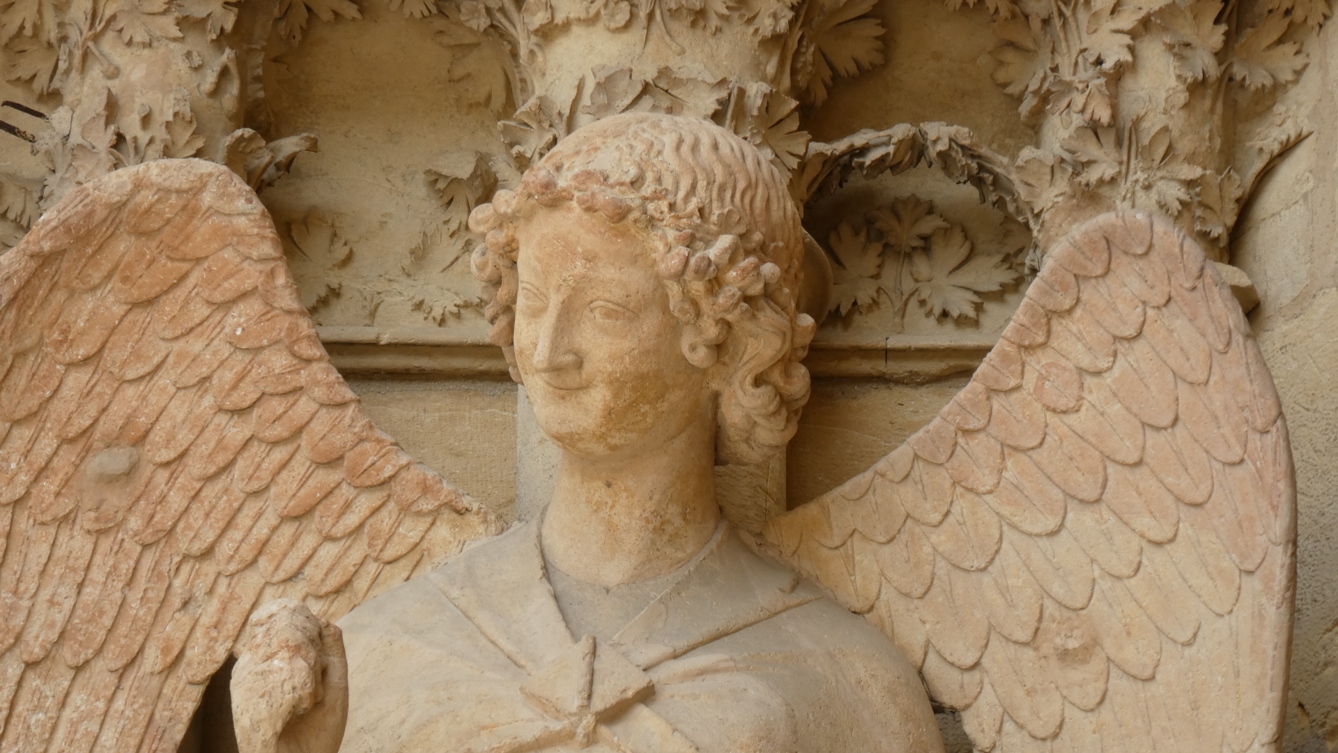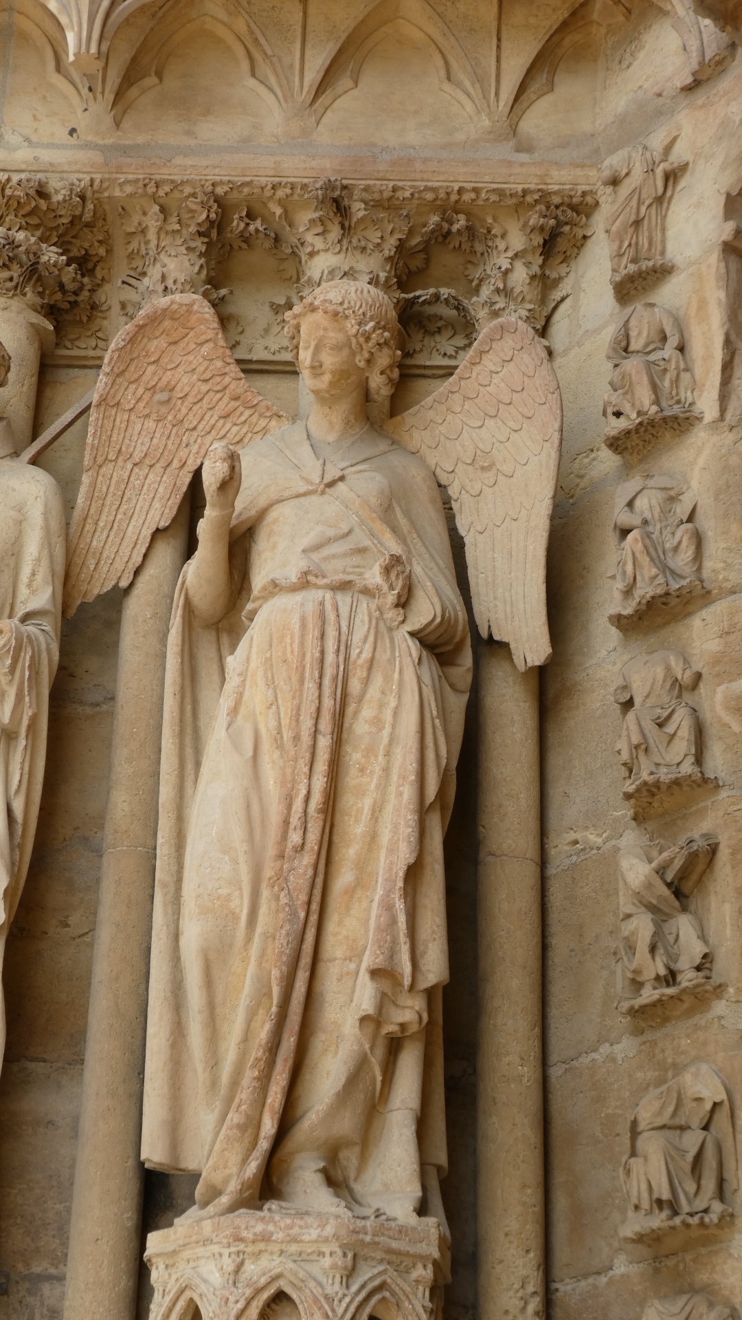 Walking around inside, and especially looking at the souvenir desk, I realized that the "Smiling Angel" was an icon chosen to represent the cathedral. I could see in a pamphlet where she was supposed to be, but I could not spot her. My first reaction was to cheat, and steal an image from a postcard. That's this one: