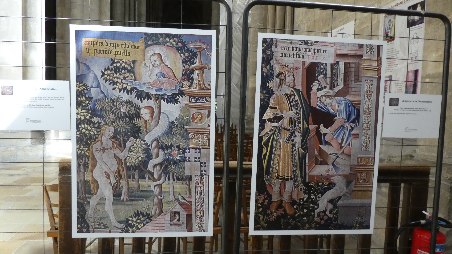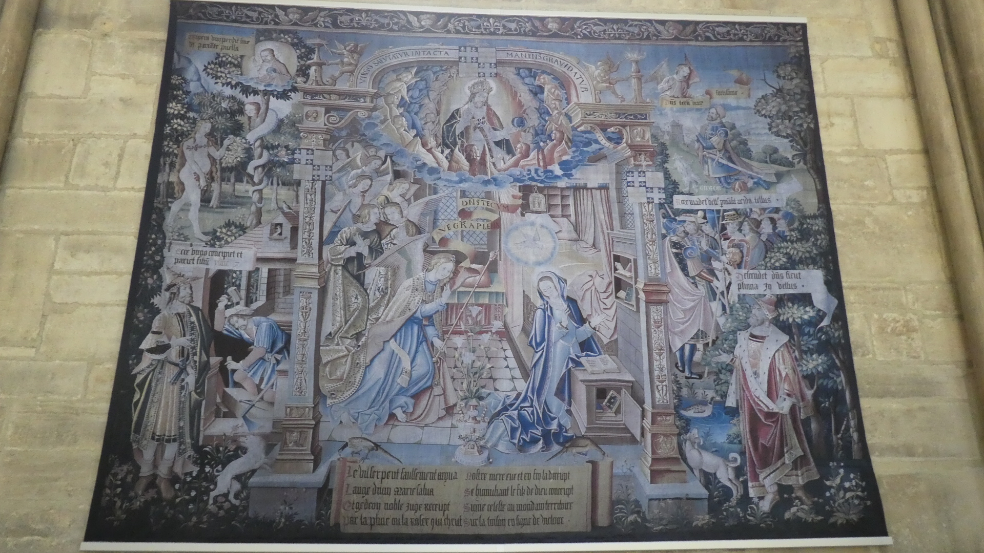 Walking through the building, I noticed this complicated tapestry. discounted it at first, as too detailed to try to figure out. That remains true, but I was chastened to see that every bit of it had been carefully studied, and that sections were featured in their own explanatory posters.