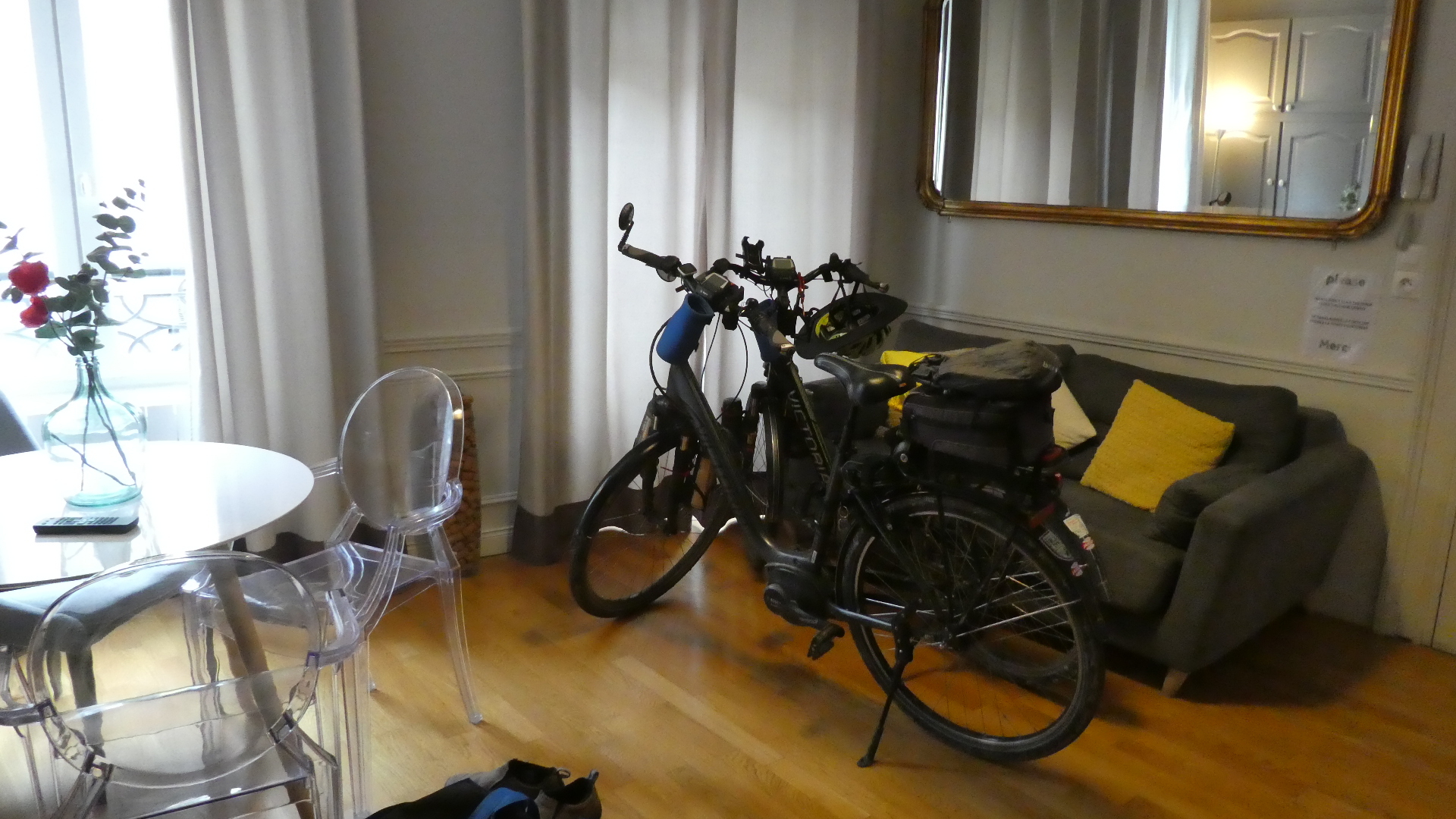 Our apartment (the one found by Booking after our first one cancelled out) was right by the shopping area. Only thing, the owner refused to have bikes inside, and there was no other place for them. As you see, we slightly twisted his arm.