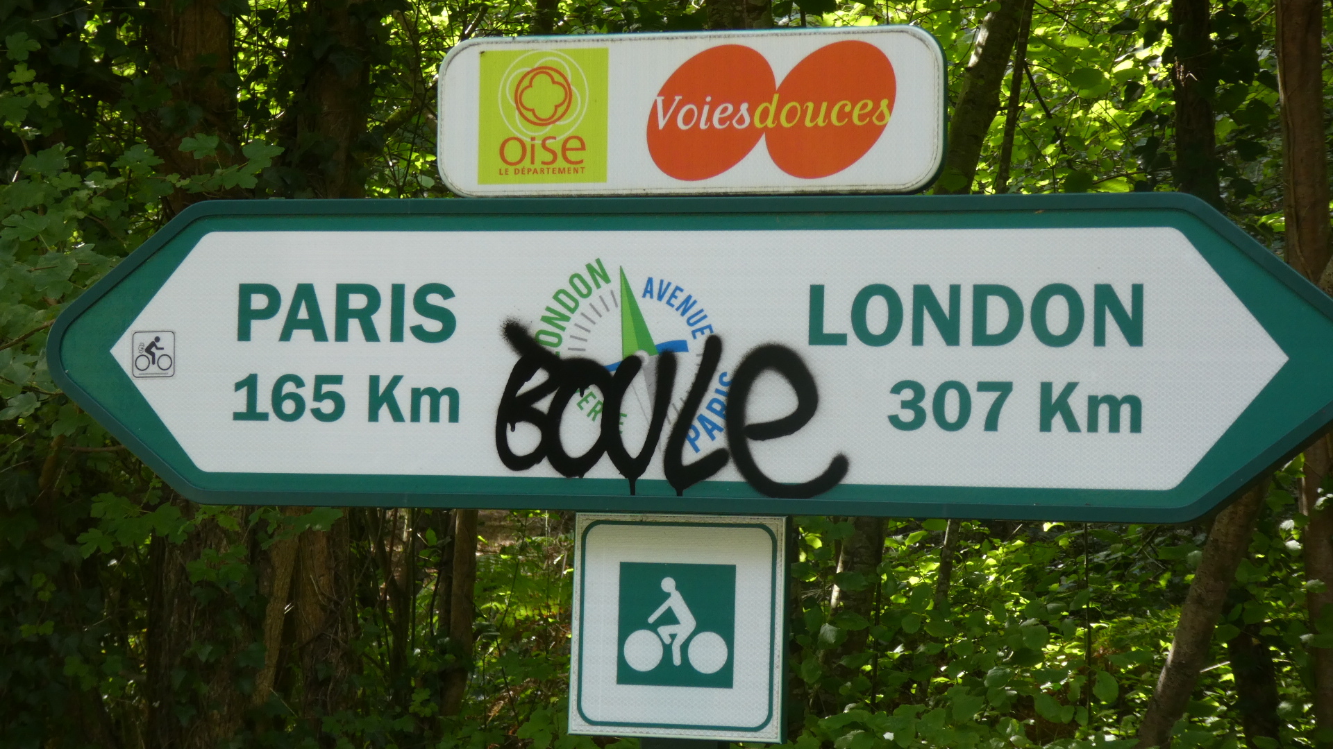 After hours of somewhat stressful line riding, we stumbled onto a bike way. Remarkably, it was called the Trans Oise, and was part of the London to Paris route. Hooray!