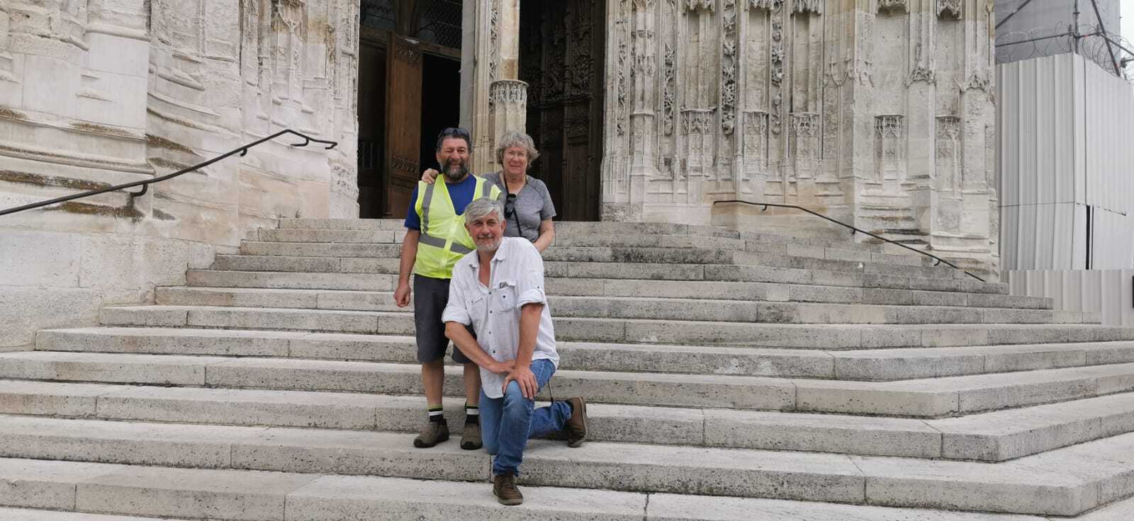 Dodie and Didier mount the steps of Beauvais cathedral. Dodie likes those walking sticks, but is not desperate for a mobility miracle, as at Lourdes in 2017, before the knee surgeries.