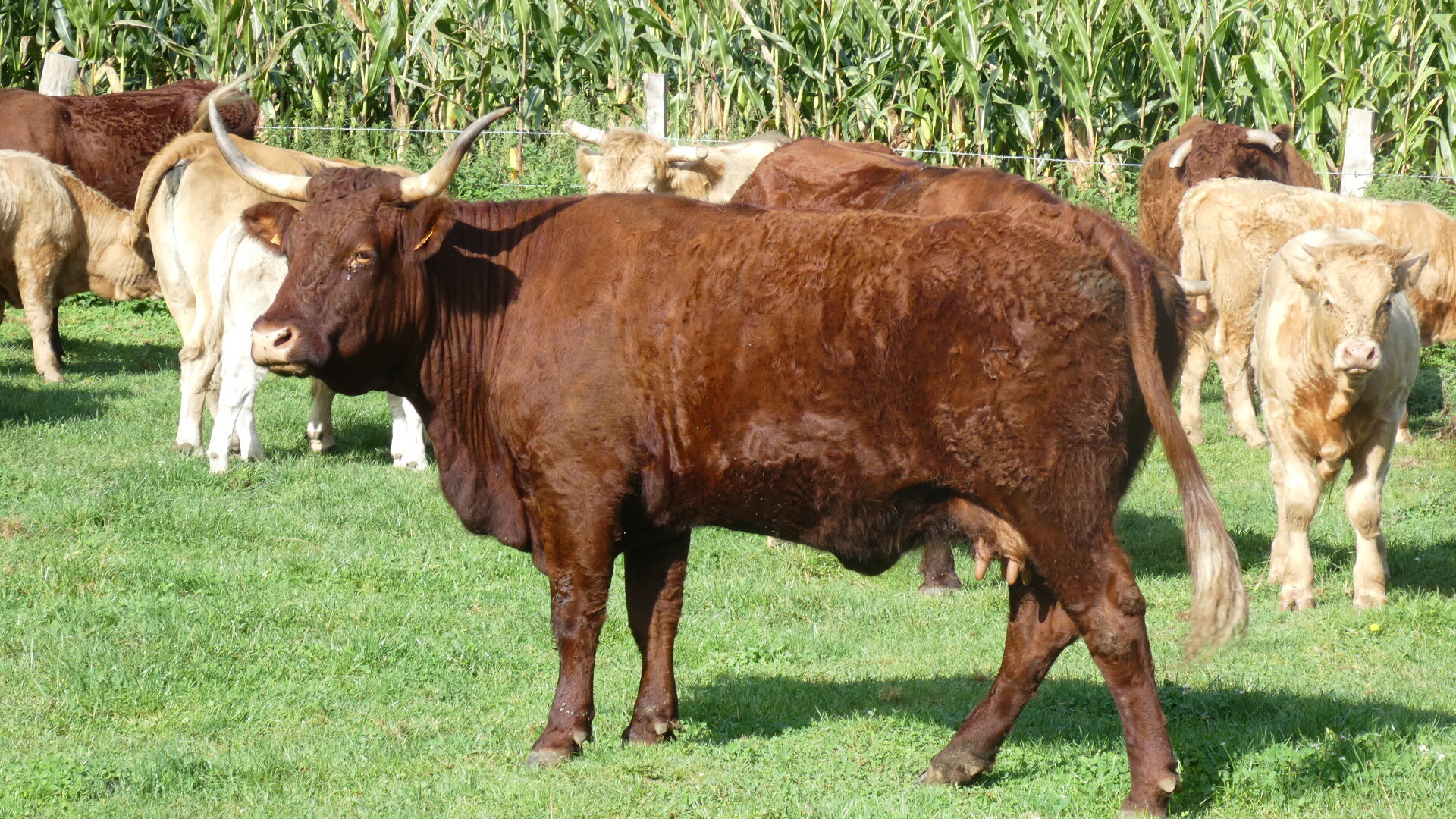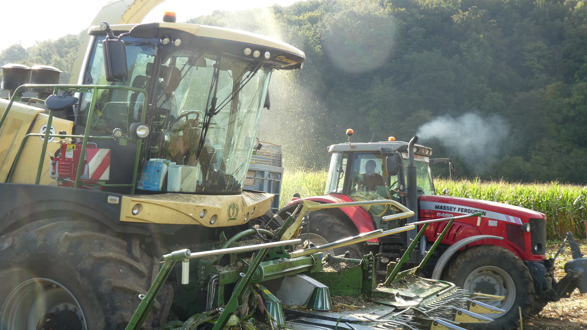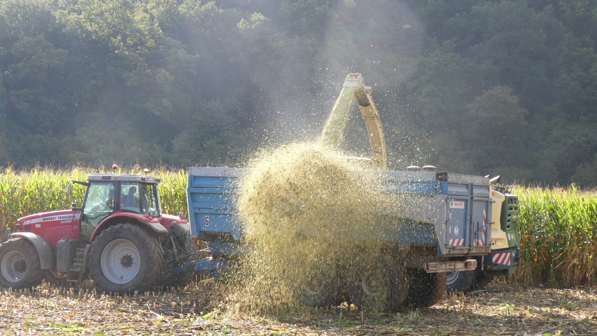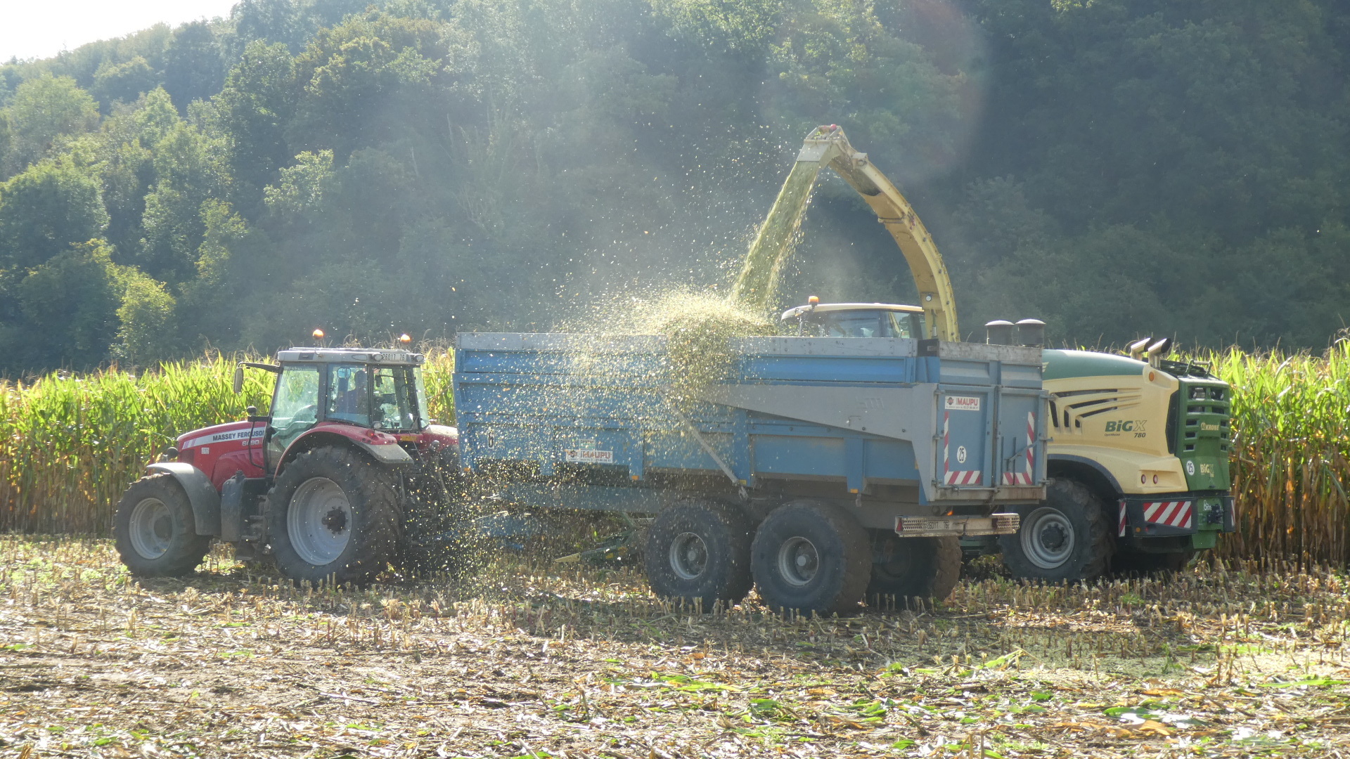 The ride to Rouen started with some climbing that felt significant to us. The track shows it, but it was not all that long, just felt like it for some reason. Once we reached flatter land, there were corn fields. We know these of course to be "cow corn", so no use sampling any. We were interested to see a way of harvesting it we had not known of before. Rather than cutting the stalks, extracting the cobs and then the kernels, the whole plants were being unceremonially ground up and blasted into the large wagons pulled by tractors. In this form we expect it could be made into cow feed in a silo or plastic wrap, but maybe it is destined for ethanol production.