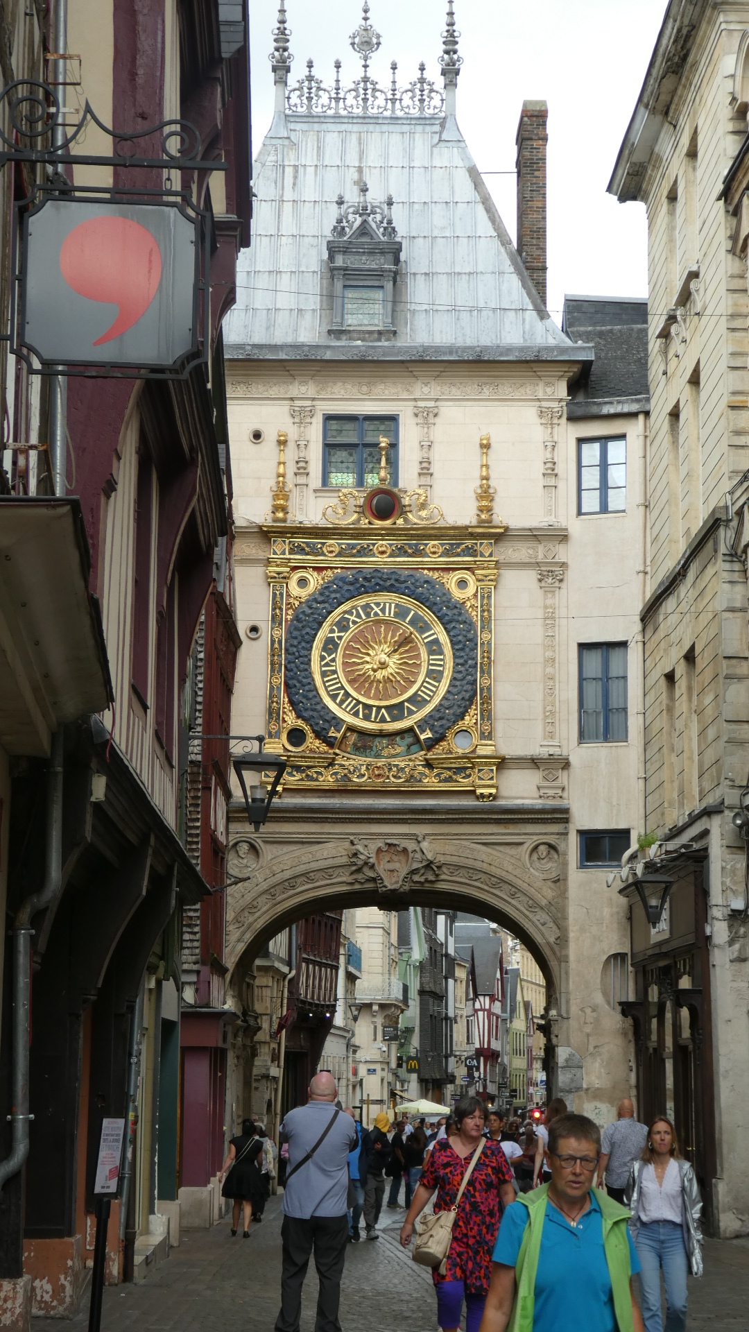 The cathedral was closed until 2 o'clock, so we moved along to another of the main sights in town, the Gros Horloge (big clock). This has a movement from 1447, and was installed here in its own special building in 1527. I did not quite spot a minute hand - will have to check on that. But from the hour hand, it was about 1:30. The hotel lady had said not to do the bikes until 3:00, but it was now raining a lot and we had to go back to at least get our rain coats.