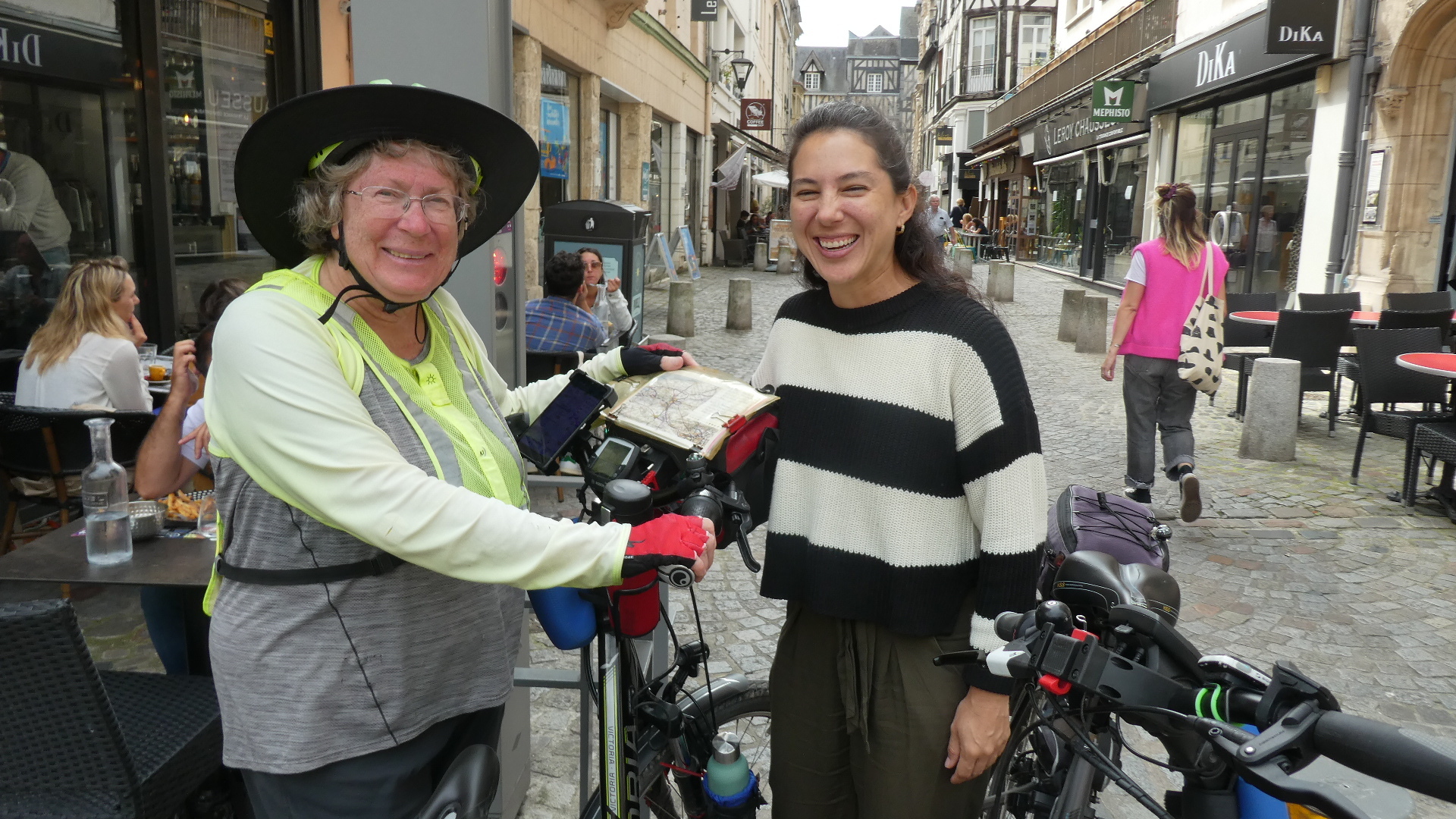 While I was dragging some of our bags up the stairs, Dodie stayed down with the bikes. There she made the acquaintance of Lorena, a Brazilian journalist for a sports magazine. She said they are always on the lookout for inspiring sports stories, like maybe 75 year olds cycling across Europe! Perhaps we will soon have a Brazilian following on Cycleblaze!