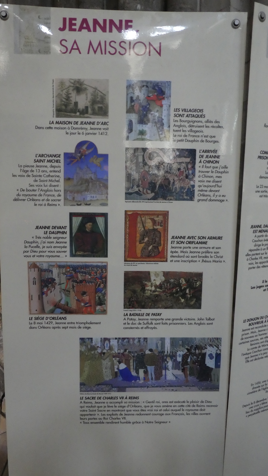 The image of Jeanne d'Arc portrayed by the statue in the cathedral seemed different from the usual portrayal. Here are shots of two photos that are on the surrounding panels.