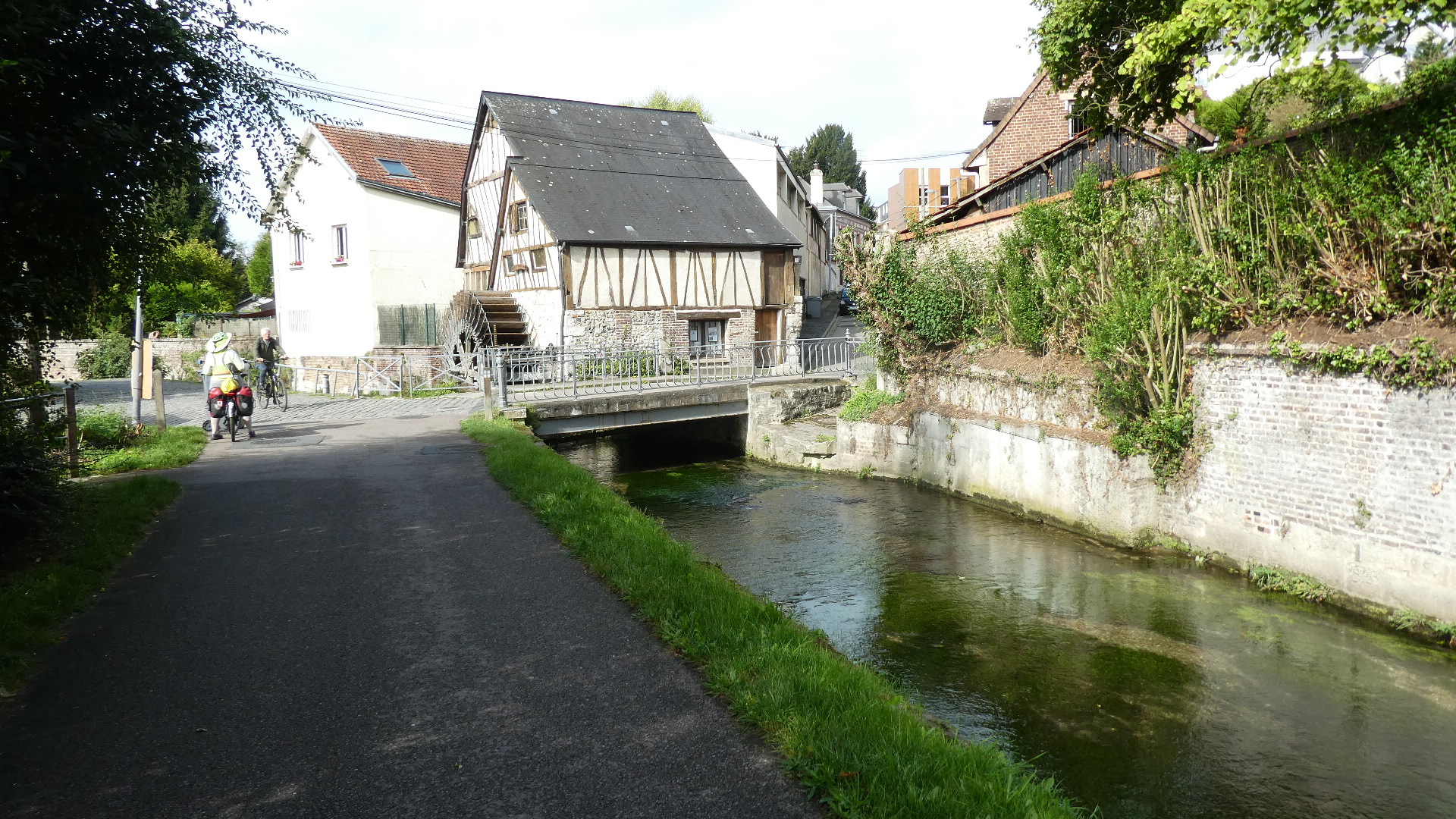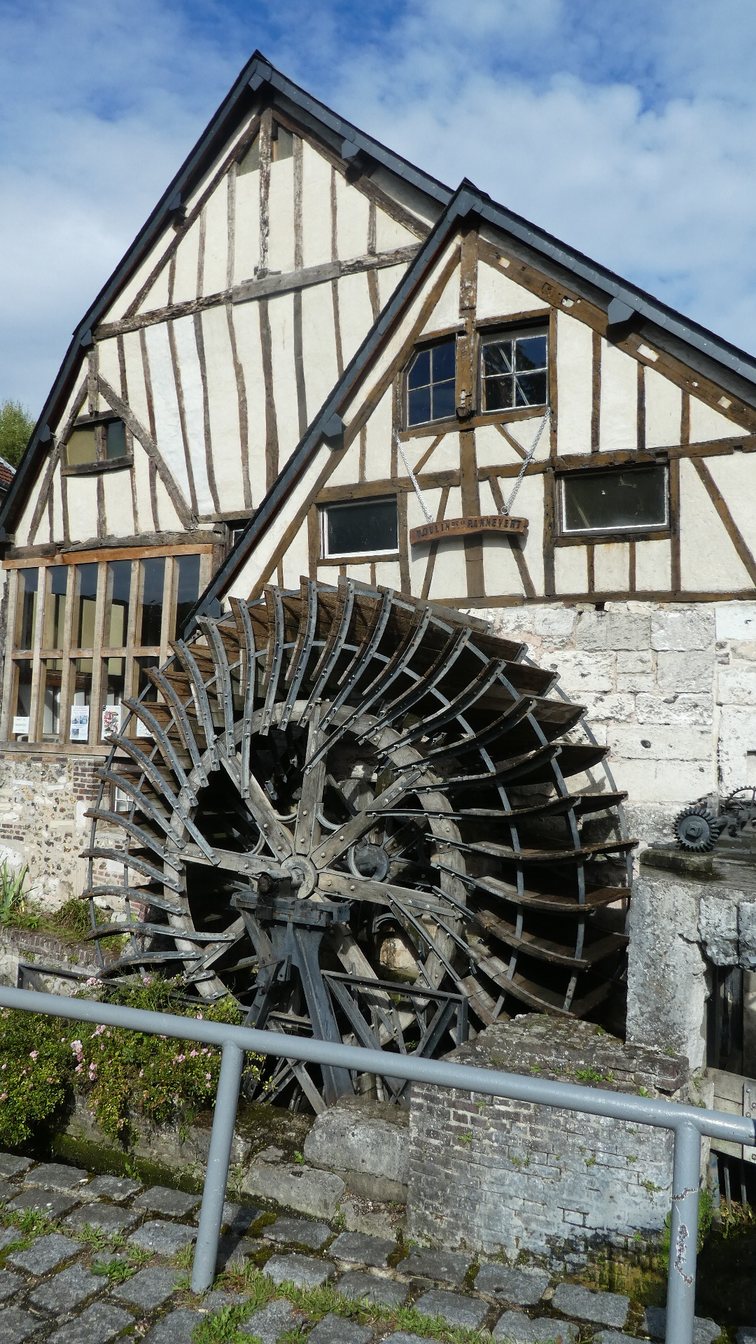For a while our route into town ran beside a little stream called La Clerette. In medieval times this supported several mills, remnants of which can still be seen today. The one below is moulin Pannevert. A mill at this site has been recorded as early as 1199, and the present structure might date from 1587. No, the name Pannevert is from then, the present building is 19th century. Flour production happened here as late as 1878.