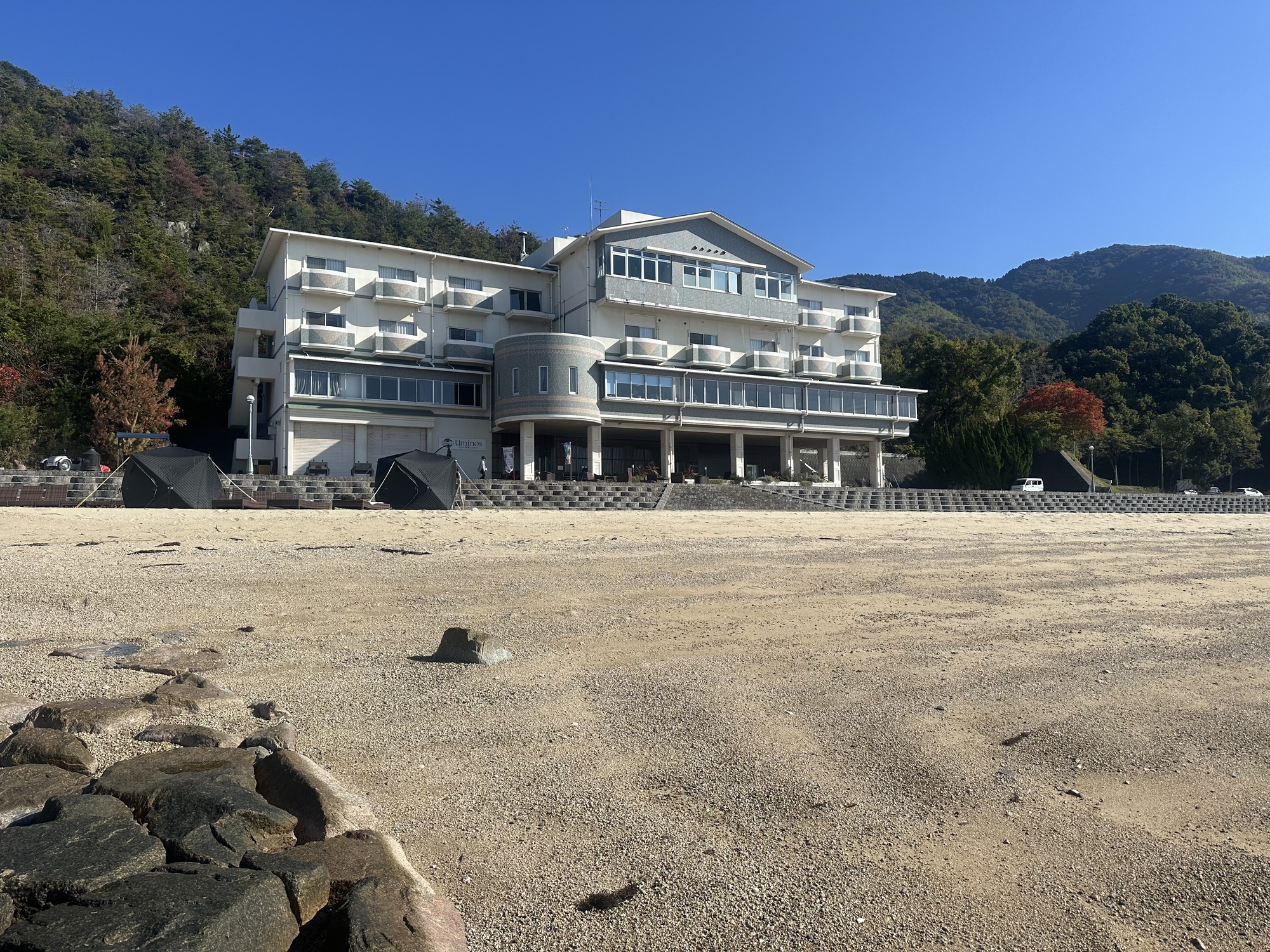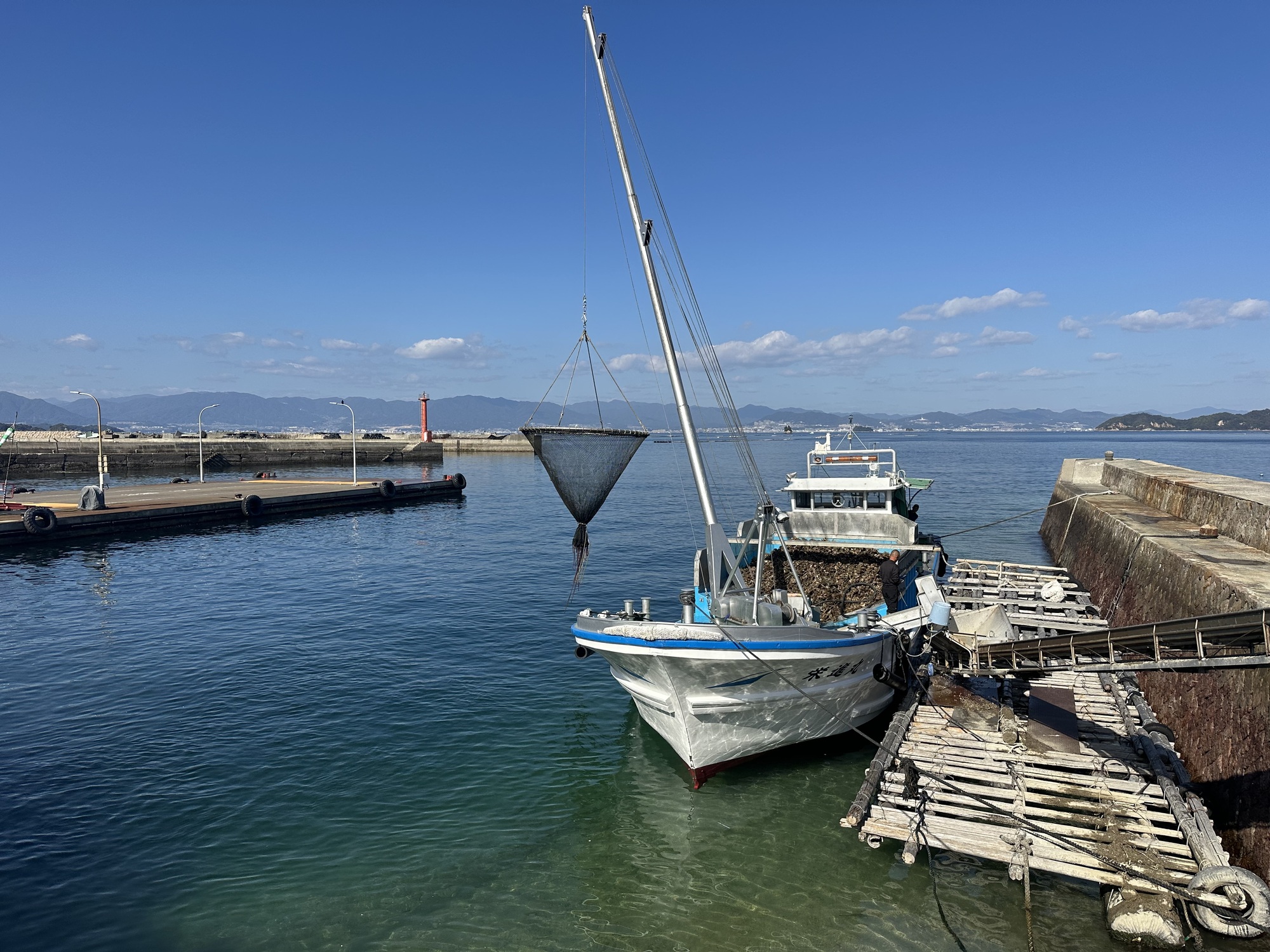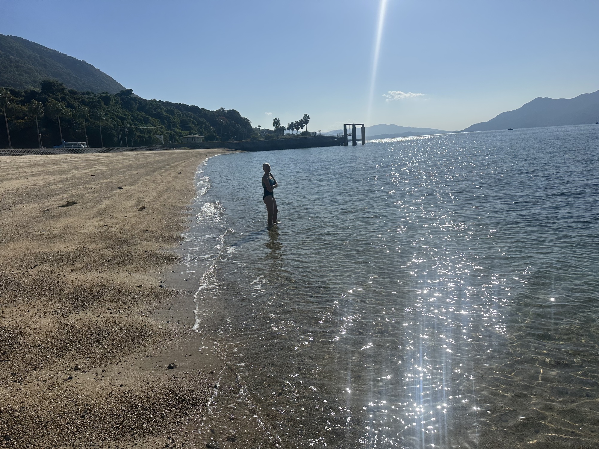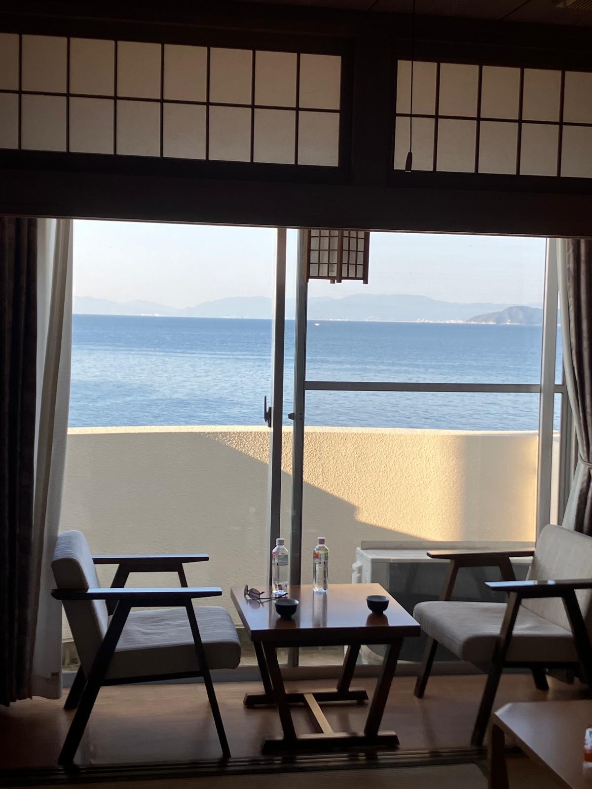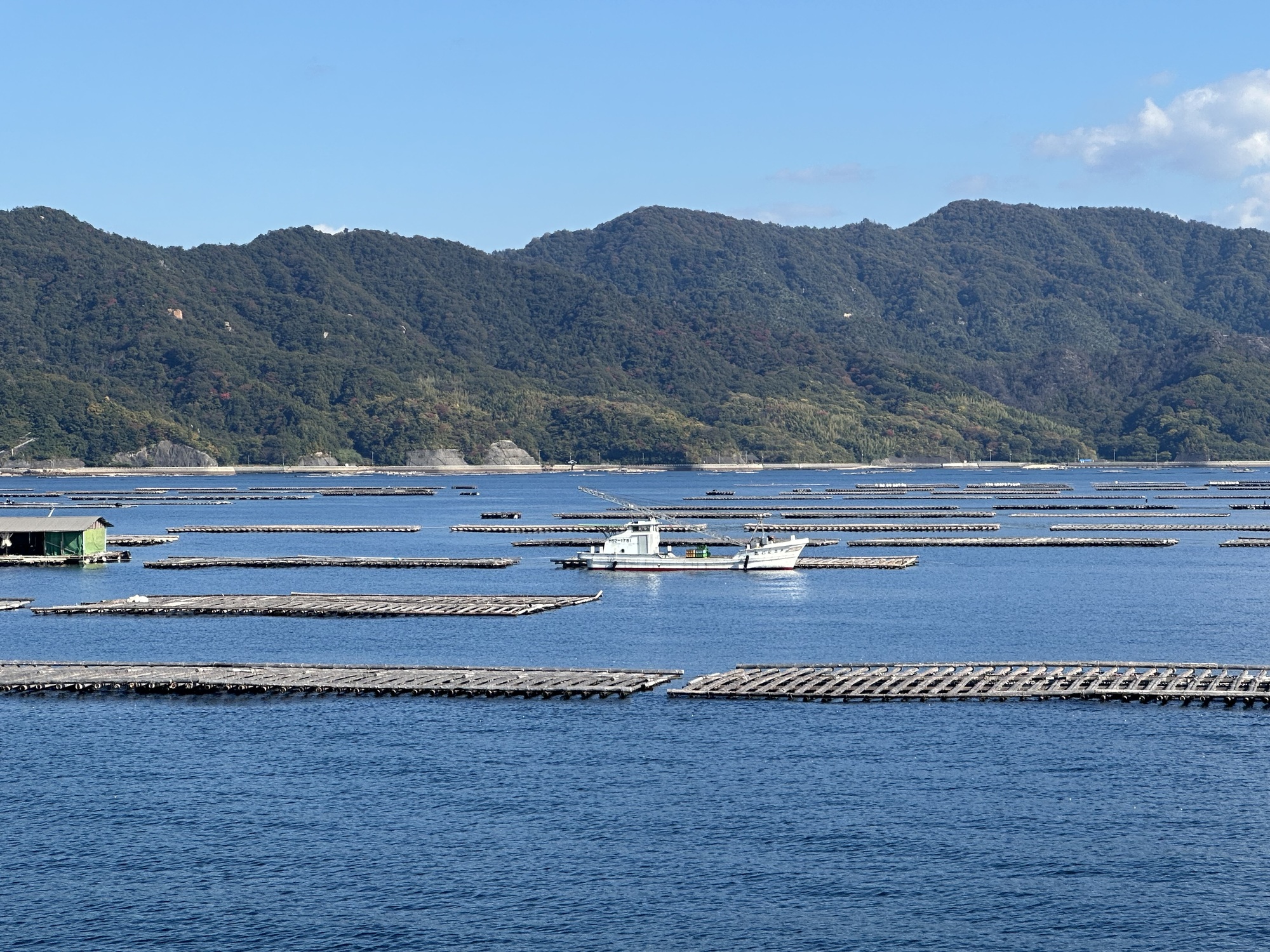 The ferry terminal, when we arrived, turned out to be slightly larger than the one in Munakata— but not by much. However, it had a cafe offering smoothies, which we took advantage of as soon as we’d navigated the automated ticket machine (no one to help us this time, but the lady in Munakata had given such excellent guidance the other day we felt confident in managing it unaided).