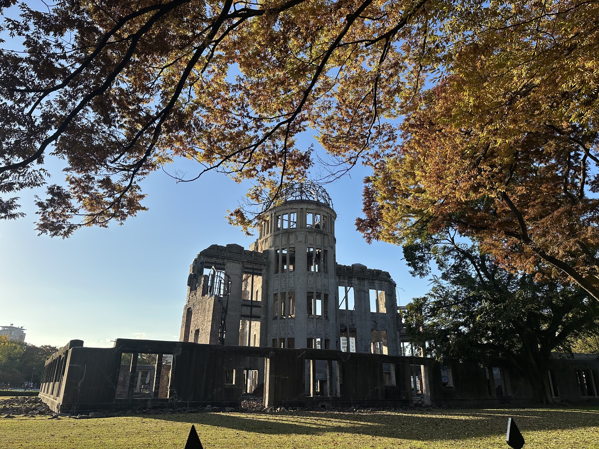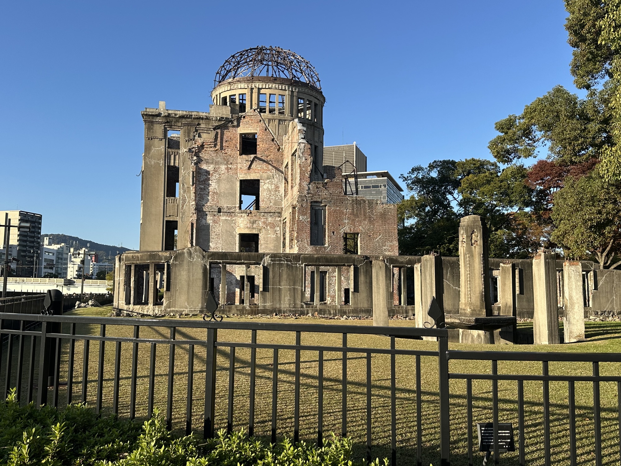 After locating our hotel and stashing the bikes away in a nearby overnight bike parking lot, we headed back out to make the most of the sunny afternoon and see the sights. Which of course are not all that sunny in nature. The riverside promenade, thronged with foreign tourists, is dotted with historical monuments and artifacts documenting the devastation of the city by the bombing. It culminates in the Atomic Bomb Dome, which is very dramatic and affecting.