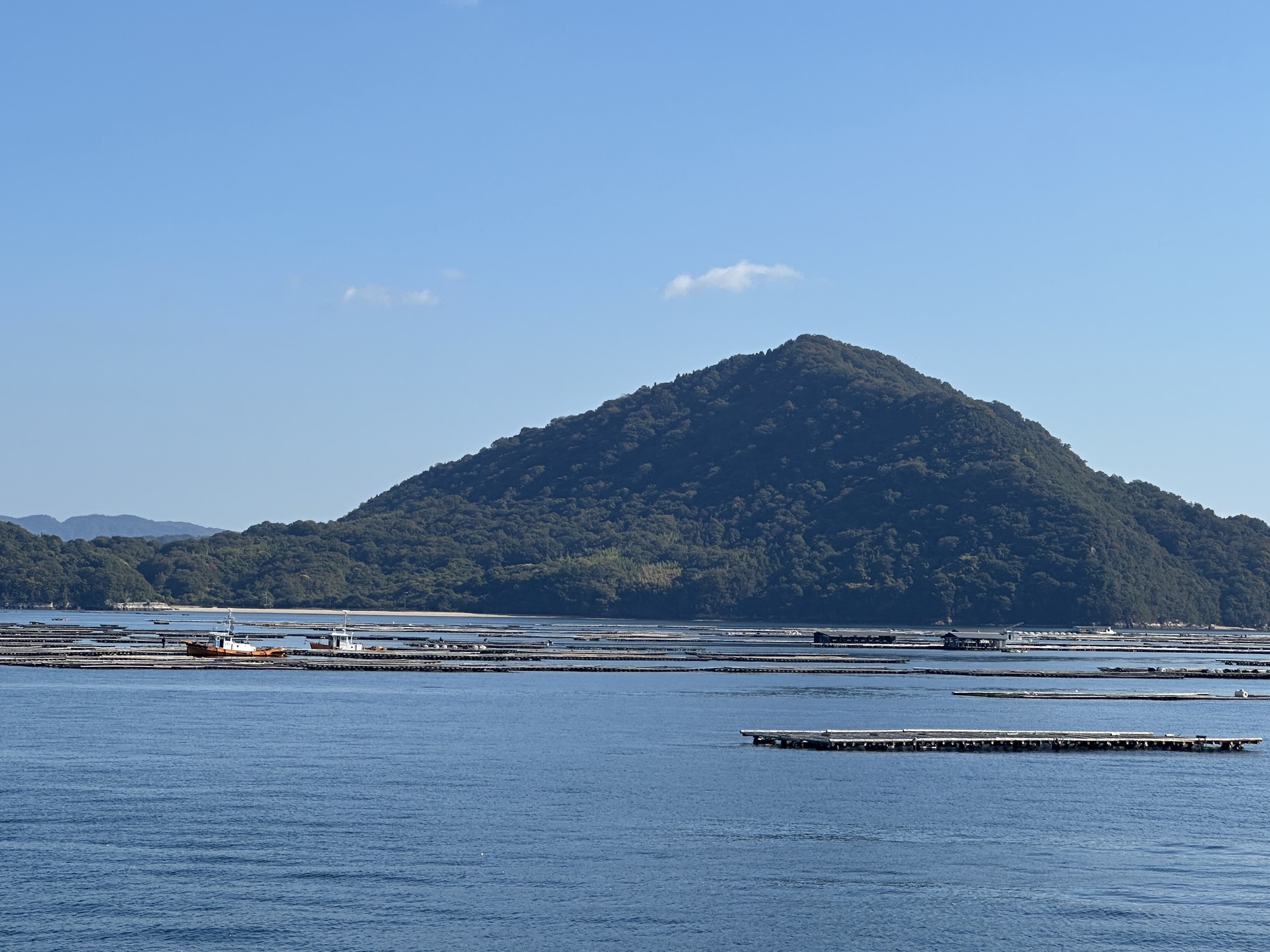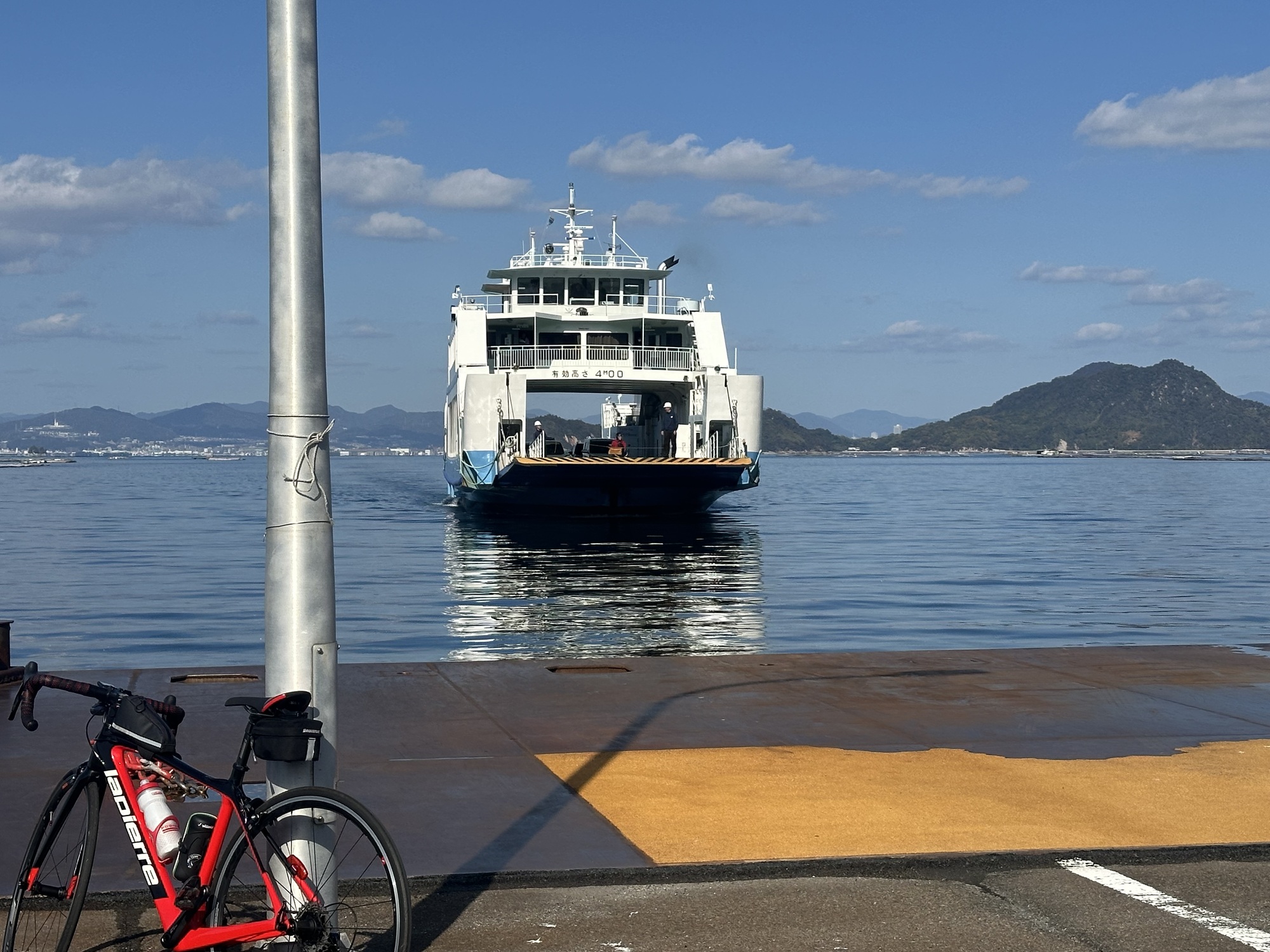 Our third ferry ride in as many days was another short, sunny, scenic journey (hint: there’s a much longer ferry ride coming up in a few days). Again, it was almost empty, with only about 4 cars as well as four other cyclists—Japanese riders returning from a morning ride on the island—and a few foot passengers. Coming from BC, where the news is always full of dire warnings about the financial health of the provincial ferry corporation, we’ve been marveling at Japan’s ability to keep these very small, very lightly used ferry routes going, with such frequent sailings.