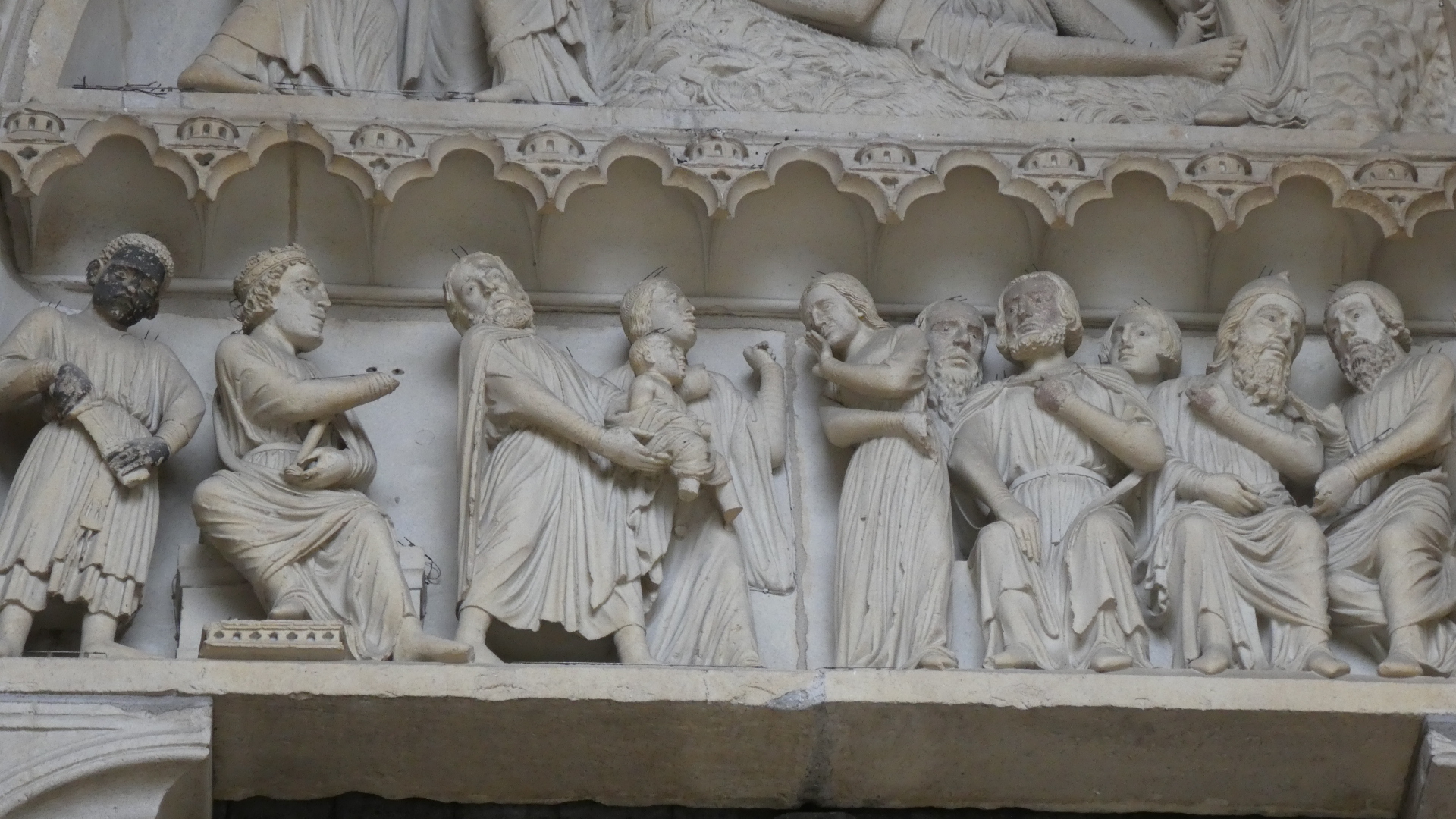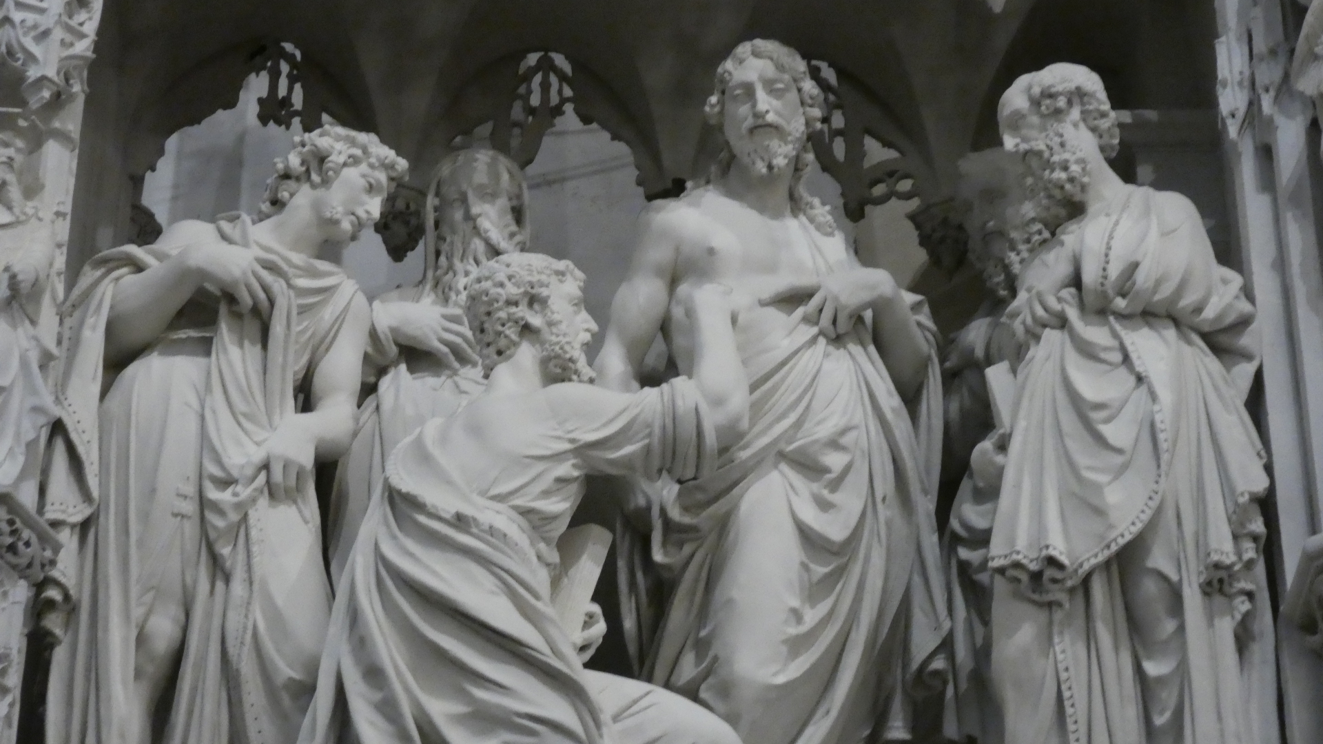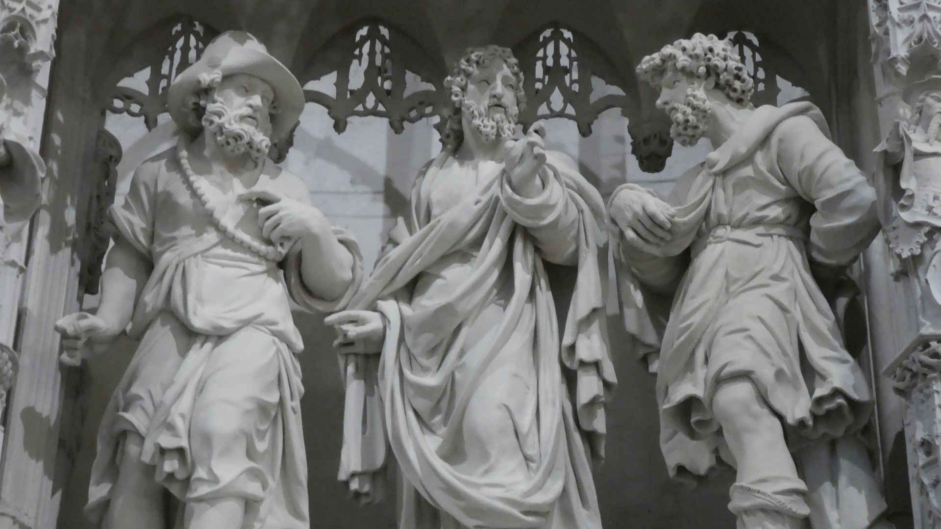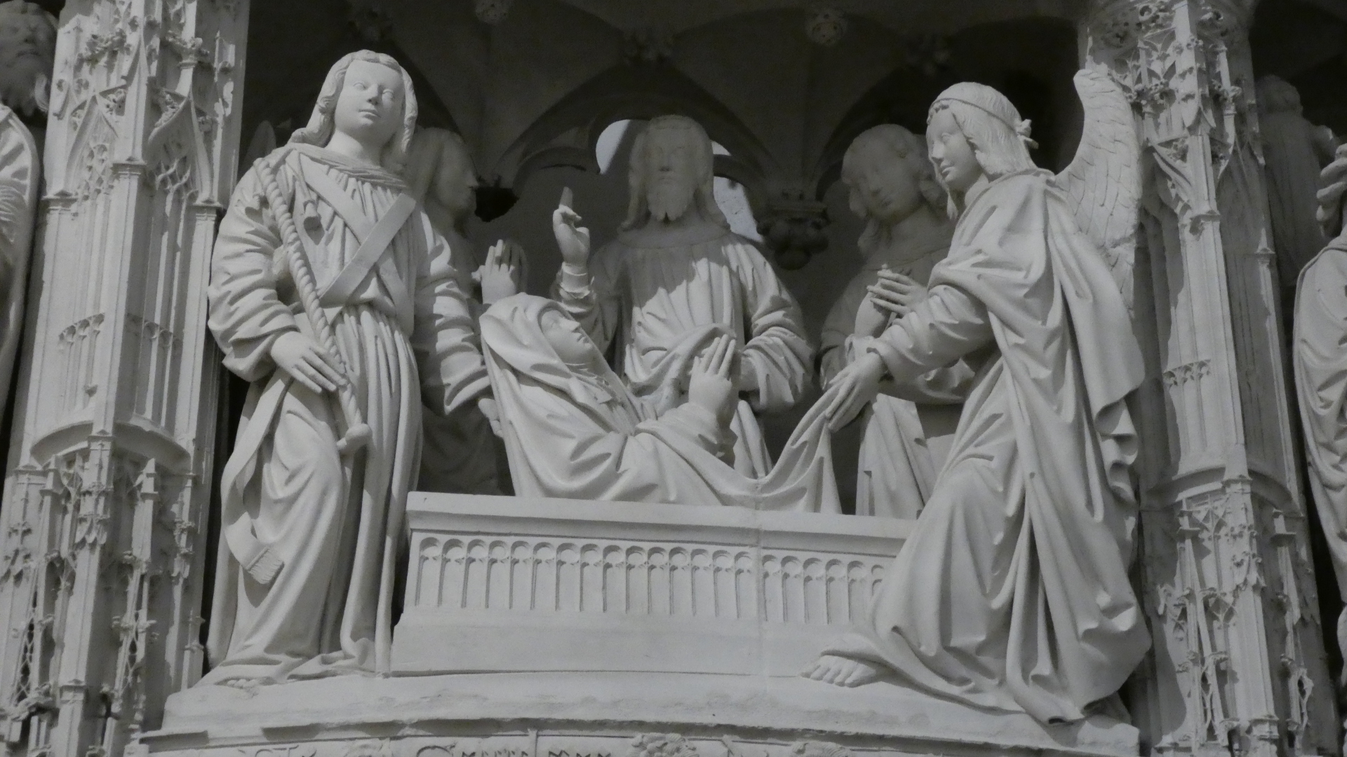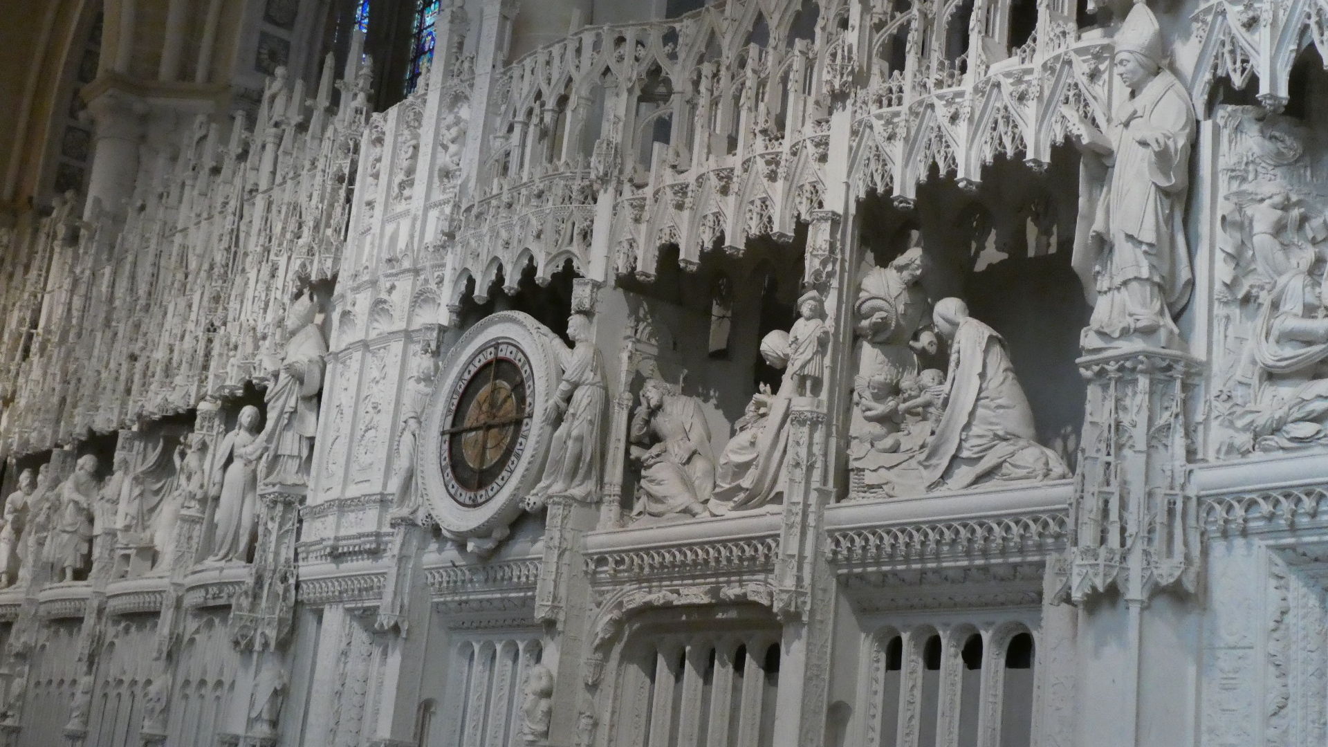 Inside the cathedral it was not in fact the soaring gothic arches that created the focus of attention. Rather it was a huge wall of carvings, that enclosed the choir area. The wall was comprised of equal aized sections, each with carvings depicting some bible scene. The choir wall, or screen, was initiated in 1514 and is 7 meters high and 100 meters long. There are 40 of the sculpted scenes, and they have a loose theme of the story of Mary and her son, from the announcement that he was on the way to the Coronation of Mary and the Ascension of Christ.