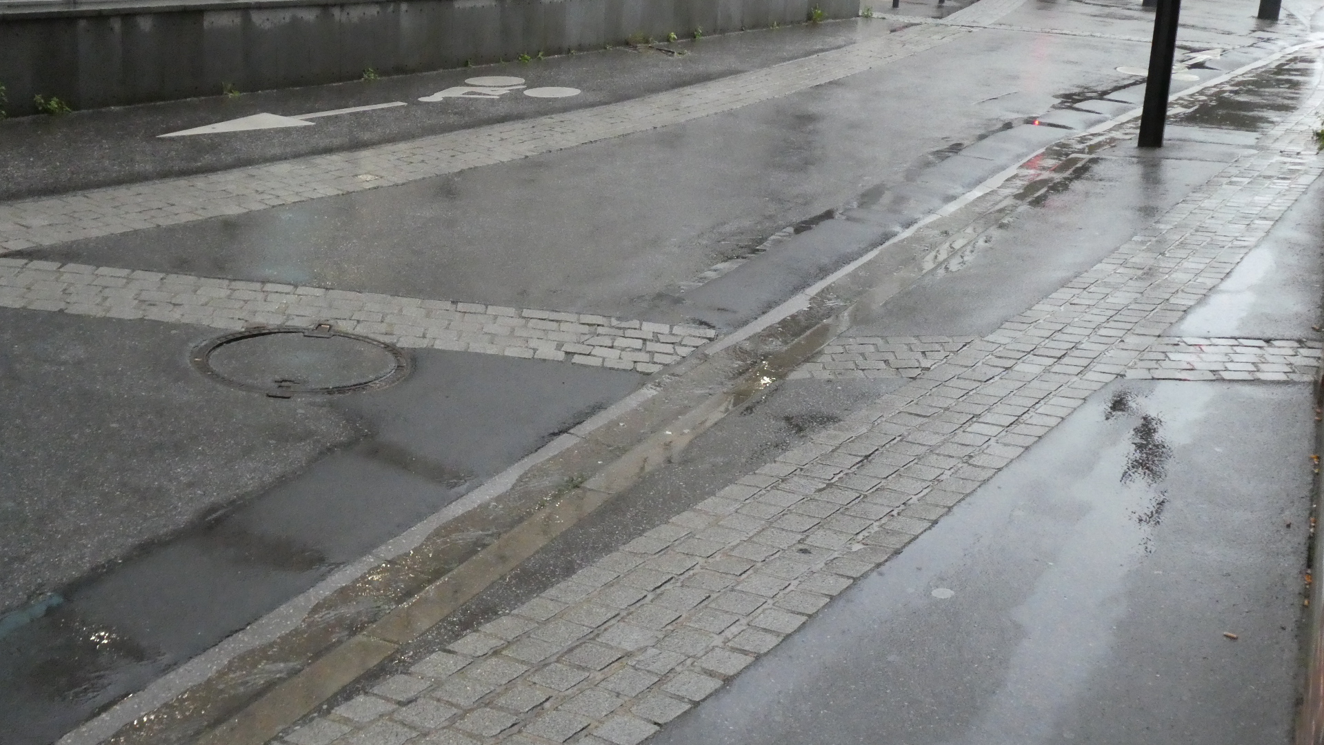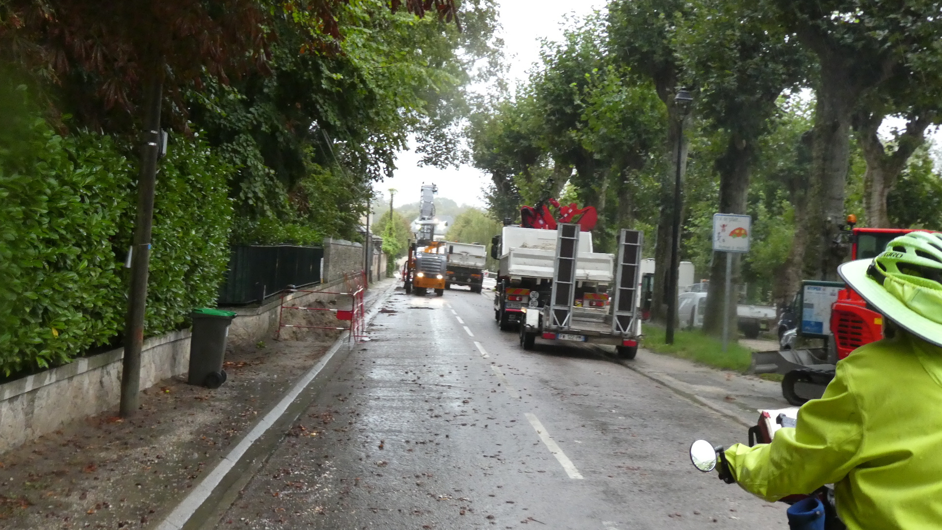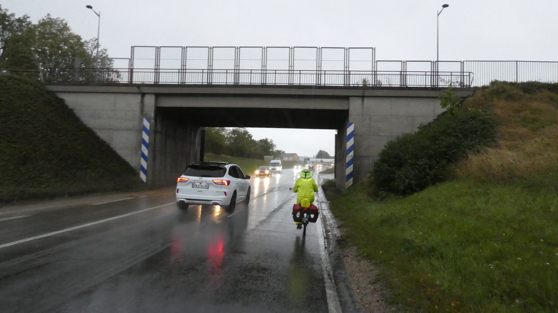 We are of course following the Classens in Spain, and today we read of how they were hit by a giant rainstorm. They have a great photo of a dry stream bed that became a torrent. Childishly trying to match this, I shot the street in front of the hotel this morning. The shot is not impressive, but as the morning progressed we did get some pretty torrential rainfall, cycled through deep lake like puddles and had some muddy torrents crossing the road. We had our rain jackets and pants and were ok, except that at 14 degrees we got quite thoroughly chilled.