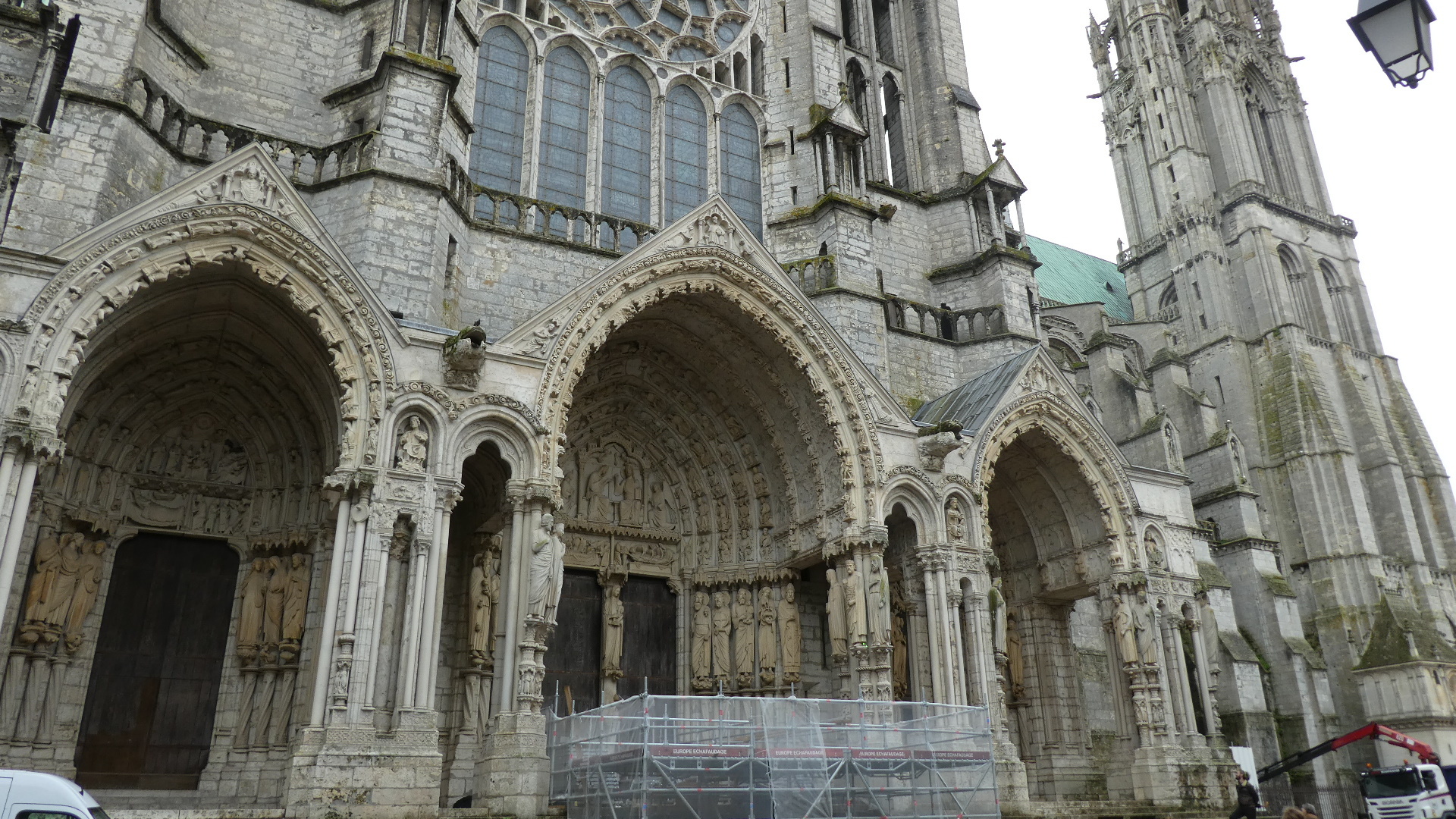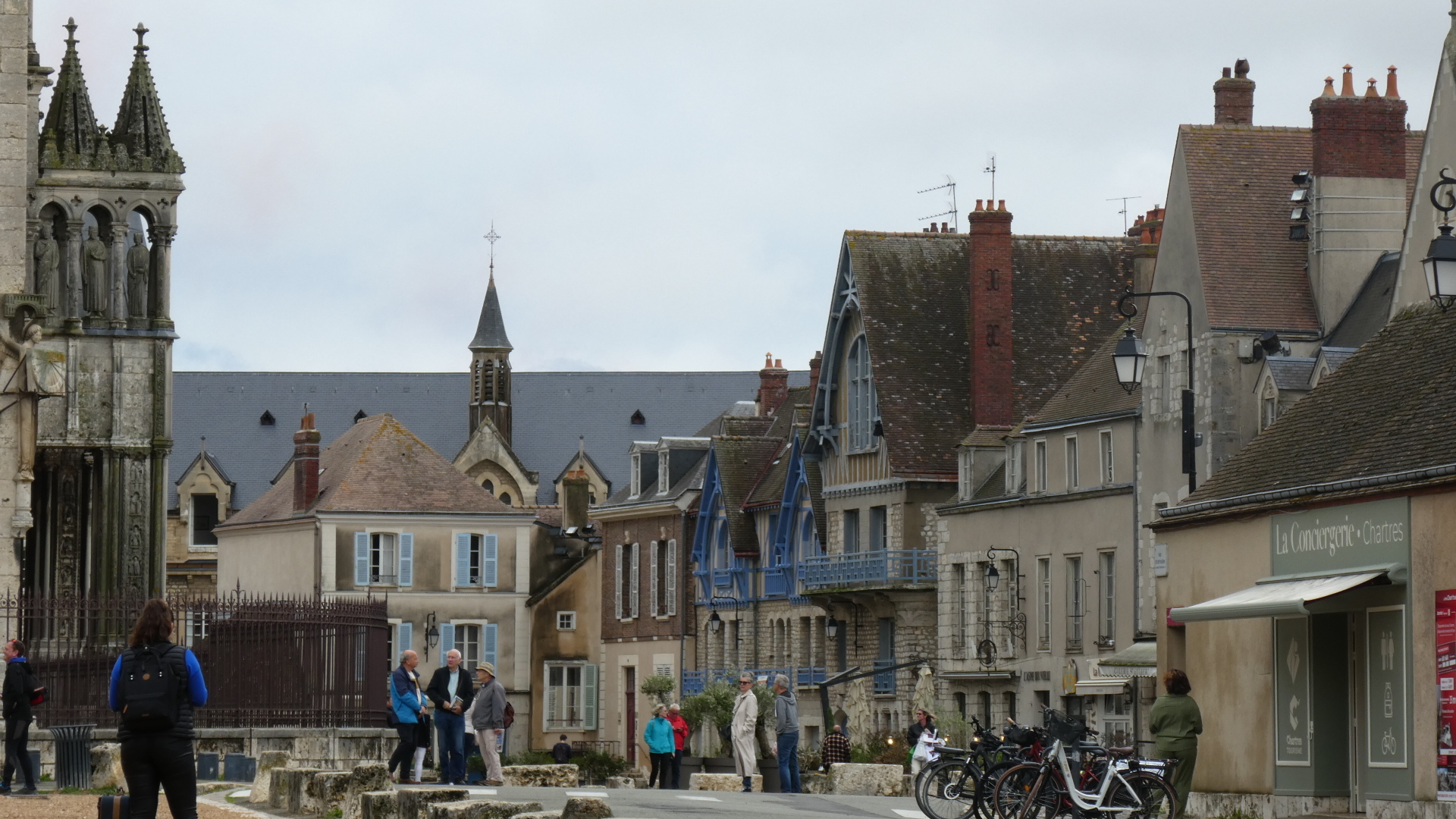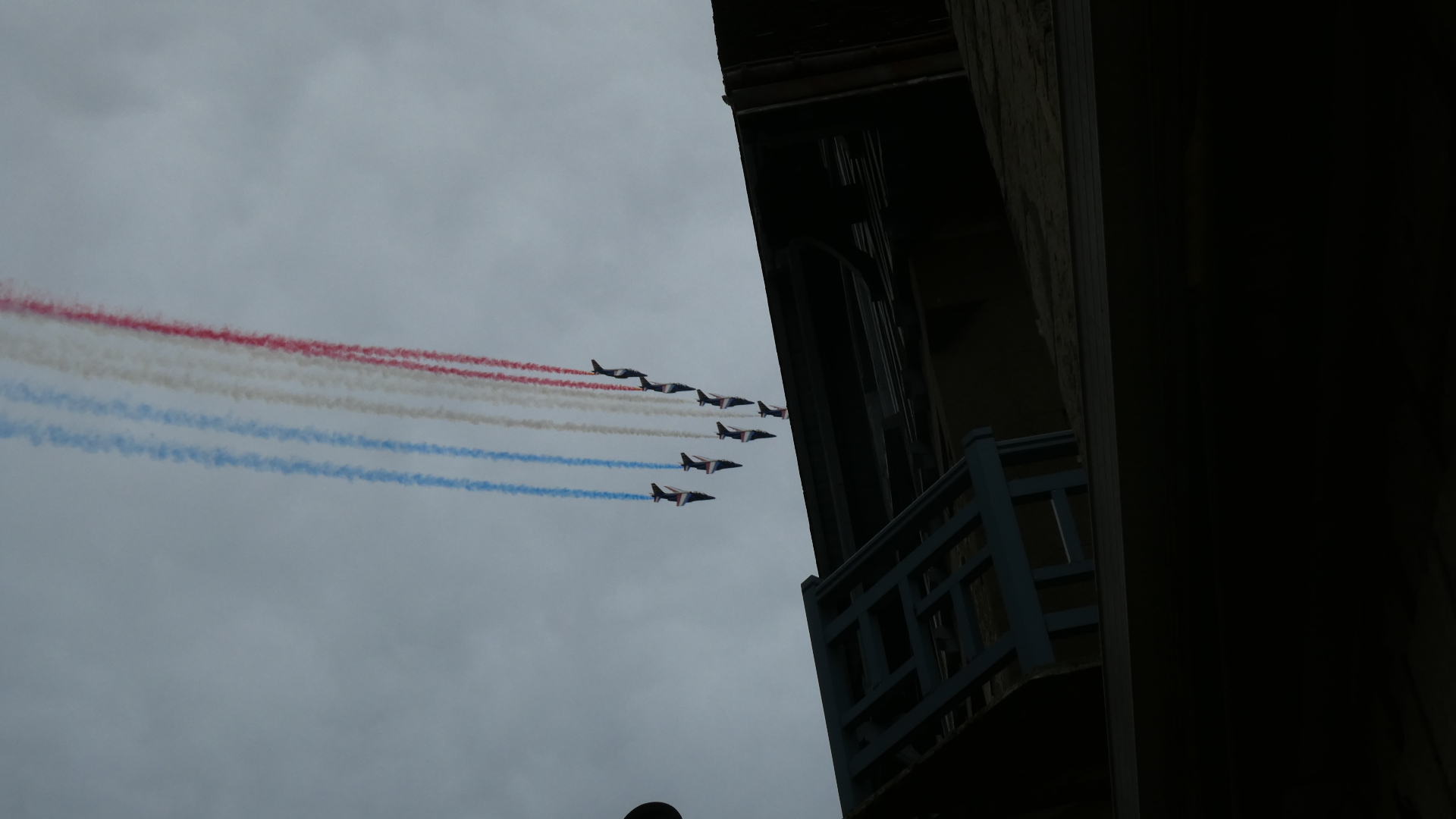We were distracted by some repeated fly-bys of France's aeronautic jet team. They had red white and blue streamers, and at one point drew a heart with them. School kids, tourists, and us were really thrilled to see this, in front of the cathedral. We later learned that they were practicing for Charles III, who is visiting the country just now.
