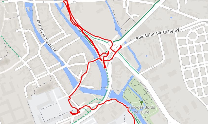 The weather pattern for today was similar to yesterday, with heavy rain in the morning, ending in the afternoon. This time the low starting temperature of 11 was thrown in, and high wind to boot. One of the effects of rain on the phone we are using for GPS is that the drops close the app - Osmand. Consequently as we tried to leave Chartres, Dodie had only literally two seconds of guidance at a time, before having to relaunch the app. It turned out that the track we were following, created at home with an algorithm, corresponded to the Veloscenie, and there were lots of Veloscenie signs about. The glitch was that in the early going we were not sure that our track was really the Veloscenie, plus in Chartres centre the Veloscenie signs were confusing and hard to interpret. As a result, we went round and round, wasting perhaps 5 km before getting anywhere. Take a seasick pill and have a look: