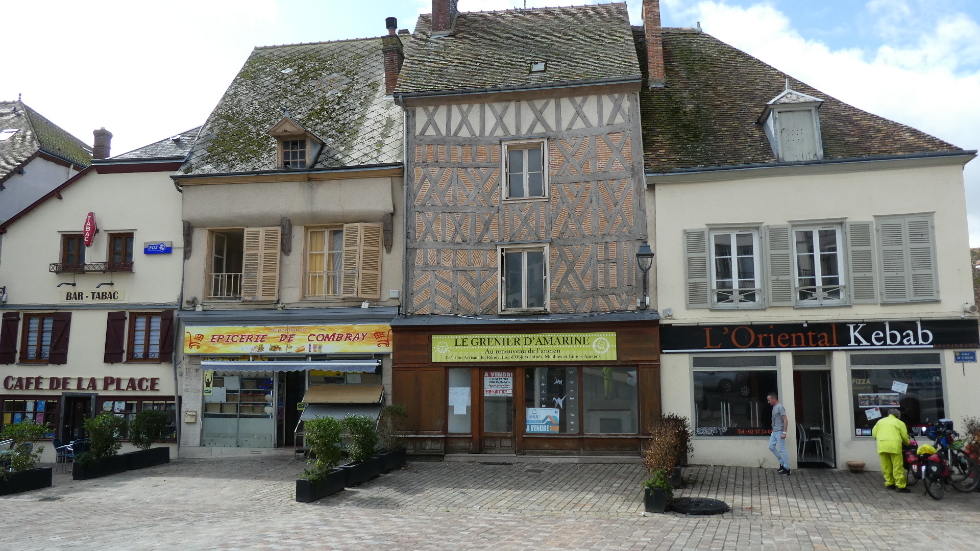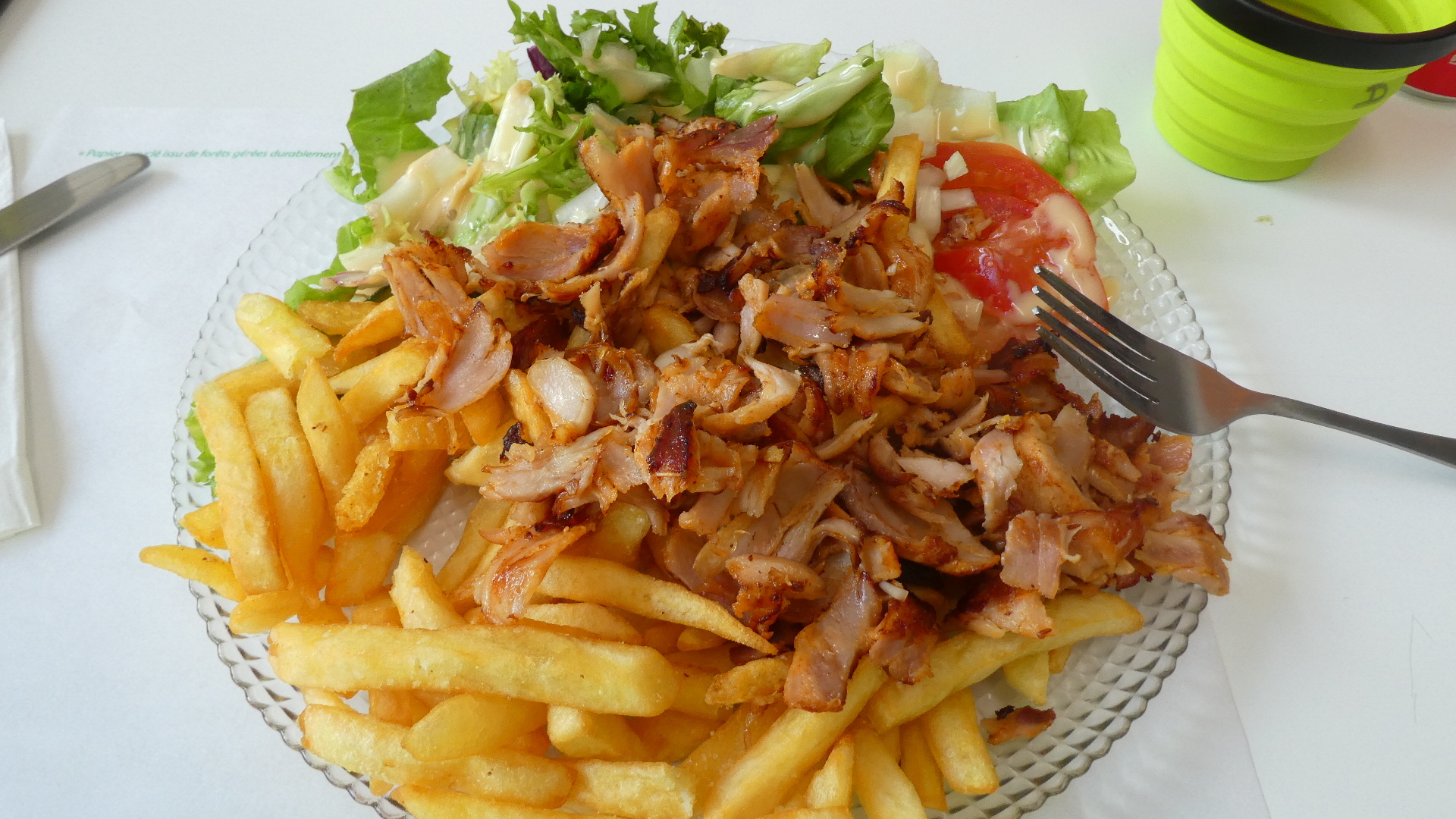 By mid day we were close to the town of Illiers-Combray. We encountered two cyclists on the path with their bikes this way and that. They had had a flat, and of course we offered to help. But they had the flat fixed and were just putting things back together. I was glad that no help was needed, because by then my hands were so cold they were all but useless. When we did roll into town, we came to a small square - probably the town centre - with a church, a bar, and two restaurants. Dodie had suggested that an unaccustomed hot meal might be what we needed just then. I randomly walked into the bar and asked to see a menu. But I was told there was no menu. "Ok, no menu",said the gormless tourist, "But do you have any food?" "No food" was the reply. Grampies don't drink and inherently do not recognize or understand bars. I stared at the man, confused, and went back outside to make my report. Dodie said ok let's just eat our sandwich on the church steps. But restaurant #2 was a kebab place, not usually favoured by Dodie. I went and had a look, and found they had lots of space and it was warm inside! Done. I collected Dodie off the church steps, and soon we were lounging at a large, warm table.