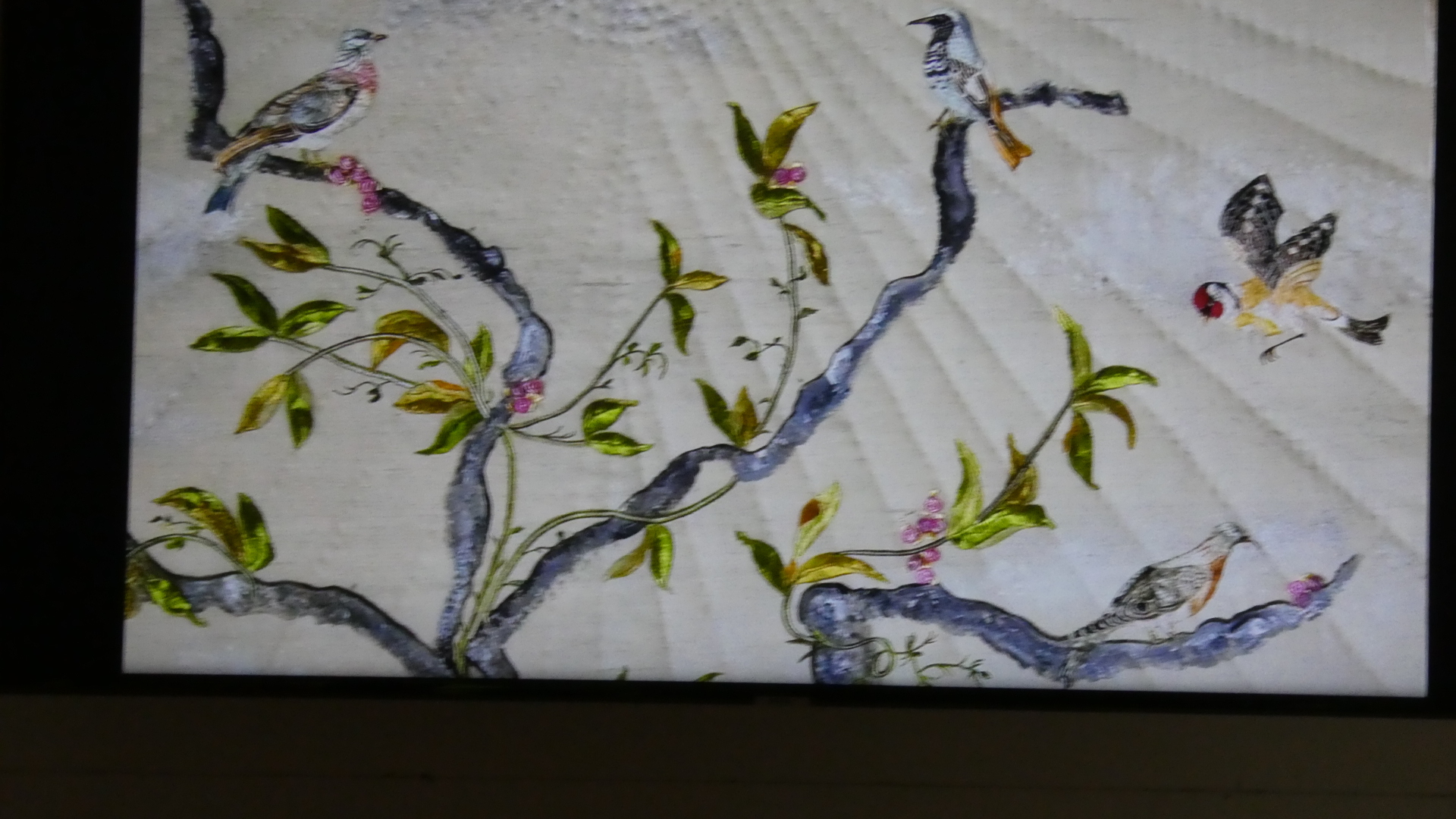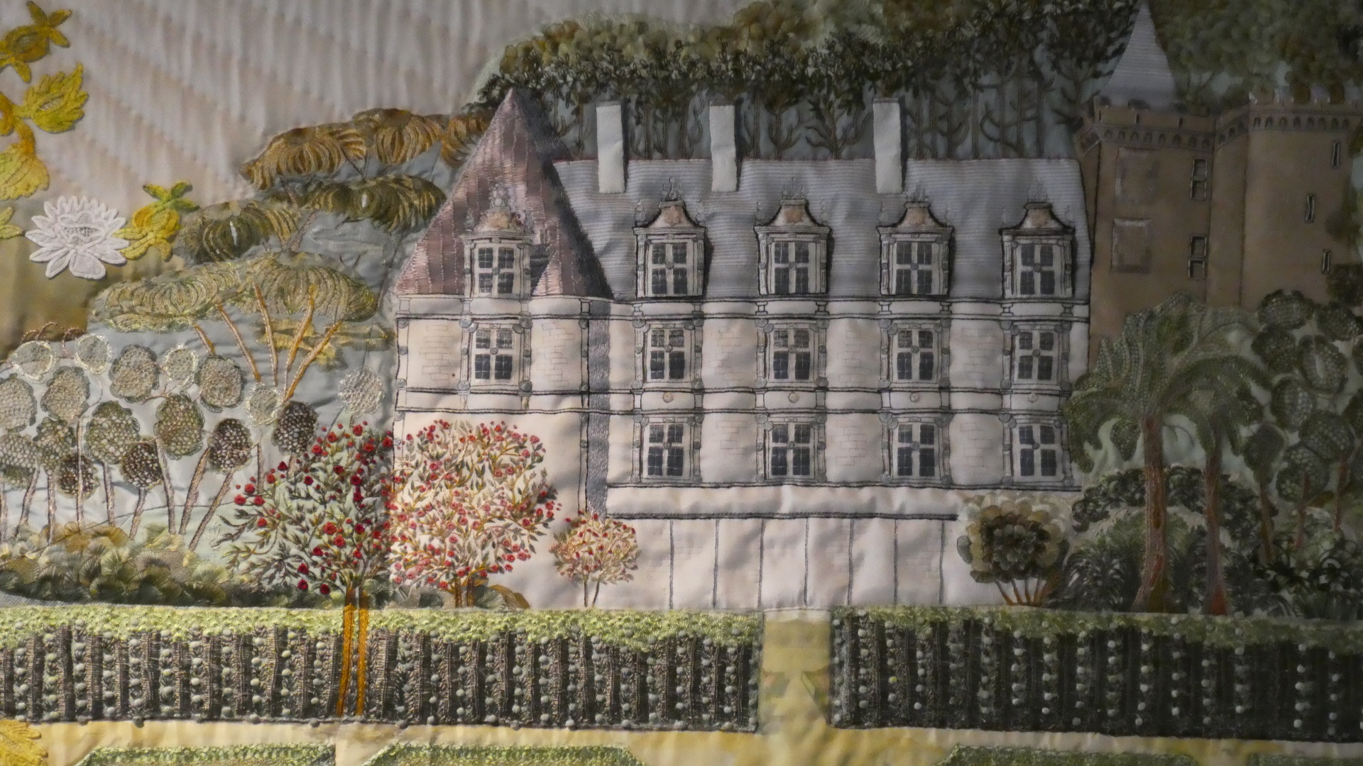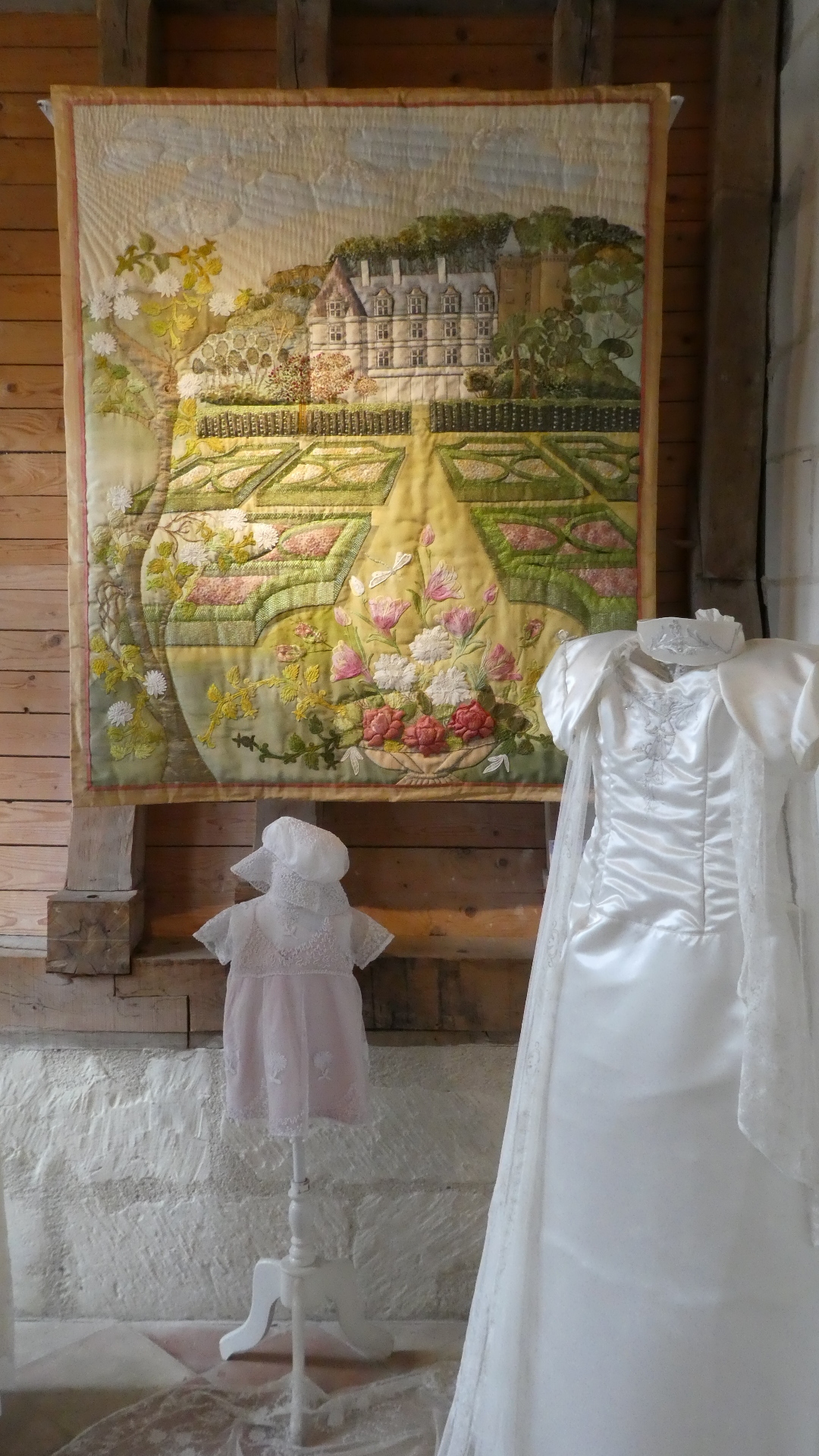 The final couple of rooms on the second floor are just before one exits to walk outside above the gardens. These rooms contained an exhibition from Brigitte Chappaz, a crafter in silk embroidery. At first it seemed there was just a film about it, but then it was clear there were many actual examples hanging. We found these all amazing, and we are sure daughter-in-law Sabrina, as well as our friend fabric artist Marsha would think the same. So here are a lot of the film shots, and actual hangings: