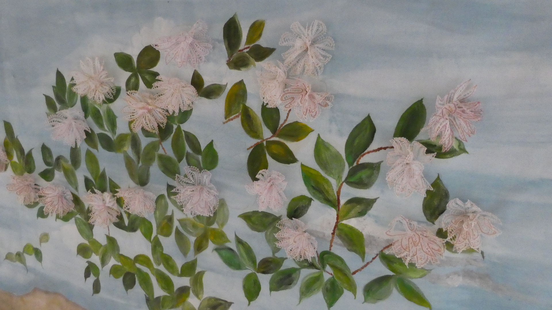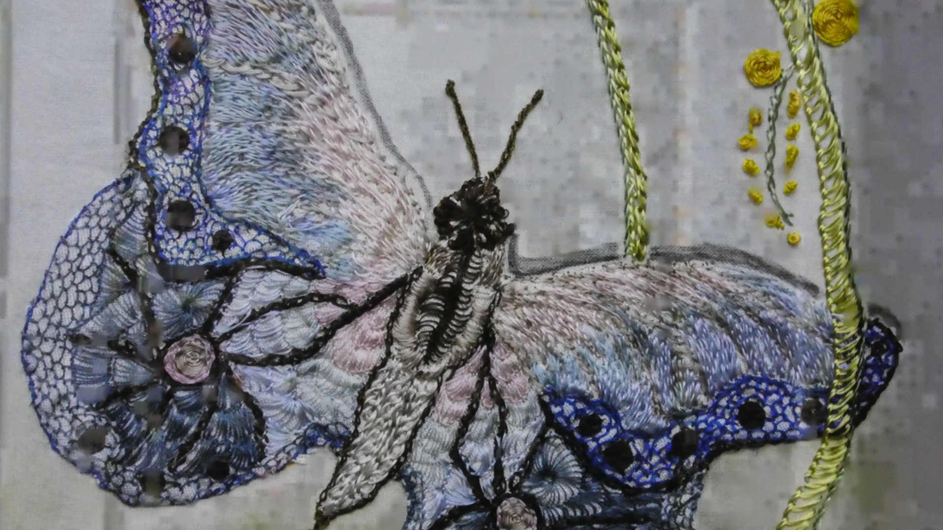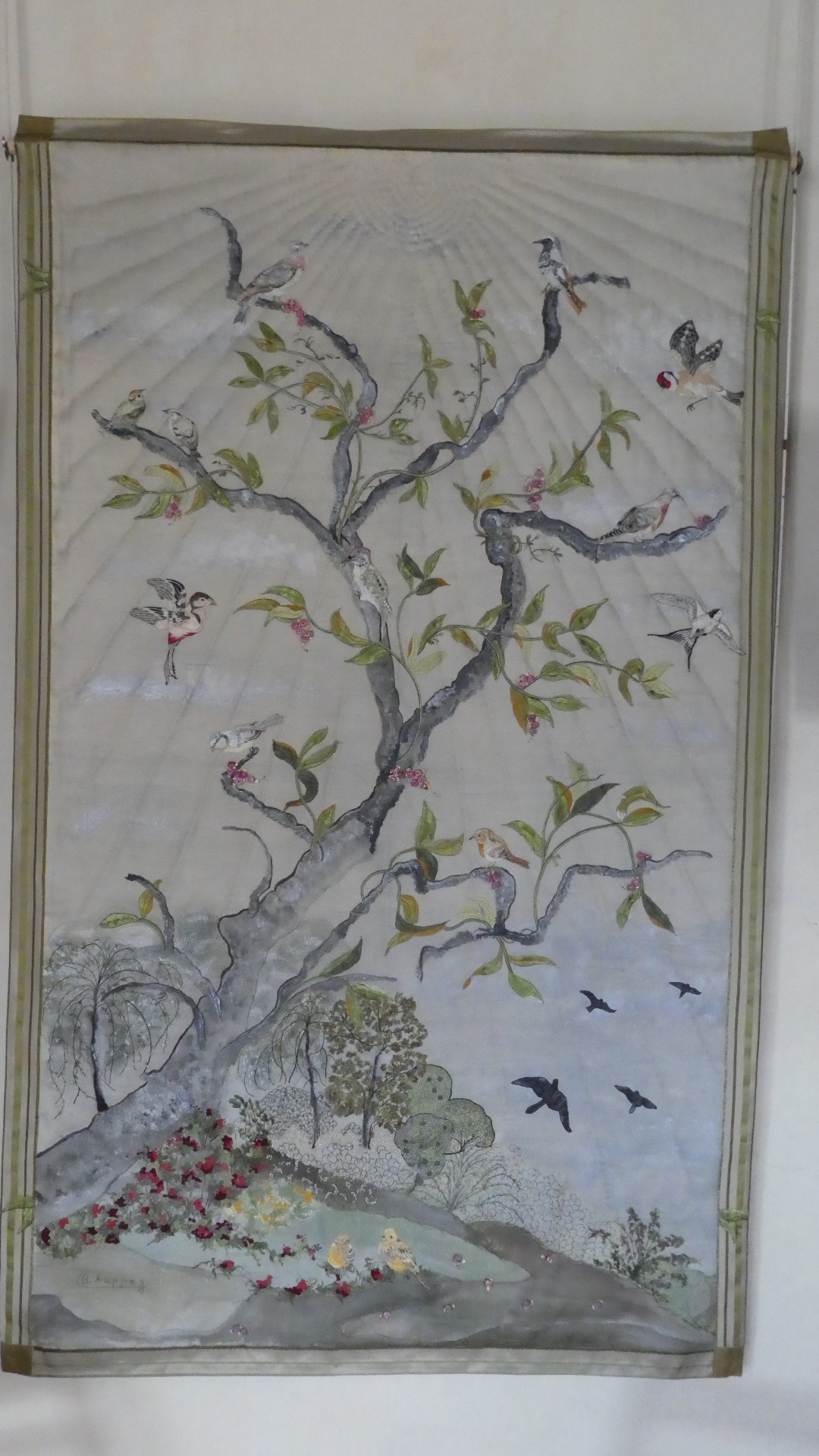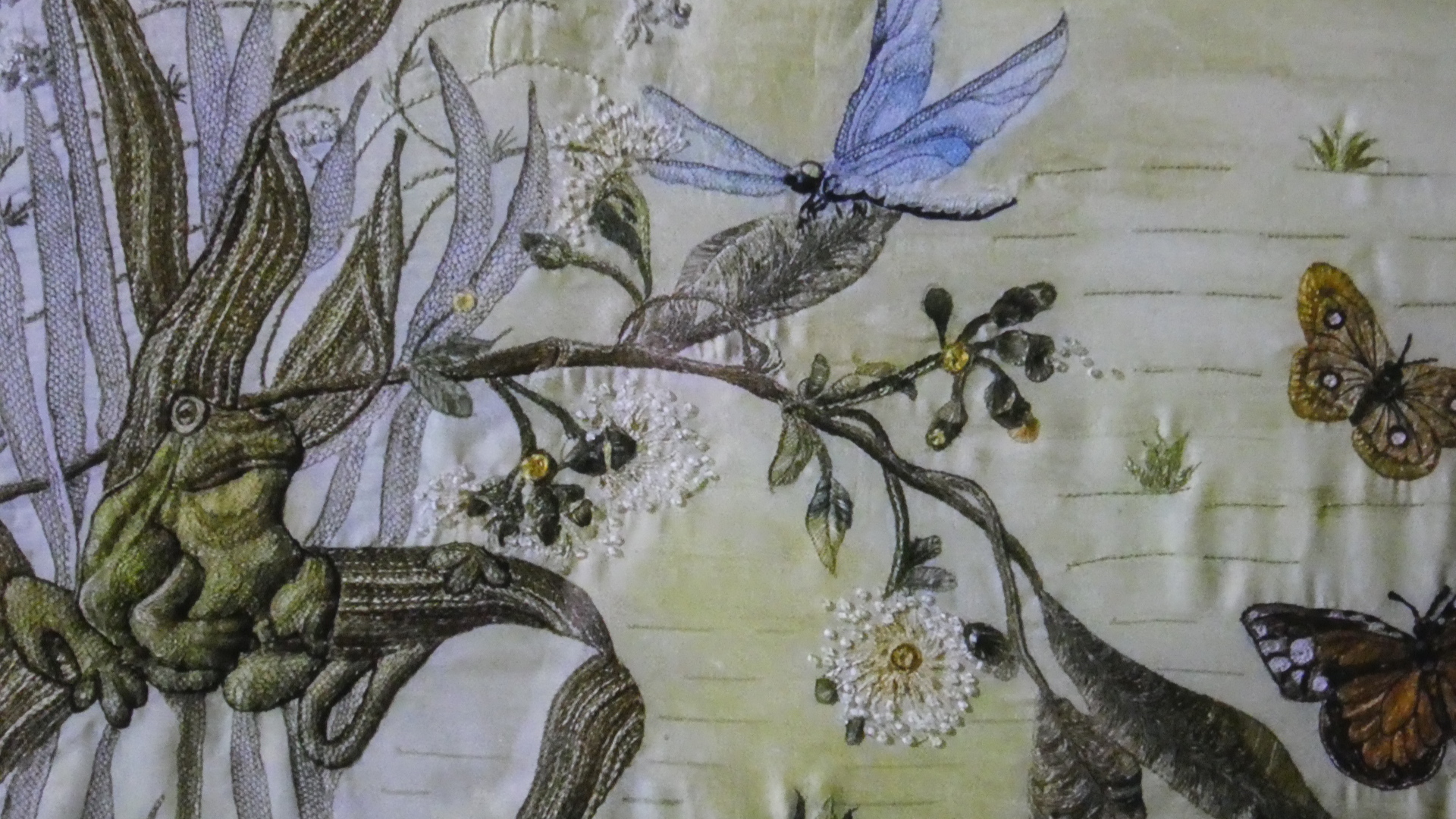 The final couple of rooms on the second floor are just before one exits to walk outside above the gardens. These rooms contained an exhibition from Brigitte Chappaz, a crafter in silk embroidery. At first it seemed there was just a film about it, but then it was clear there were many actual examples hanging. We found these all amazing, and we are sure daughter-in-law Sabrina, as well as our friend fabric artist Marsha would think the same. So here are a lot of the film shots, and actual hangings: