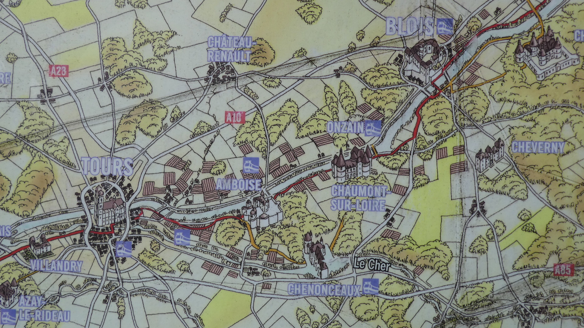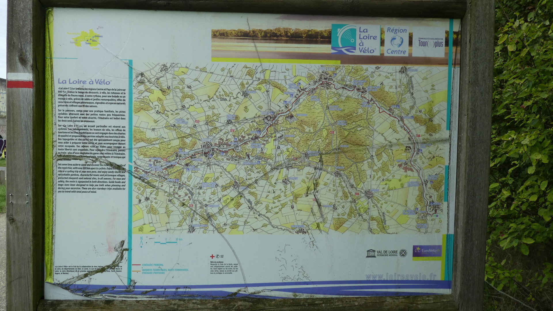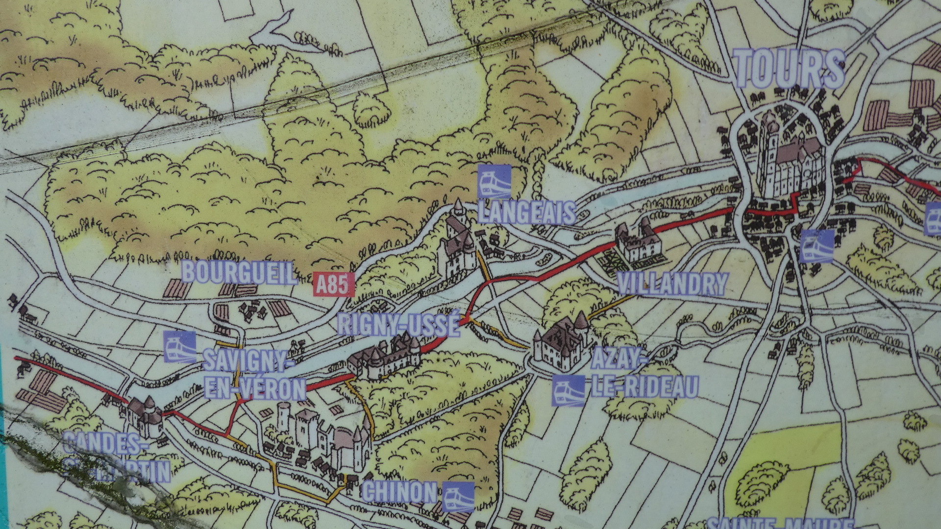Looking at the sign more closely, you can see to east and west all the famous chateau destinations nearby, like Chinon, Candes, and Chenenceau. One could set up in Tours and make a lot of day rides out to these places!