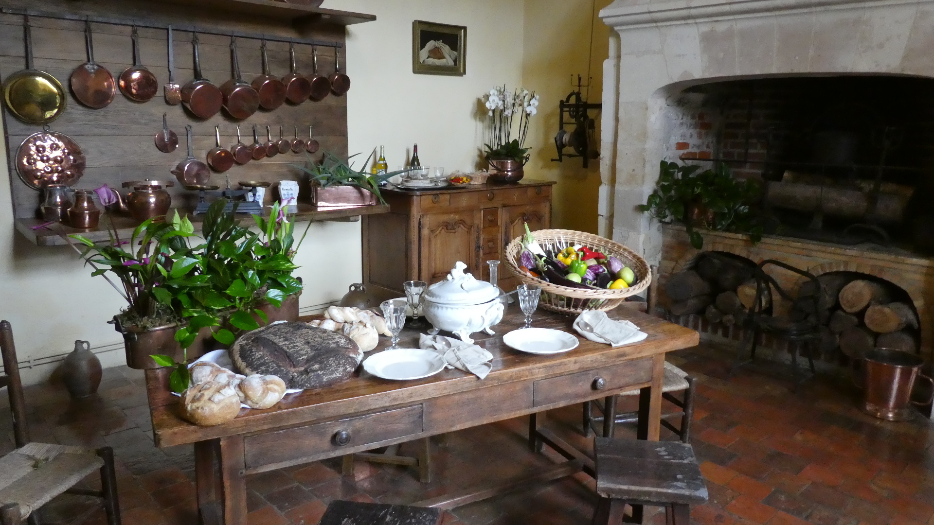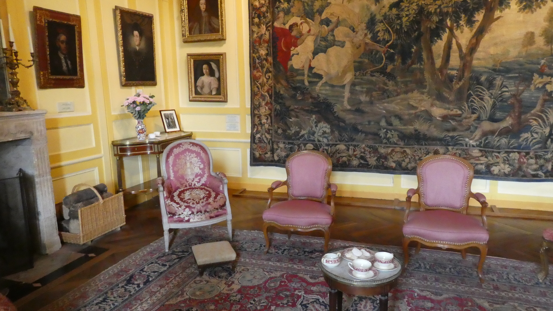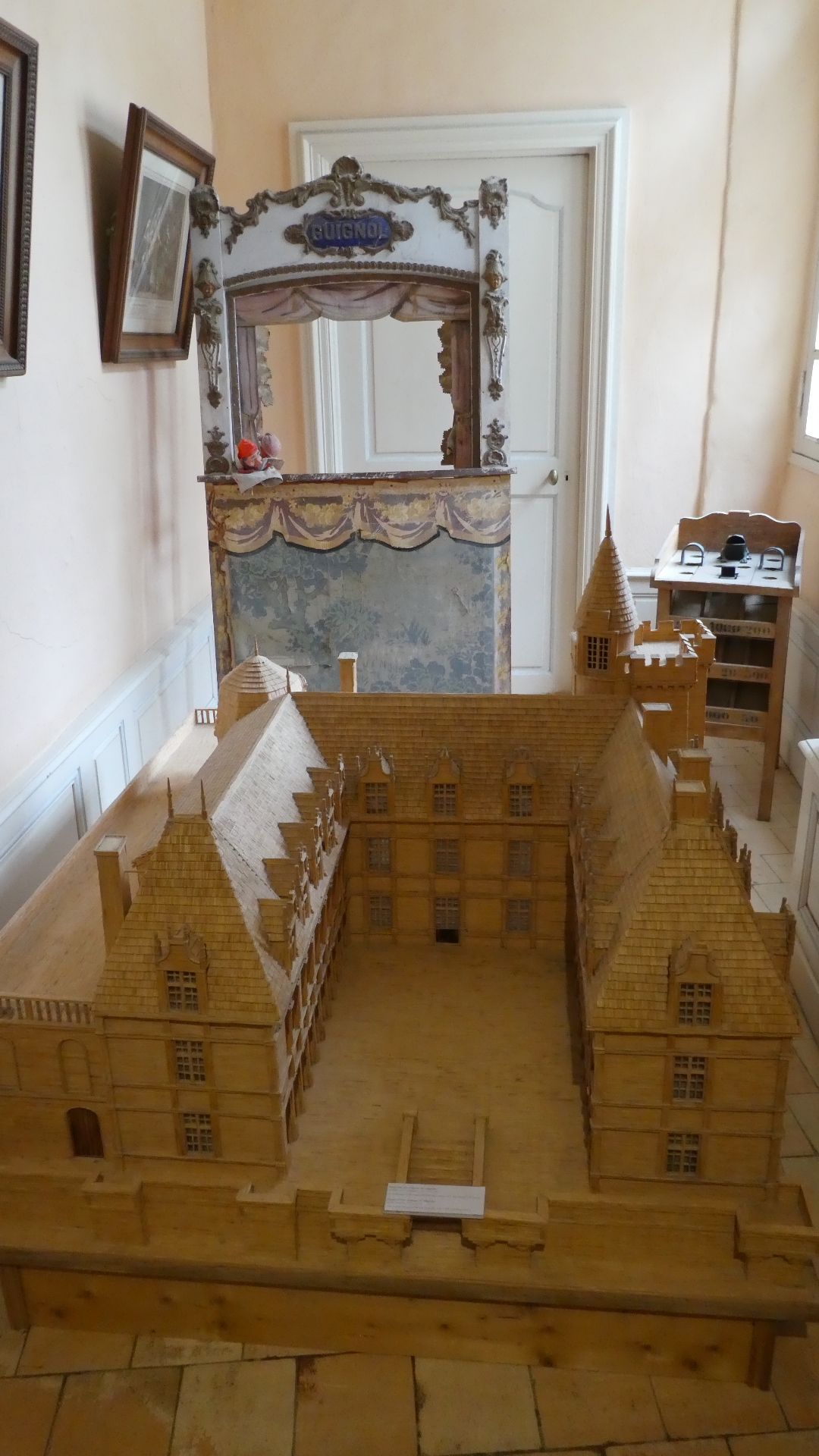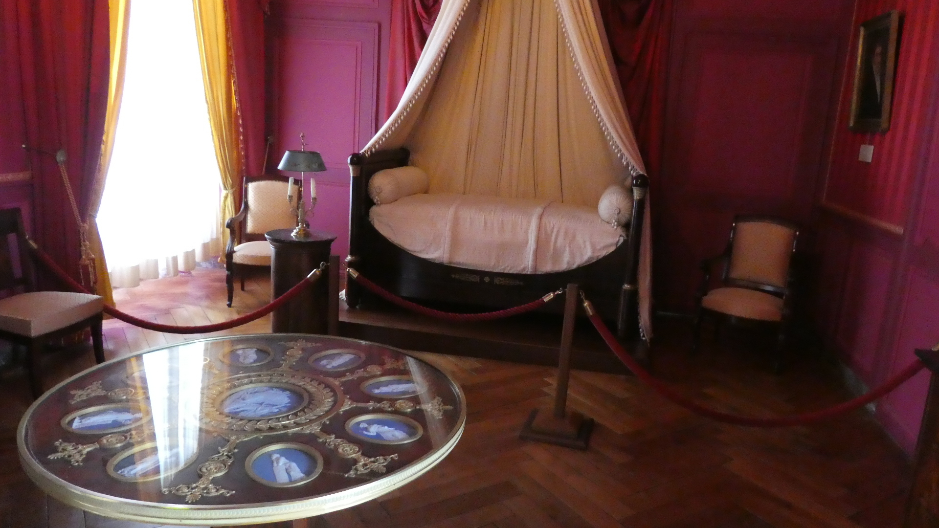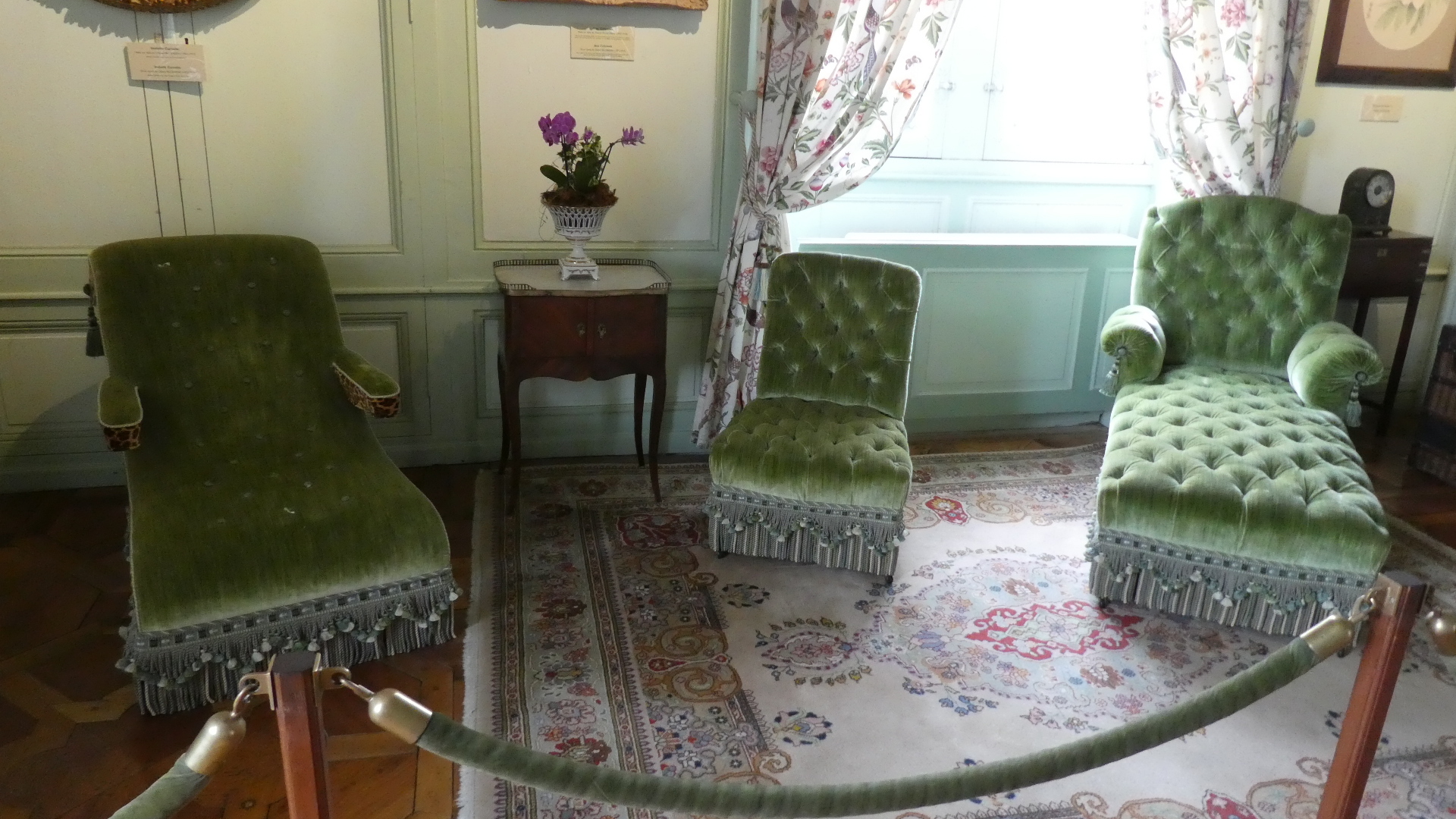 The tour of Villandry can be just the gardens or of the house as well as the gardens. We went for the full deal, which starts with the house. Our general impression is the same for all these older castles - they are not really comfortable, whether in layout, furnishings, or facilities. But some things are great - like parquet flooring, and "wallpaper" which is actually a silk embroidered hanging. There are lots of rooms, so going through can be tiresome, for us, as well as for someone looking at the pictures. Still, have a flip through. One thing you will see is that all the rooms have the advantage of looking out at the fabulous gardens. So as we go through and look out, so does our camera.