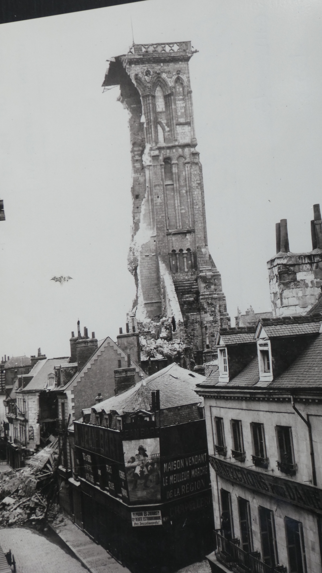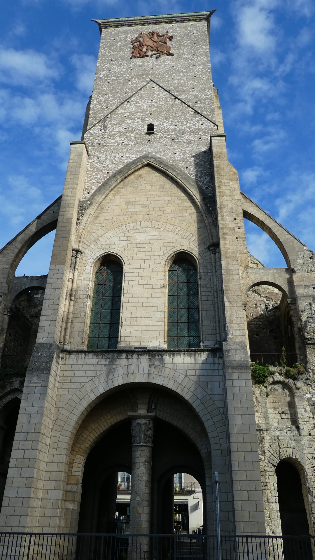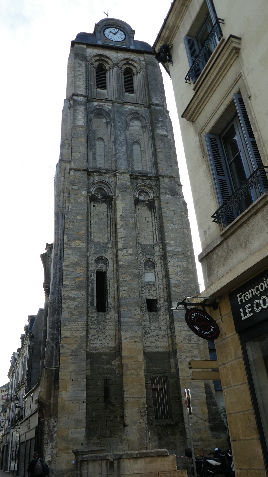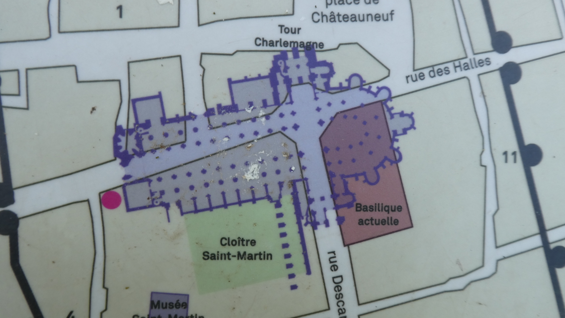 Here below is the key to understanding the three towers visible from our hotel room. We were confused about them until we found this graphic. What it shows is that in this place there stood a giant church, as mentioned above. It extended far up and down what is now rue des Halles, and its former outline is shown in blue. At the top of the outline you can see "Tour Charlemagne", at the lower left of the outline is a blue square - that is the clock tower, and the brownish rectangle at the lower right is the present St. Martin Basilica, "Basilique actuelle".