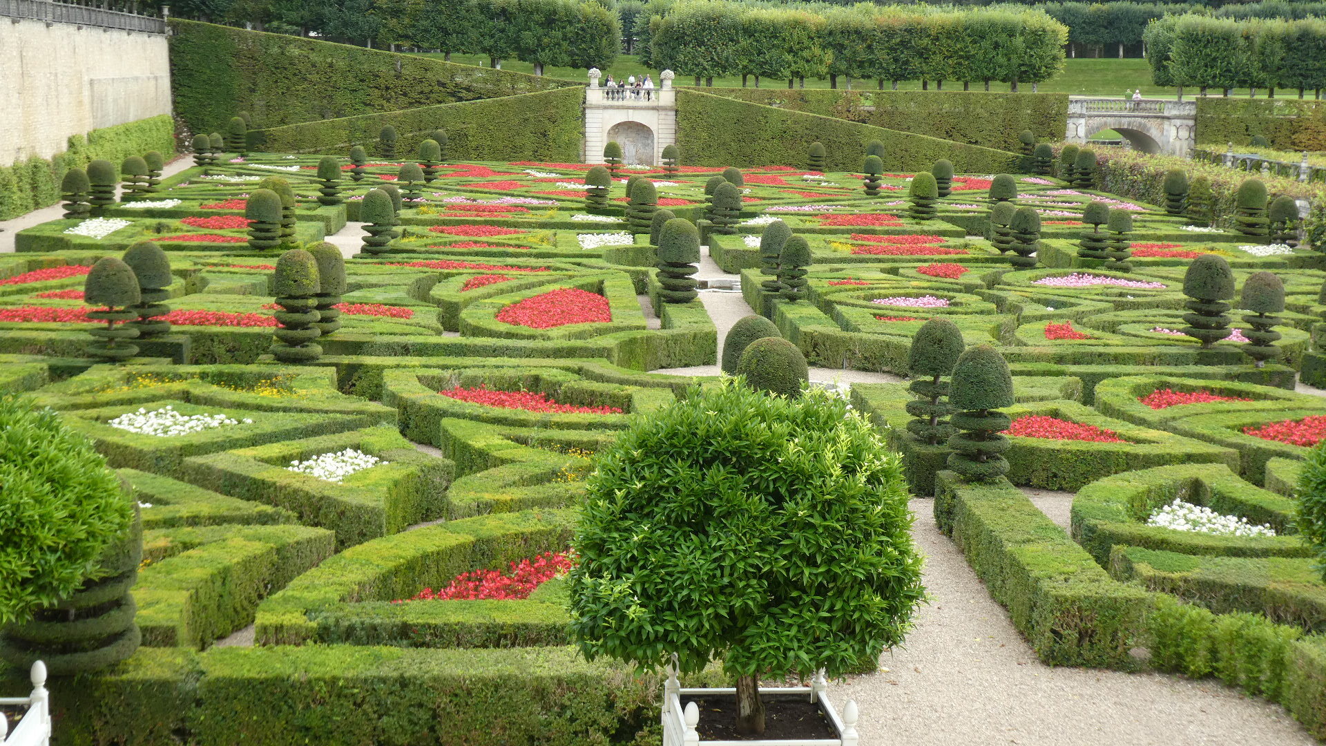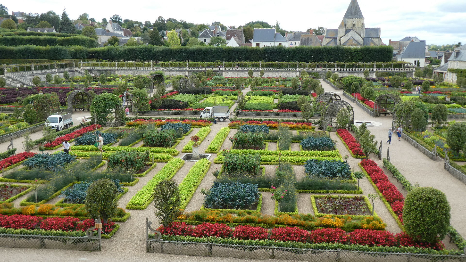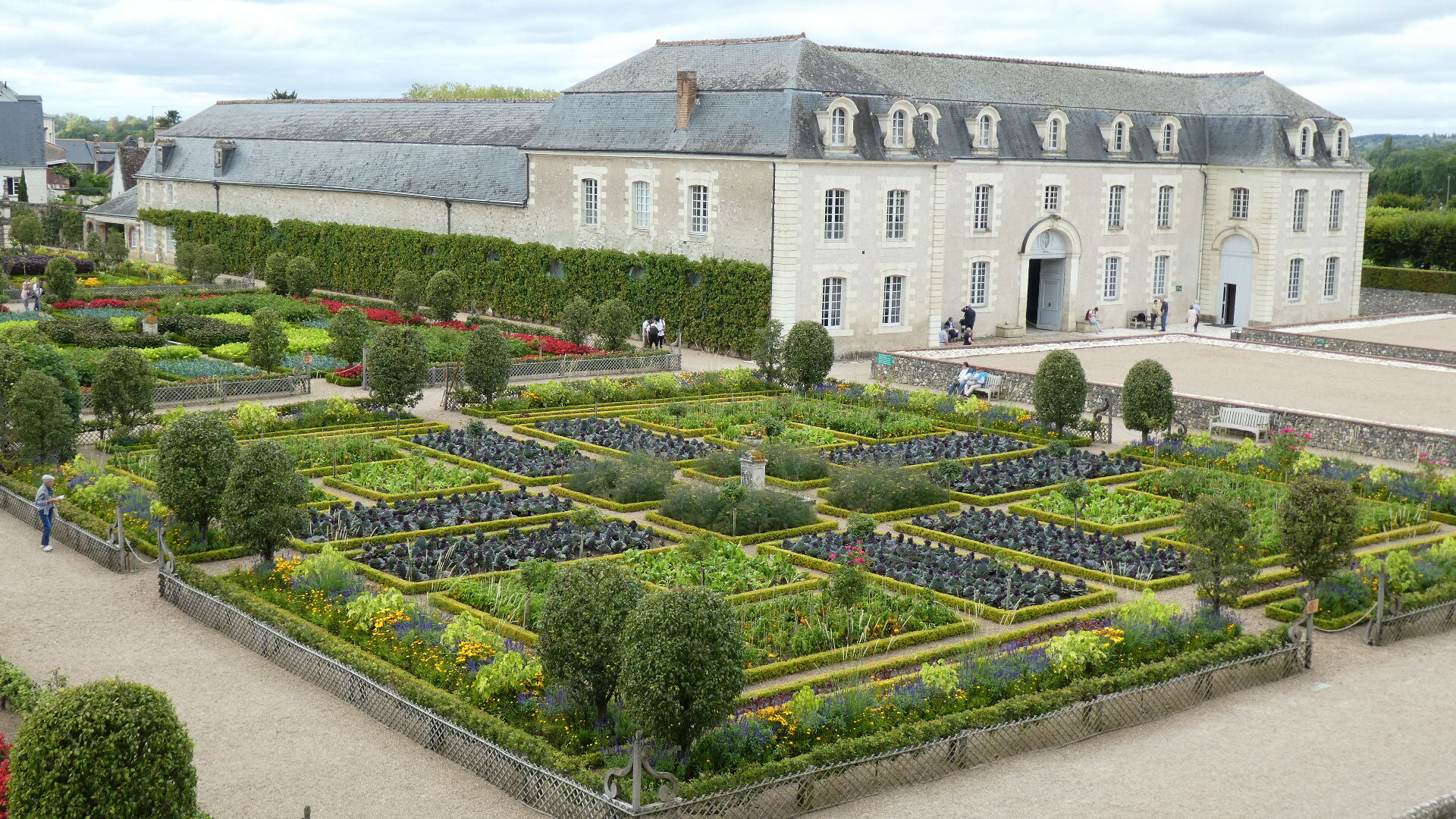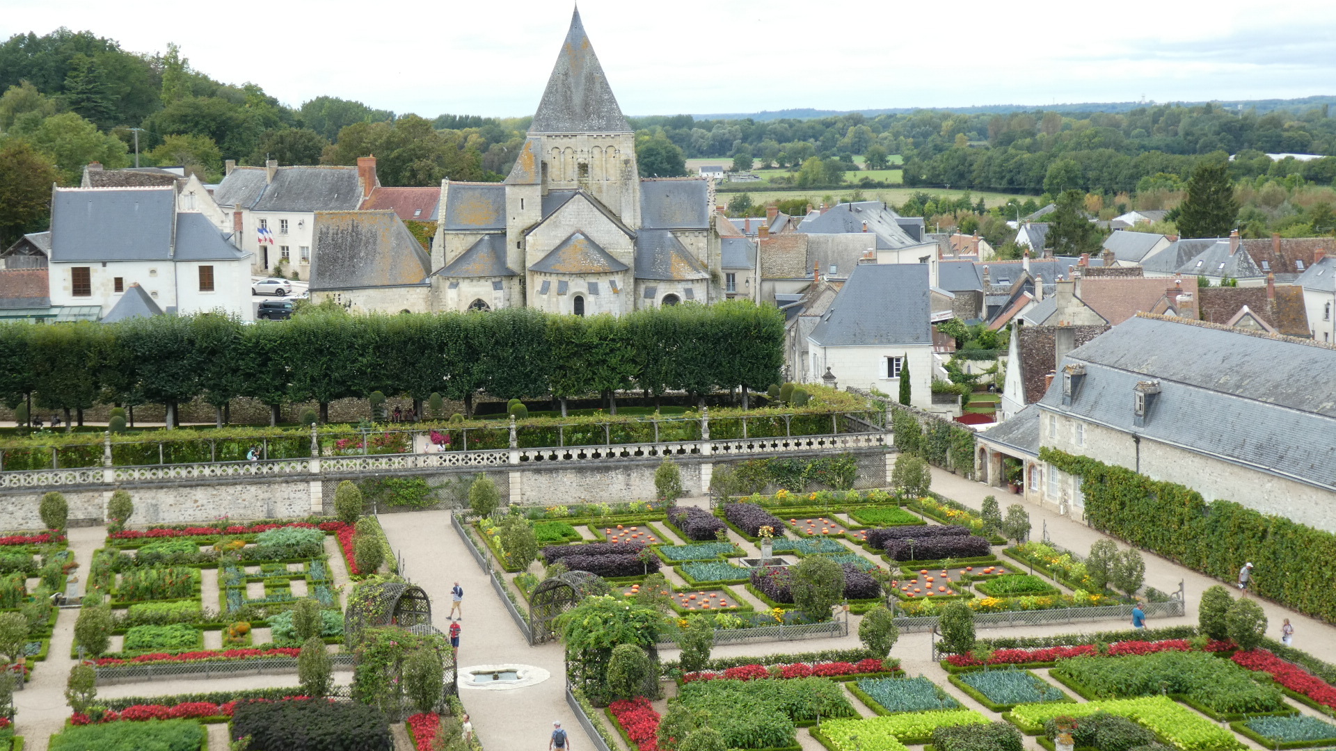 For about 300 km along the Loire, both east and west of Tours, there are about 80 major chateaus. Including lesser ones and ruins, the count may reach 300. It's an amazing thing, and the major ones especially are absolutely world treasures. Chambord is the largest and possibly the most striking, but there are so many more. Villandry is probably our favourite, because it is the one with the best gardens. Today they take the form of formal gardens, covering seven hectares (17 acres). There are about eight knot gardens, framed in boxwood, and then a herb garden and ornamental kitchen garden. There is also a water garden, a maze, a forest, a moat, a lake, and more.