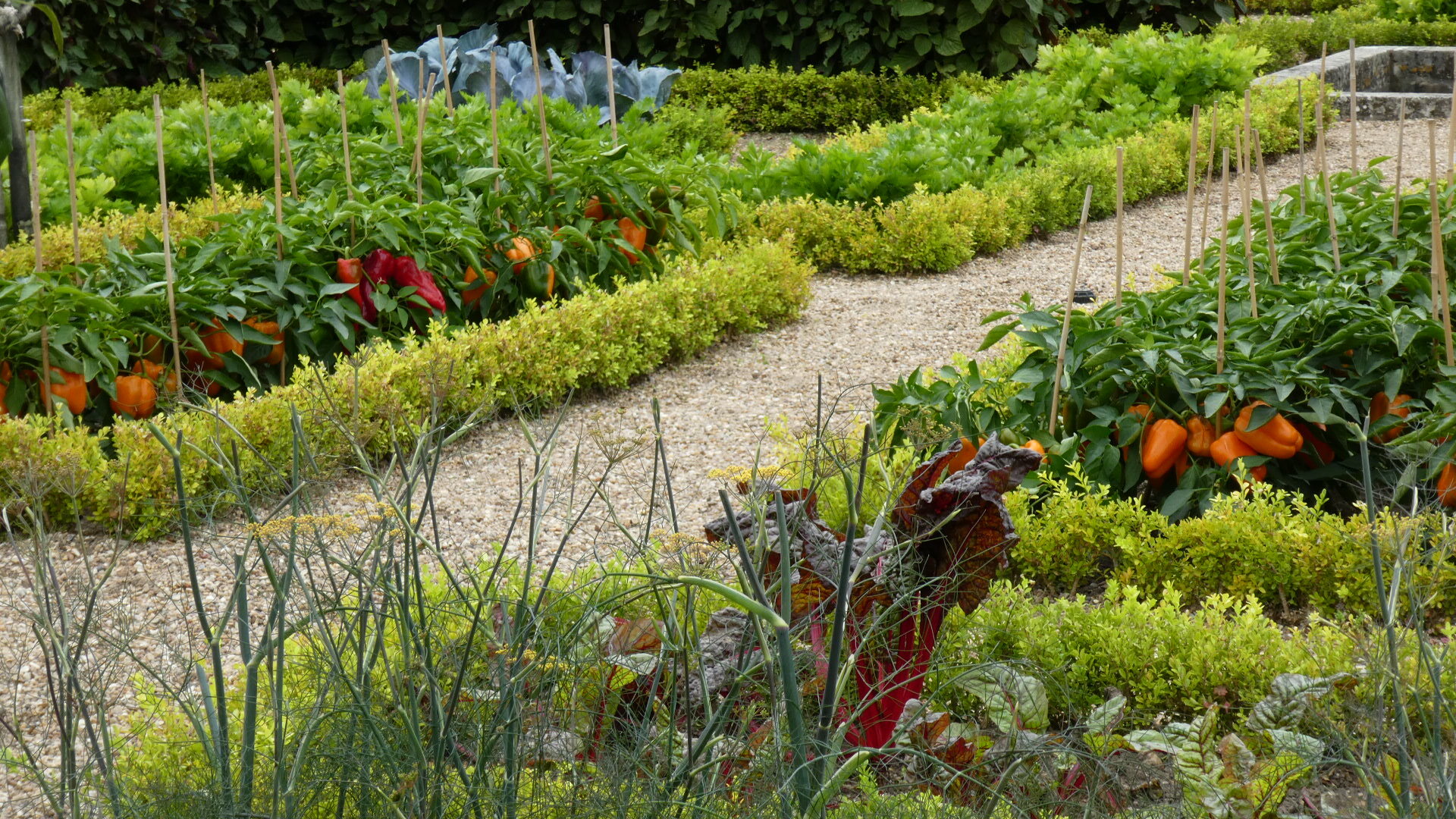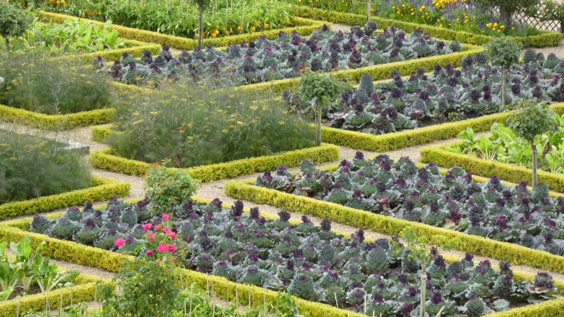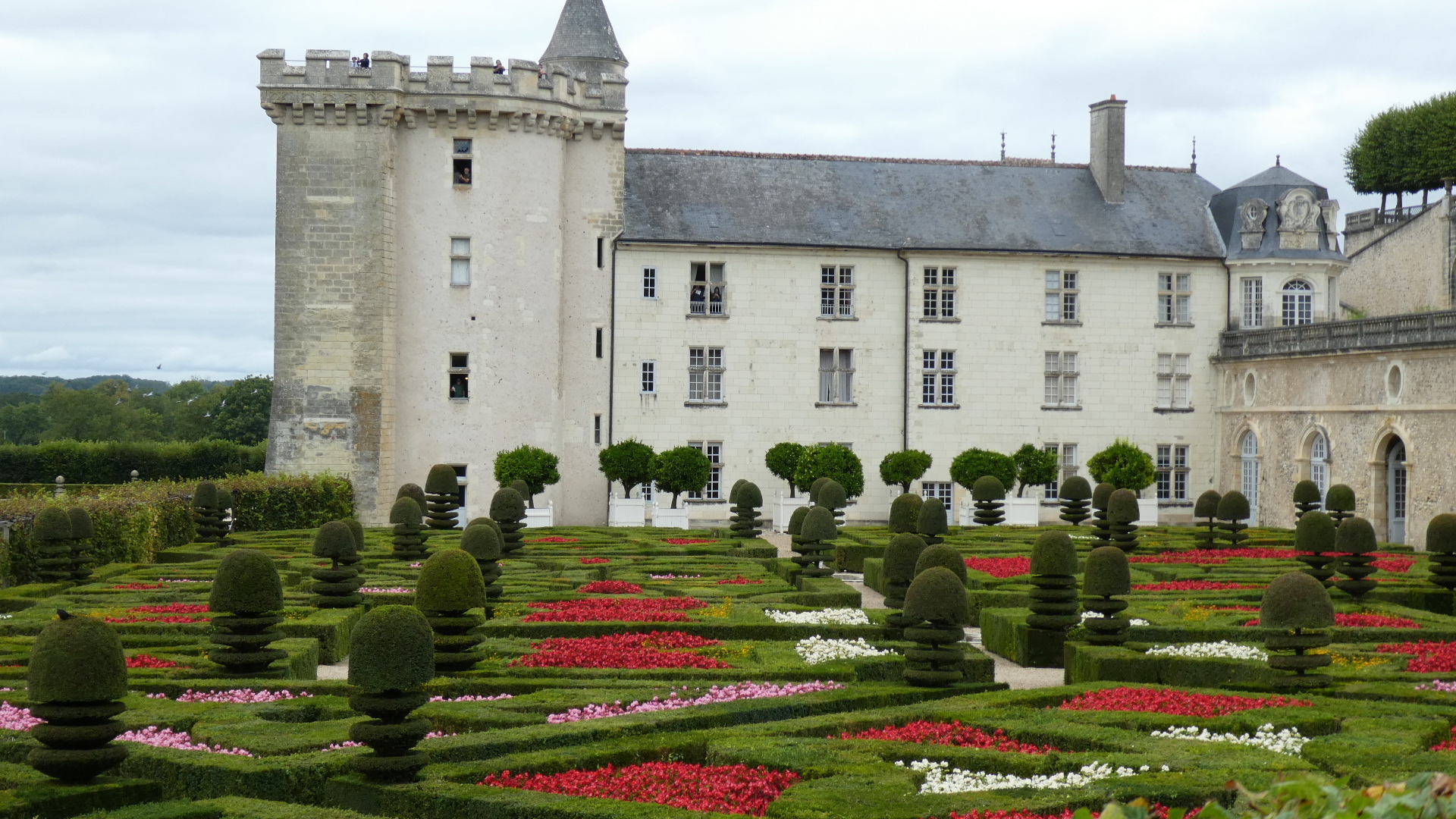 For about 300 km along the Loire, both east and west of Tours, there are about 80 major chateaus. Including lesser ones and ruins, the count may reach 300. It's an amazing thing, and the major ones especially are absolutely world treasures. Chambord is the largest and possibly the most striking, but there are so many more. Villandry is probably our favourite, because it is the one with the best gardens. Today they take the form of formal gardens, covering seven hectares (17 acres). There are about eight knot gardens, framed in boxwood, and then a herb garden and ornamental kitchen garden. There is also a water garden, a maze, a forest, a moat, a lake, and more.