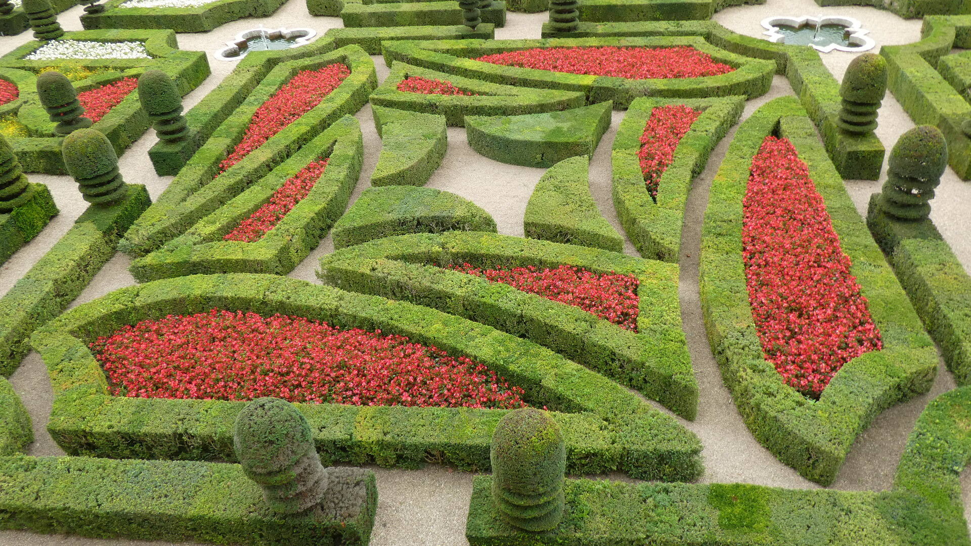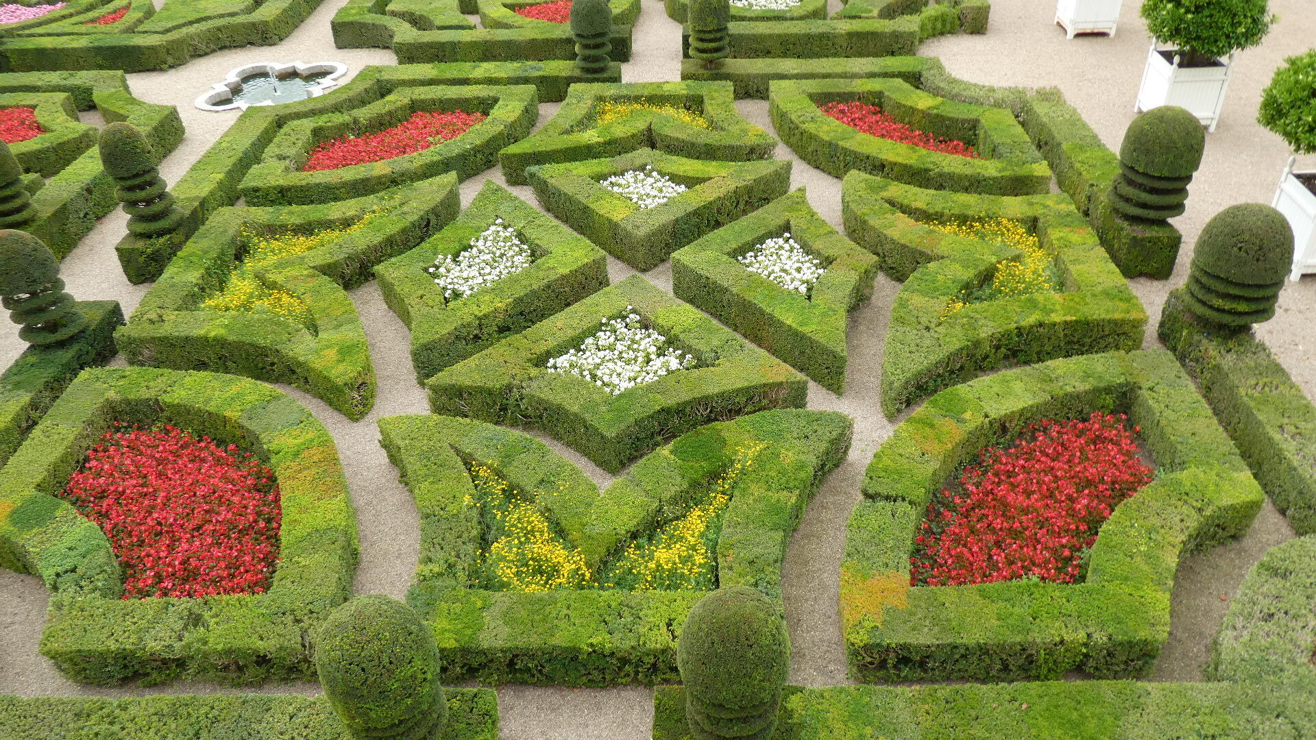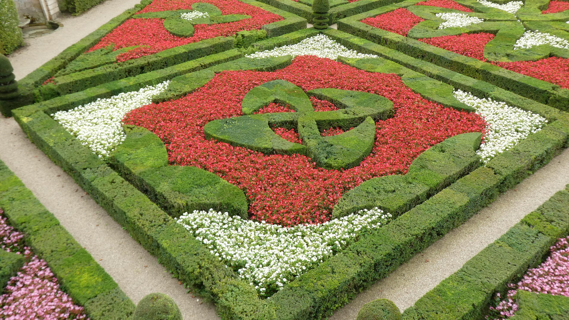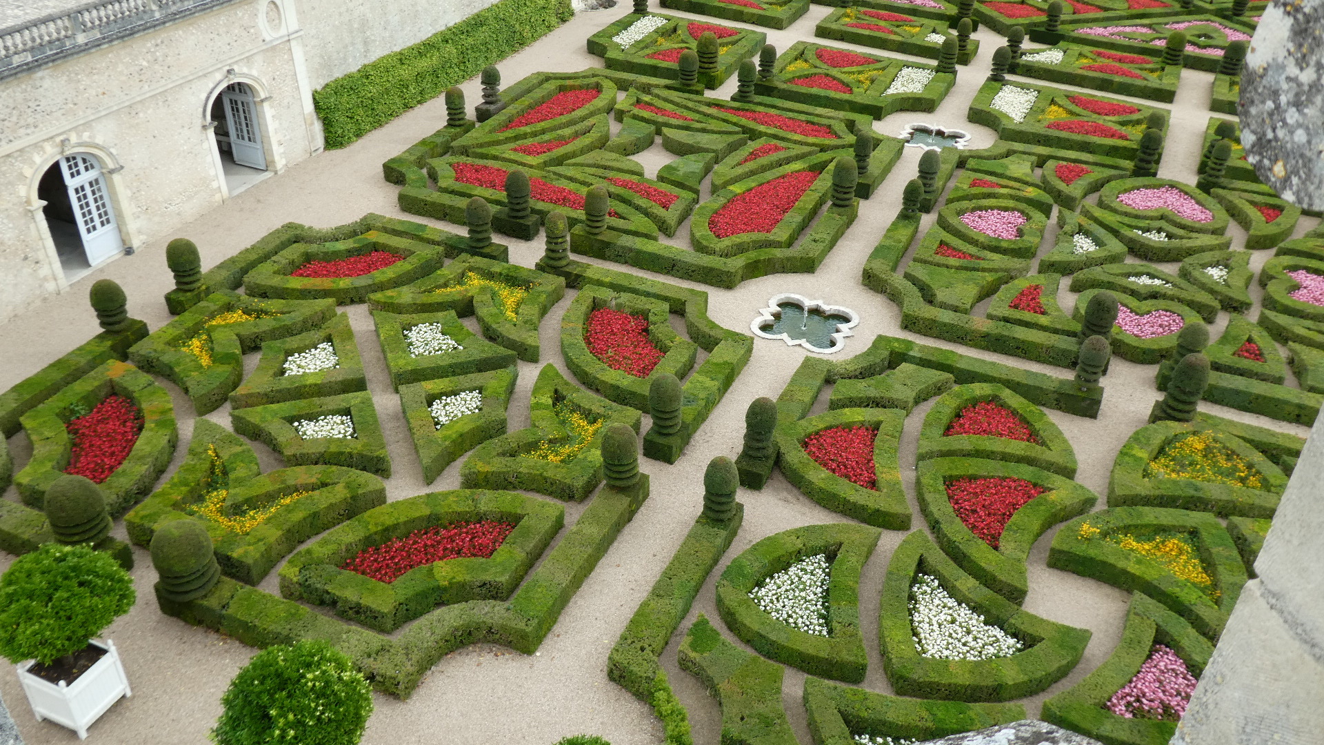 For about 300 km along the Loire, both east and west of Tours, there are about 80 major chateaus. Including lesser ones and ruins, the count may reach 300. It's an amazing thing, and the major ones especially are absolutely world treasures. Chambord is the largest and possibly the most striking, but there are so many more. Villandry is probably our favourite, because it is the one with the best gardens. Today they take the form of formal gardens, covering seven hectares (17 acres). There are about eight knot gardens, framed in boxwood, and then a herb garden and ornamental kitchen garden. There is also a water garden, a maze, a forest, a moat, a lake, and more.
