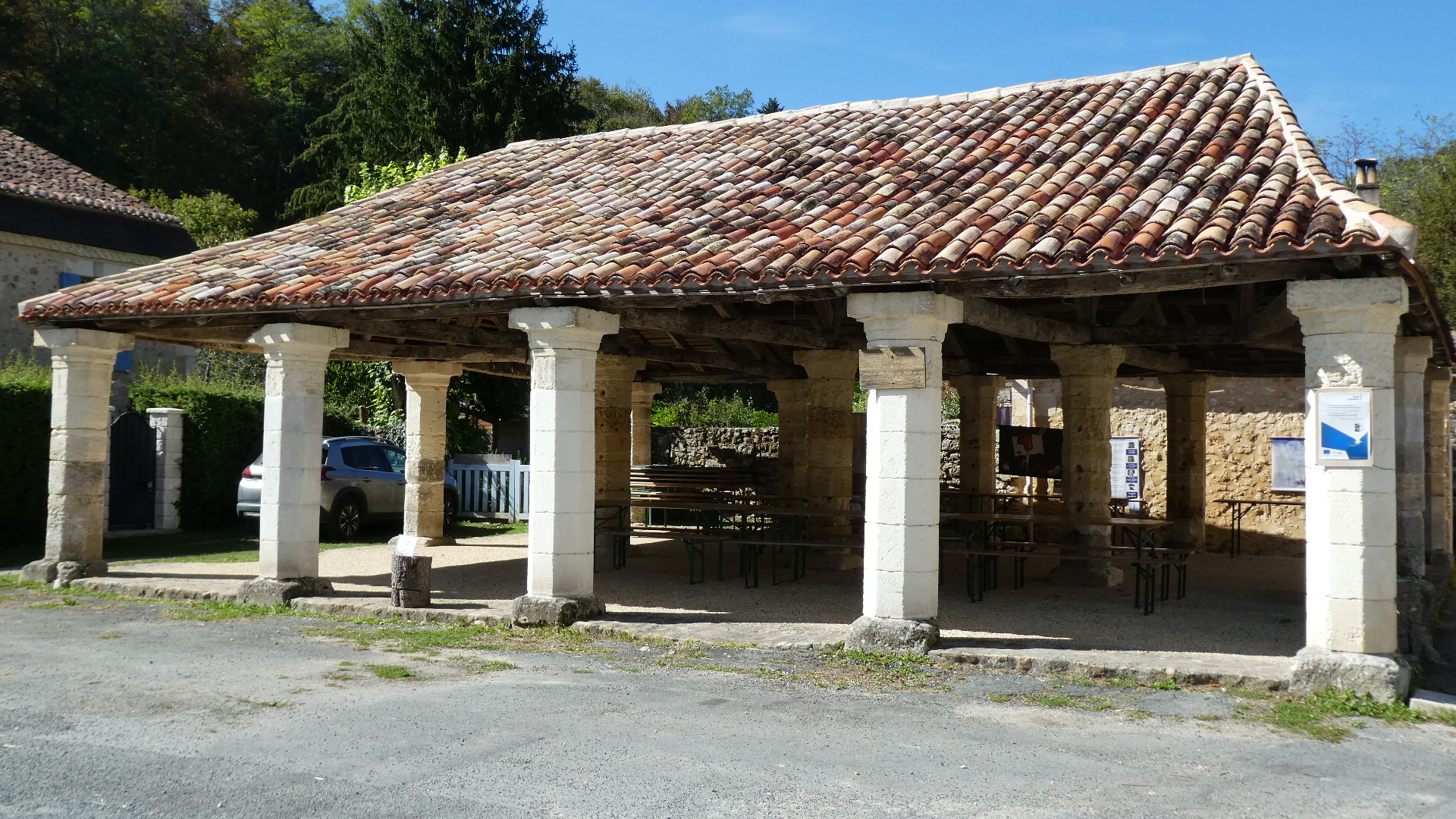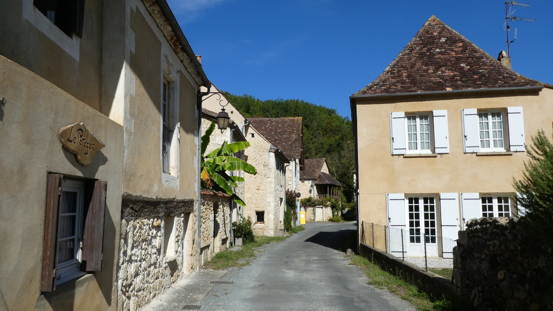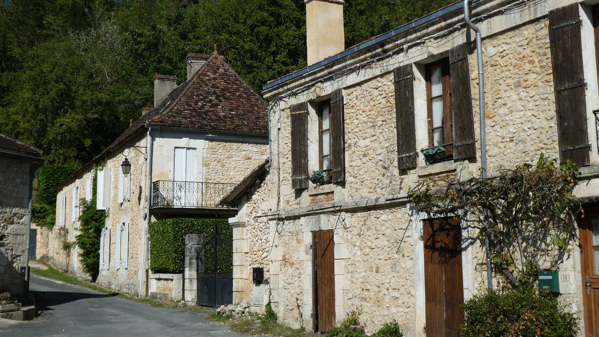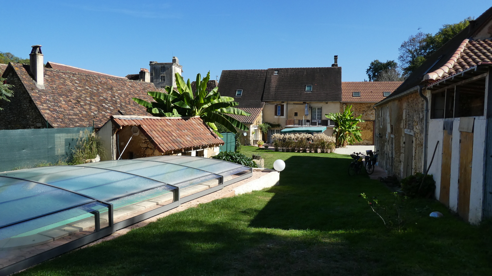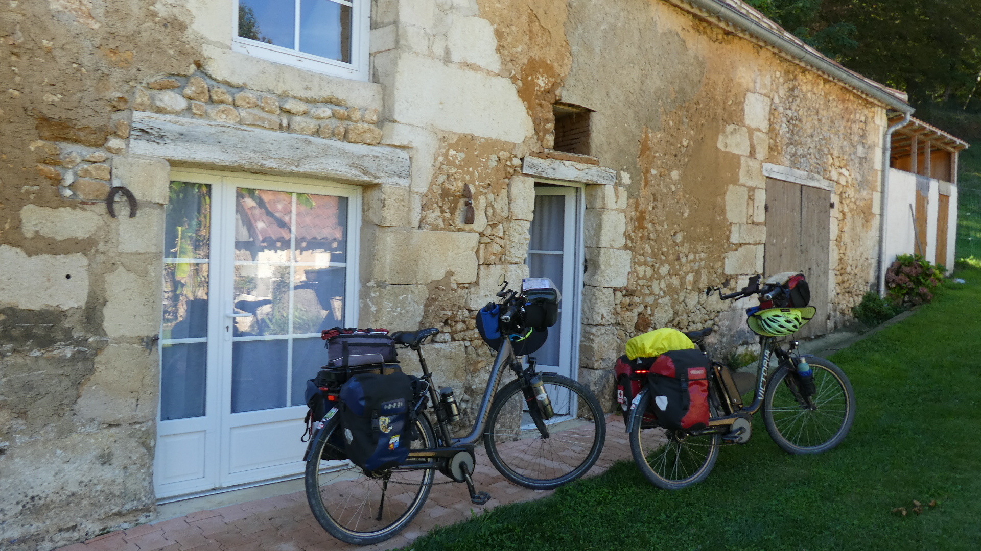 The little town, on the way to Bergerac, where Dodie had found a spot for us to stay, was just off the highway and was more like a cluster of buildings than a town per se. Still there is a bakery and a little grocery, and these mean a lot. The buildings here are rather special, representing a return to the stone construction, that had not been jumping out at us during the day today. And there is even a little chateau, so it's quite a unique place.
