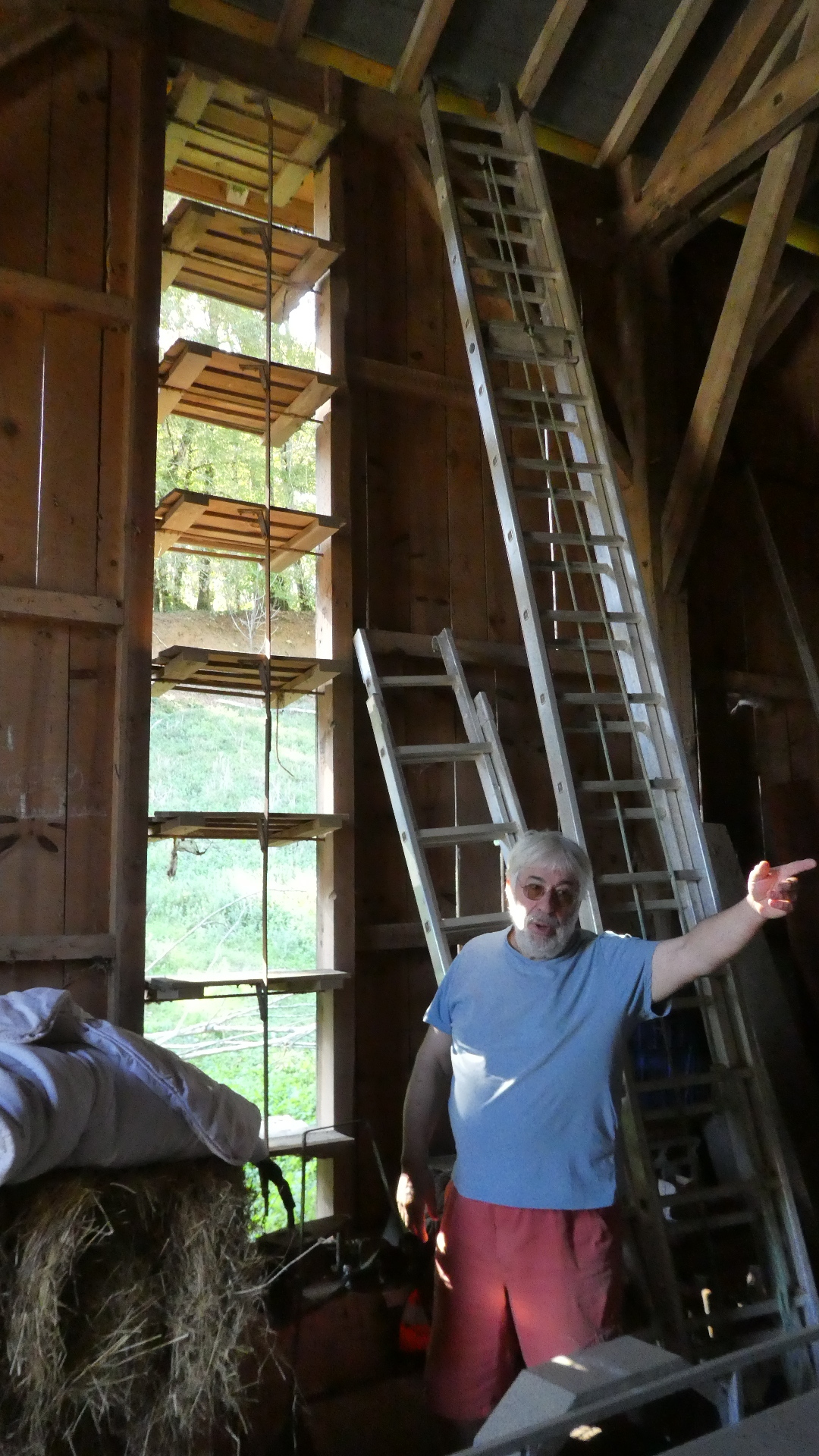 Phillippe explained to us that this area used to grow tobacco, a type he called "brown". This, he said, was a strong one, such as used in Galois cigarettes. The building he was showing us had been used for drying, and the vents he was operating controlled the flow of air. If we understood correctly, some kind of government regulation wiped out the small producer of brown tobacco and "white" Virginia tobacco was substituted and controlled by a large multinational.
