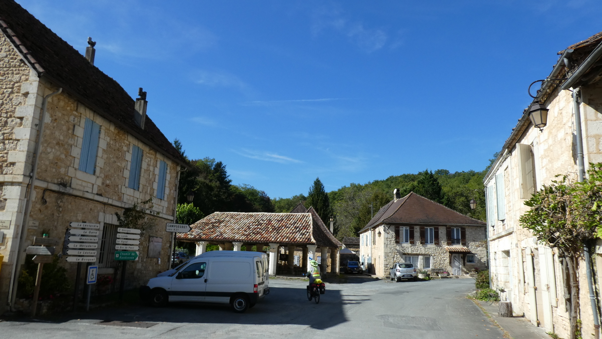 To leave Perigueux and head south west, generally toward Bergera, Dodie did some earnest looking for some very quiet roads. But unfortunately these could not be found. Instead we spent the day riding the dreaded dotted line. When you are doing this, you have to concentrate on holding a straight line, and you cane not spend much time looking at scenery. You also have to fend off the noise of cars, to avoid getting a headache.