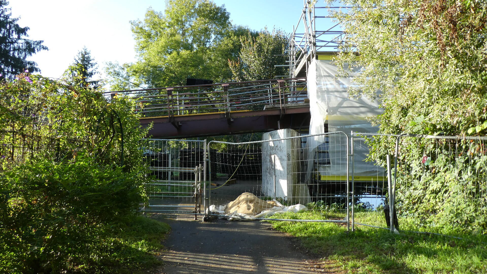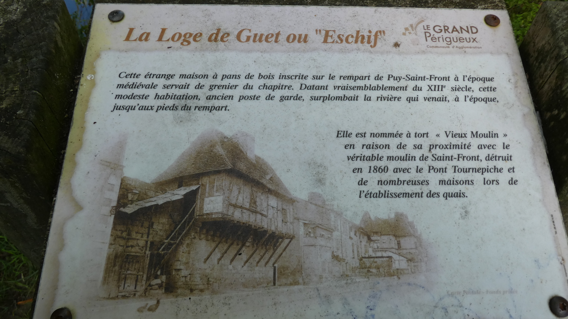 Here we are over the bridge and looking back at the hotel and cathedral. The photo also show that guard house, and on this side of the river there is an explanatory sign.