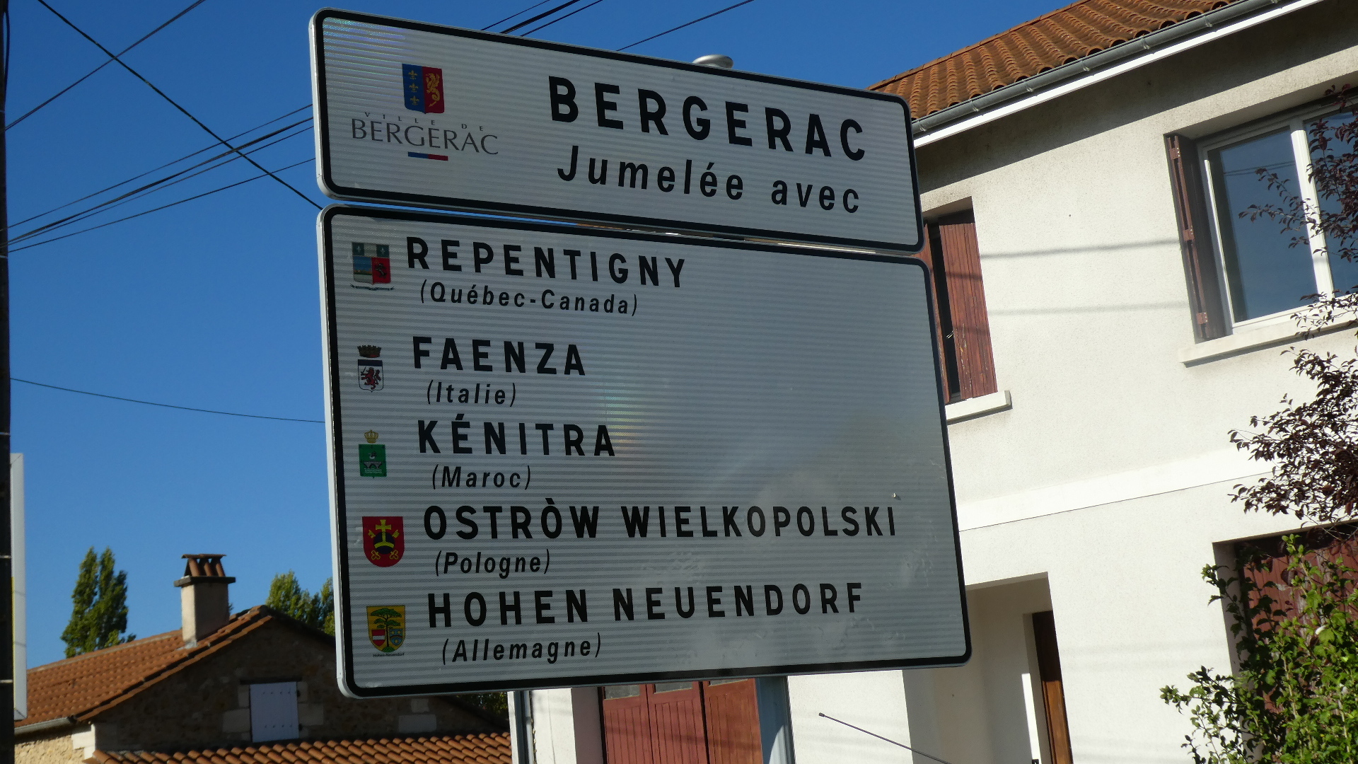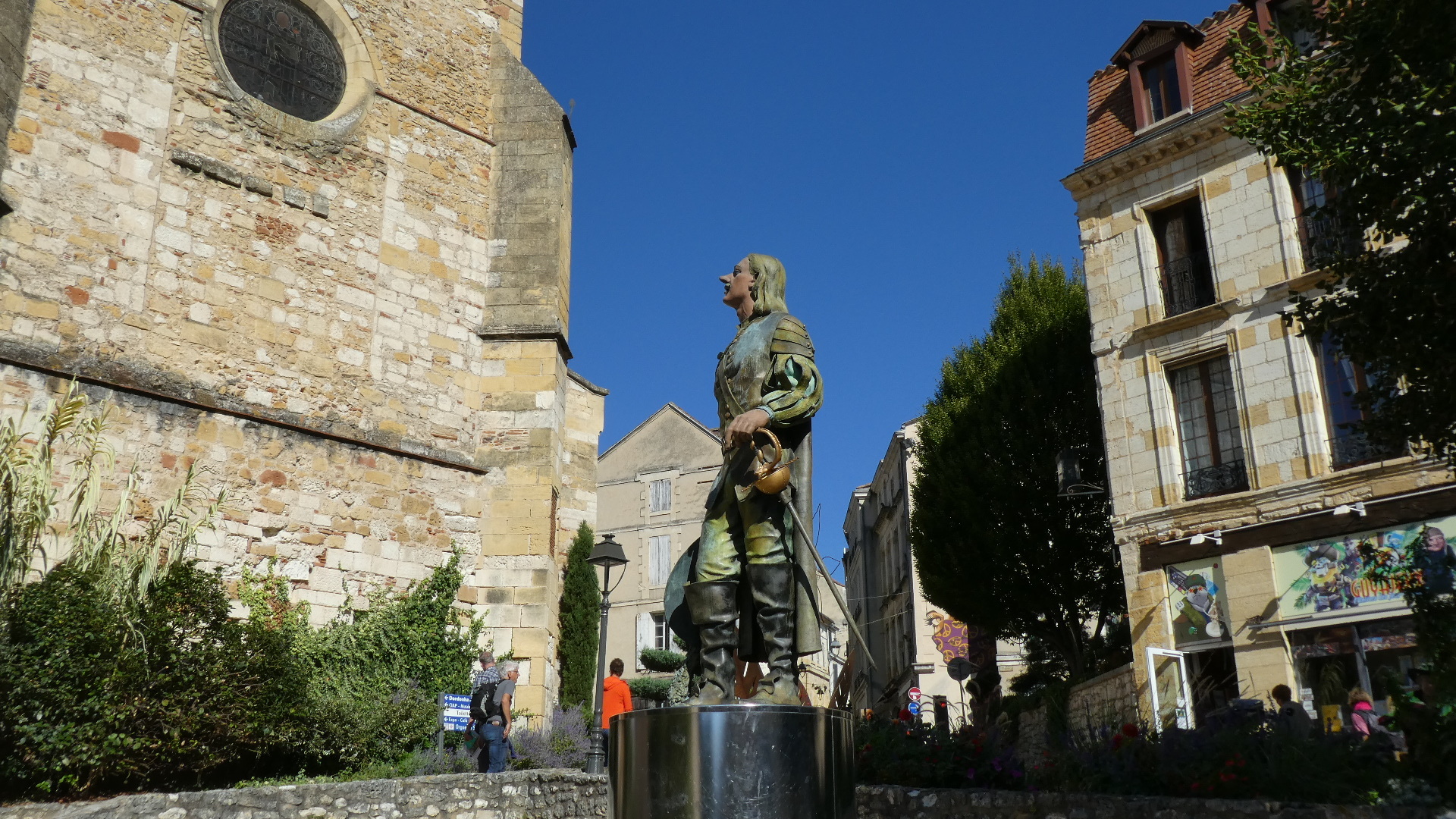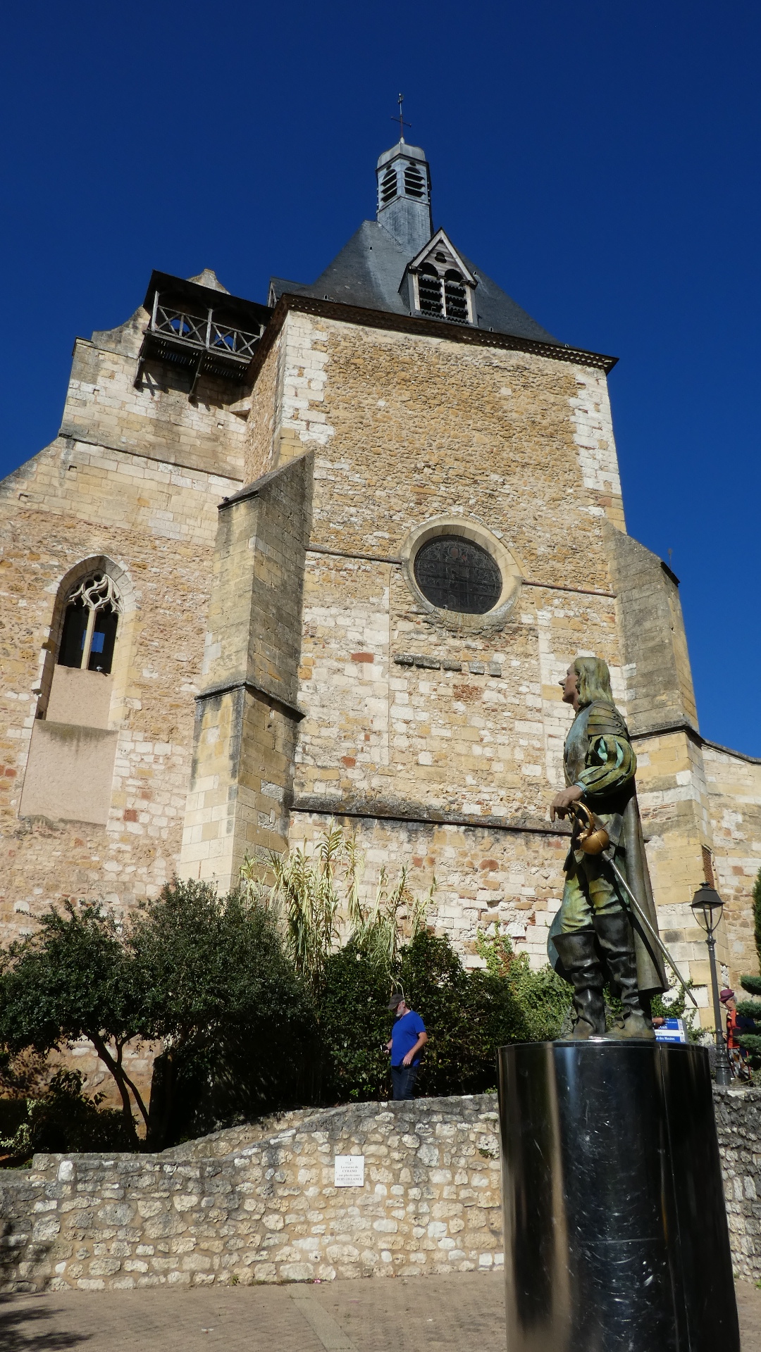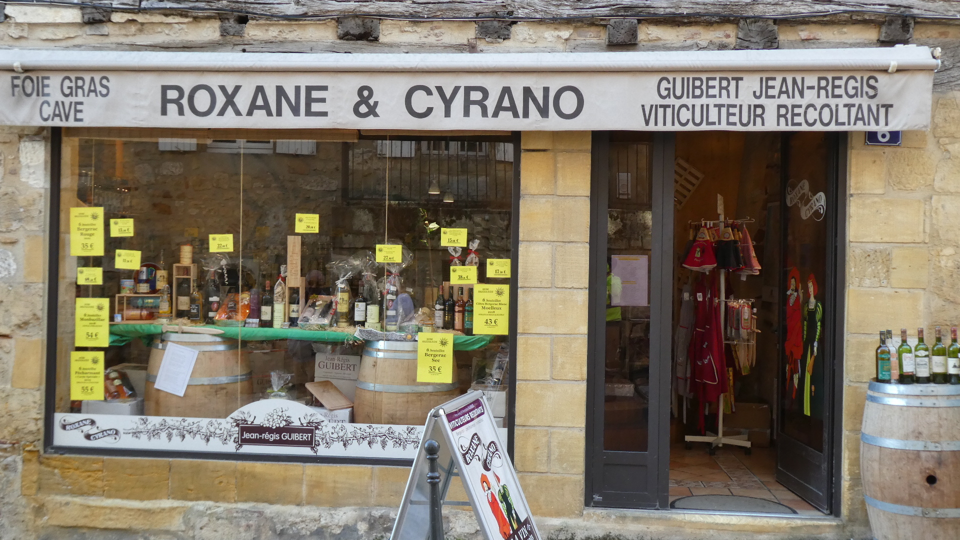 After about tens seconds thought, Dodie decided we should route through Bergerac, even if our distance might turn out a little greater or the roads a little busier. I find her intuition is 99% trustworthy, and this time she really scored big. Mostly unknowingly, we were wandering into a world of wine chateaus, that were complemented by other worlds of stone houses, foie gras, a huge Saturday market, the Dordogne River, and even, or especially, Cyrano (de Bergerac!).