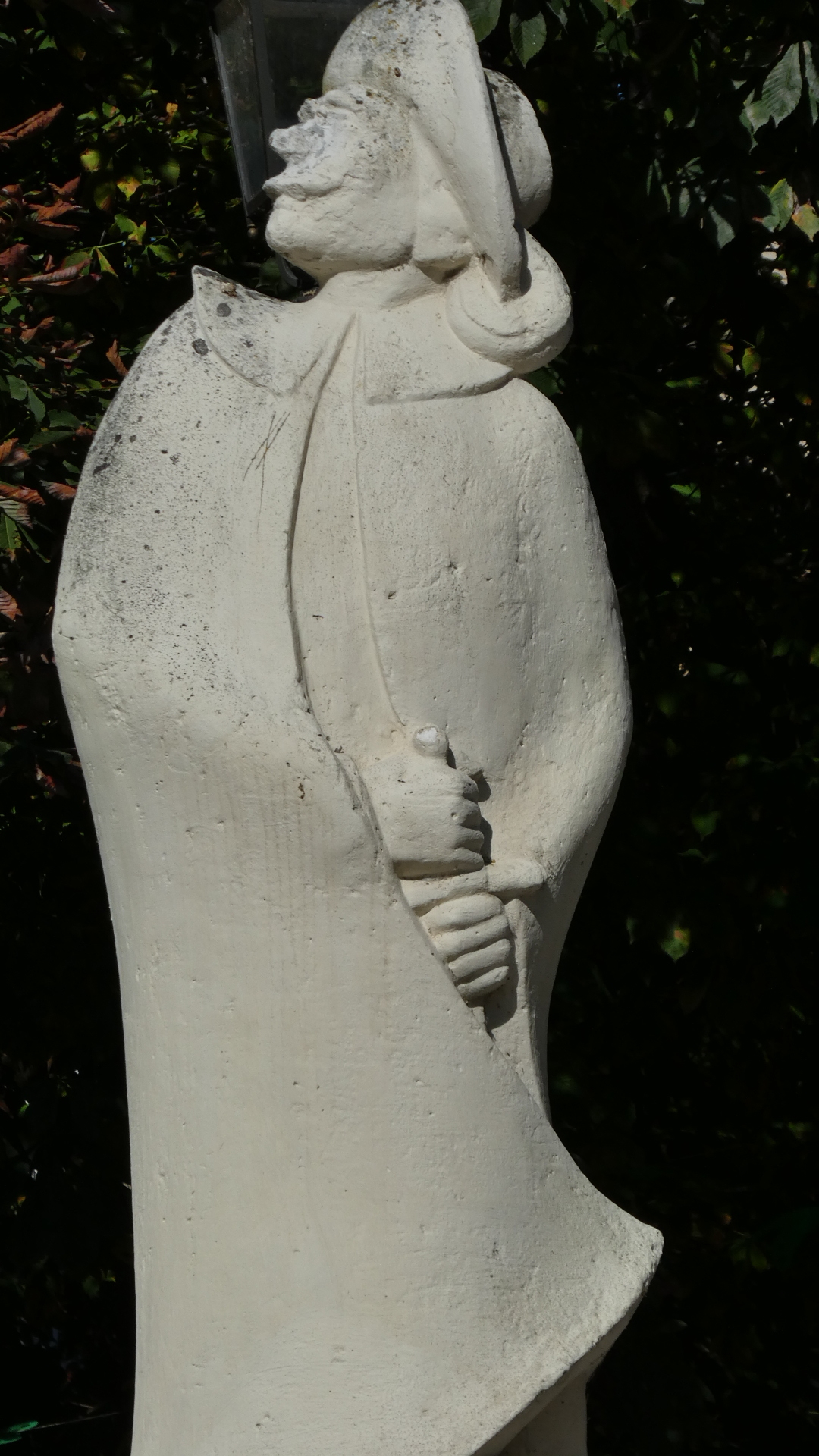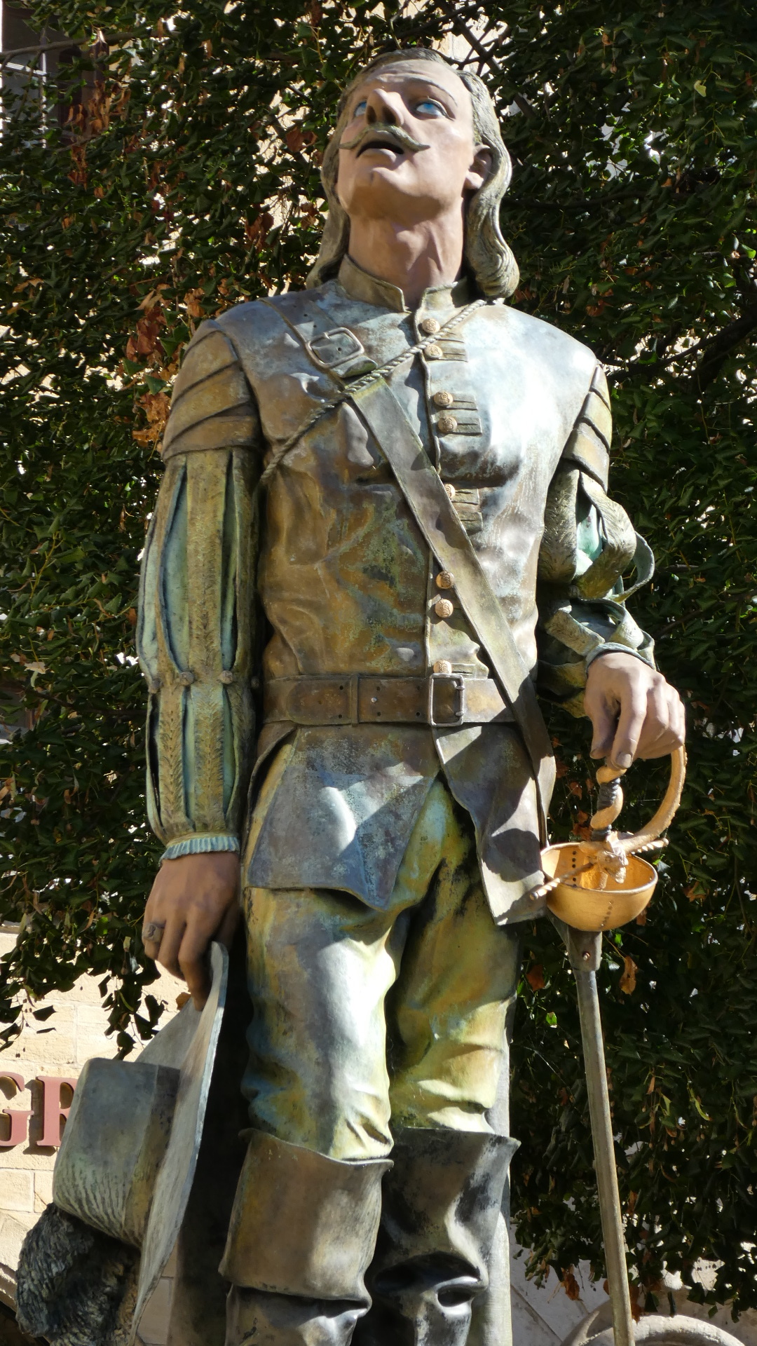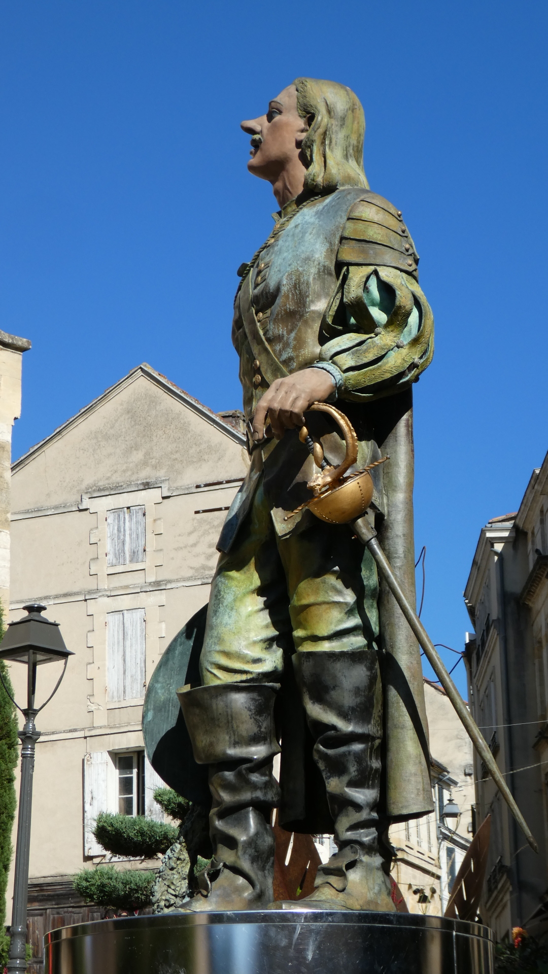 Along the general lines of striking it lucky for today, we walked directly into the little park featuring Cyrano de Bergerac. Cyrano, we have learned, was a real 17th century person in Paris. He was popularized by an 1897 play, in which he falls in love with his cousin Roxane, but can not approach her because he feels himself ugly because of his big nose. Instead he writes poetry for her, which he supplies to his friend Christian. Roxane eventually realizes she loves Cyrano, not Christian. Cyrano dies knowing that, at last, she is aware of his love and that she shares it with him.