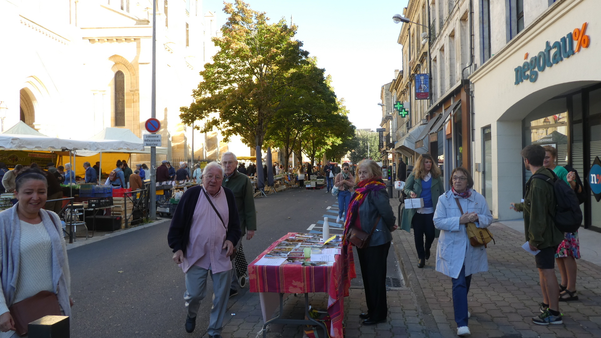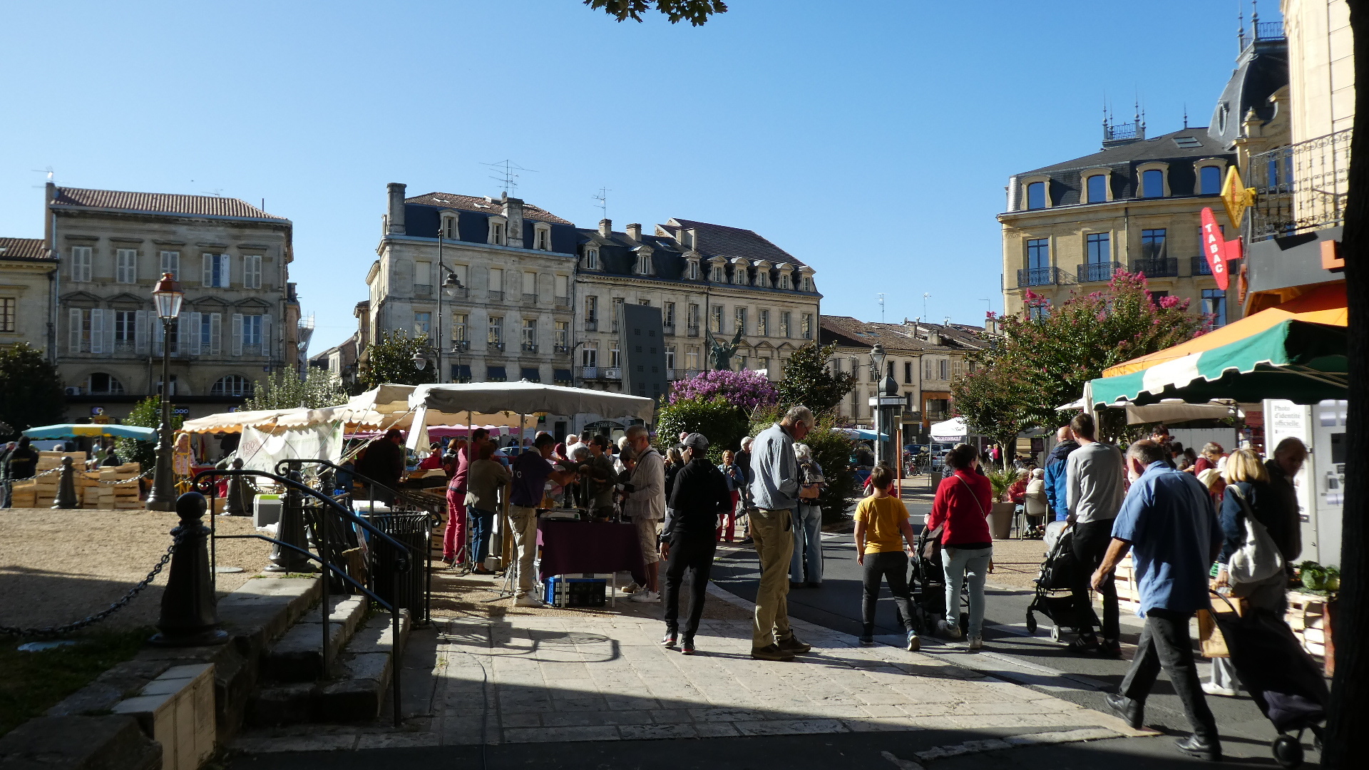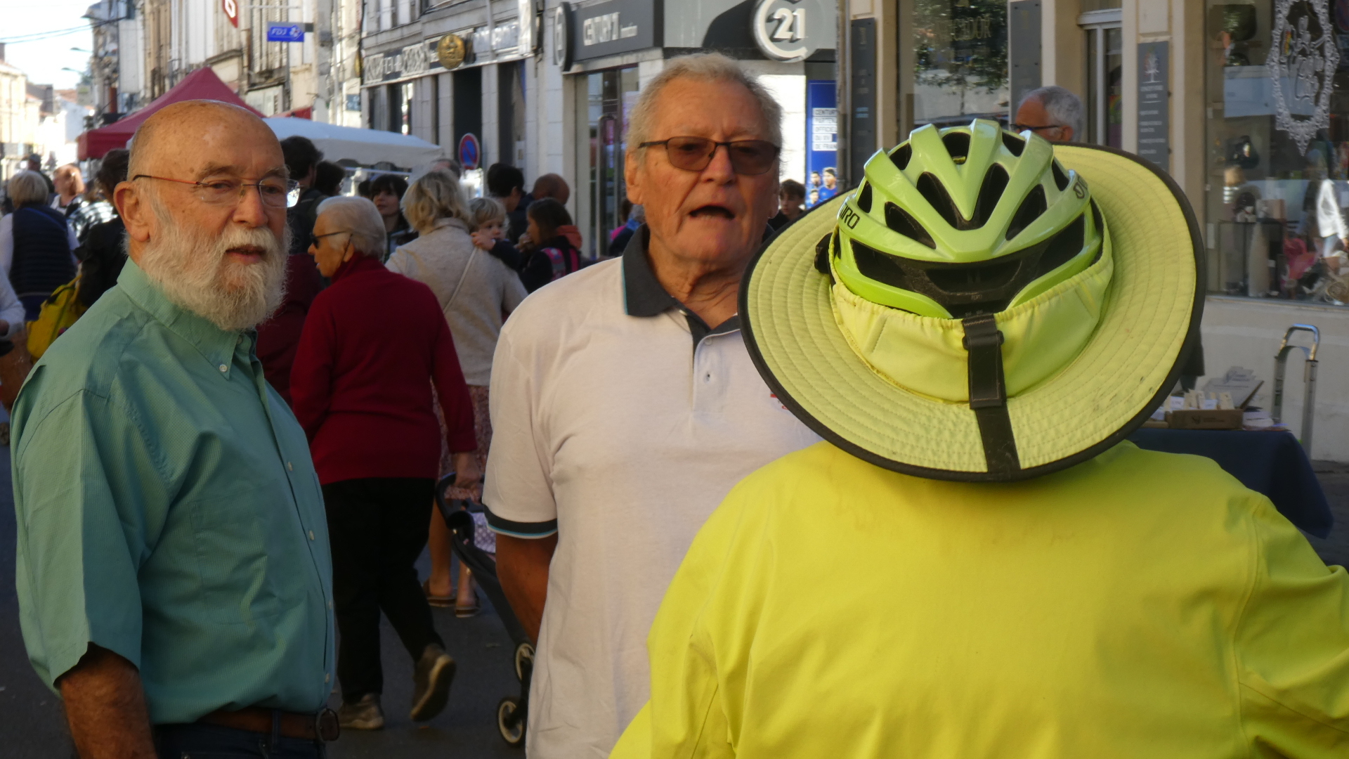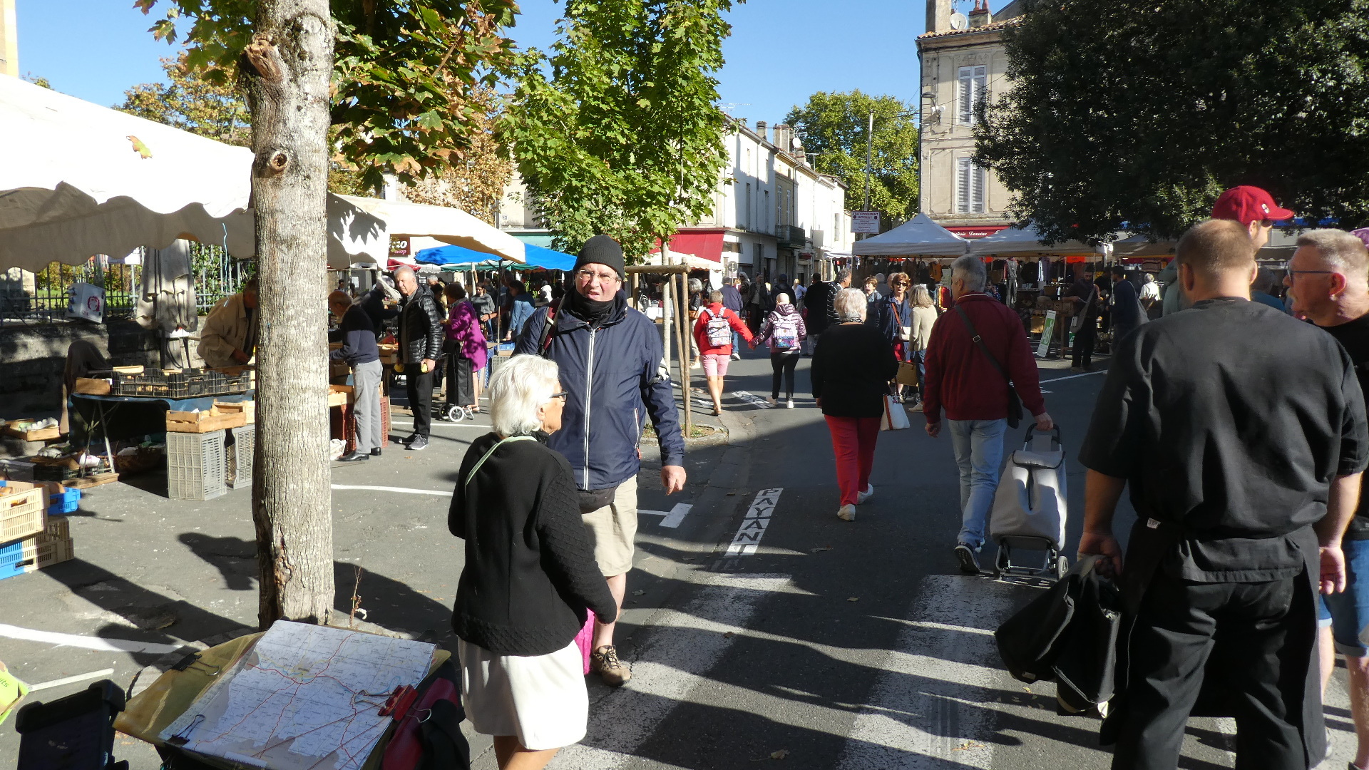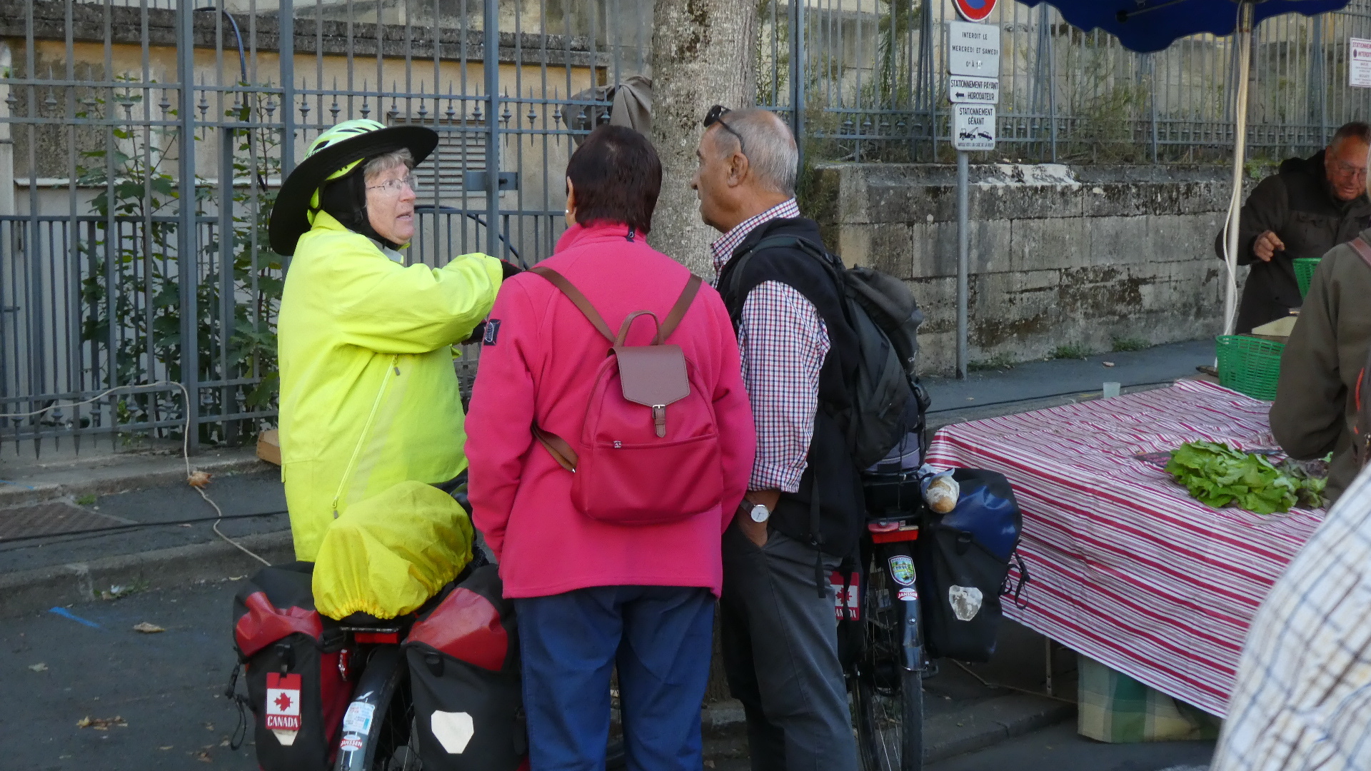 We were kind of targeting the famous waterfront of Bergerac, but we actually hit the church at the centre. We were overjoyed to find that we had also hit the Saturday market. This occupied the streets encircling the church, and overflowed down some side streets as well. The market was incredibly well attended, and it was difficult making our way pushing the bikes by the stalls and among the people. Despite the slight awkwardness of maneuvering the bikes, we found everyone to be good natured. More than that, they wanted to know who we were, where we came from and where we were going. In short, the UQ's. I got held up by several people that wanted to talk, and I was concerned as Dodie vanished up ahead not that I would lose her, but that she would say "Where the hell were you?".