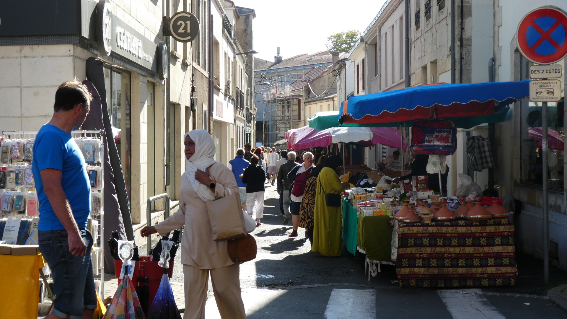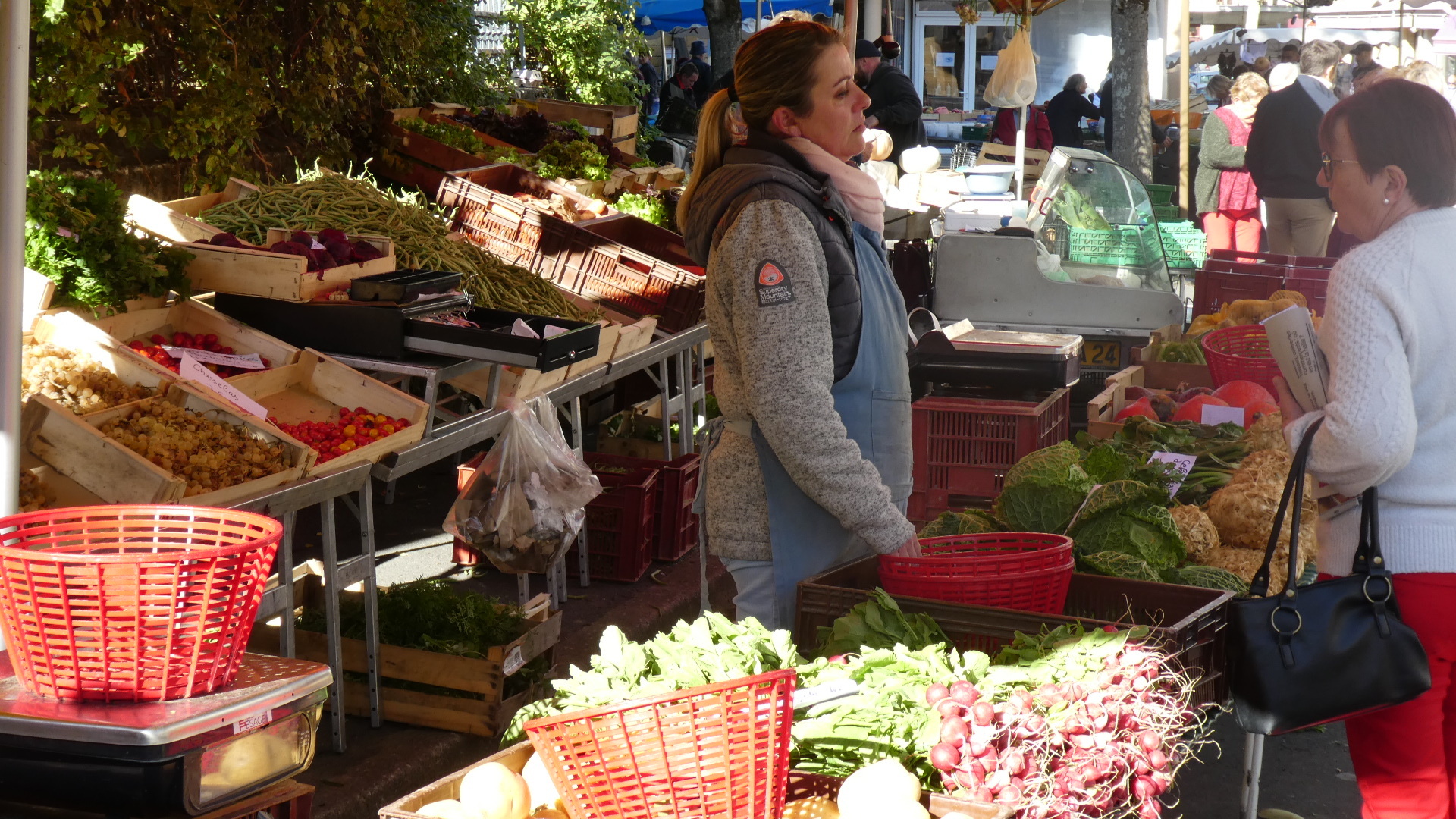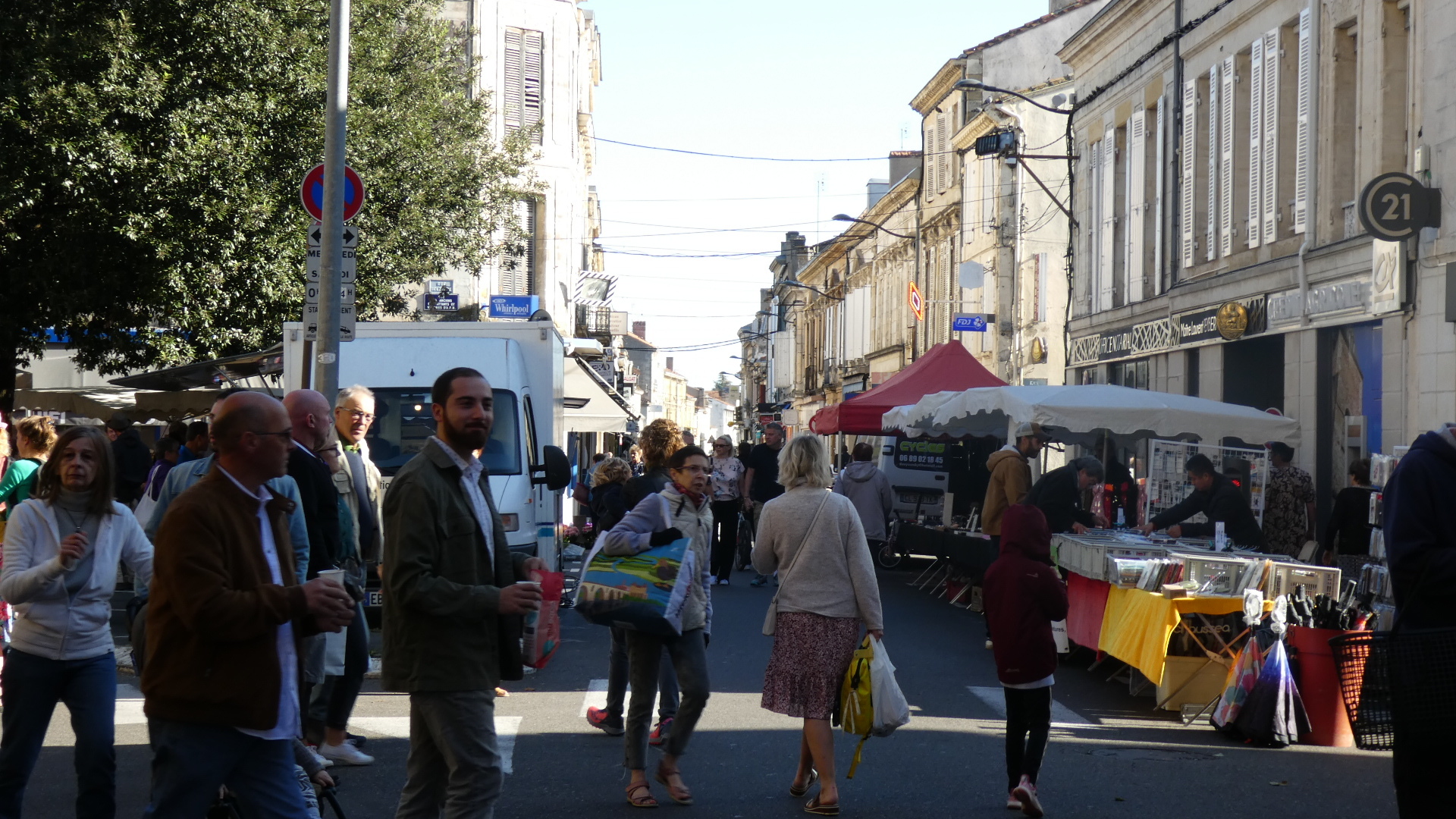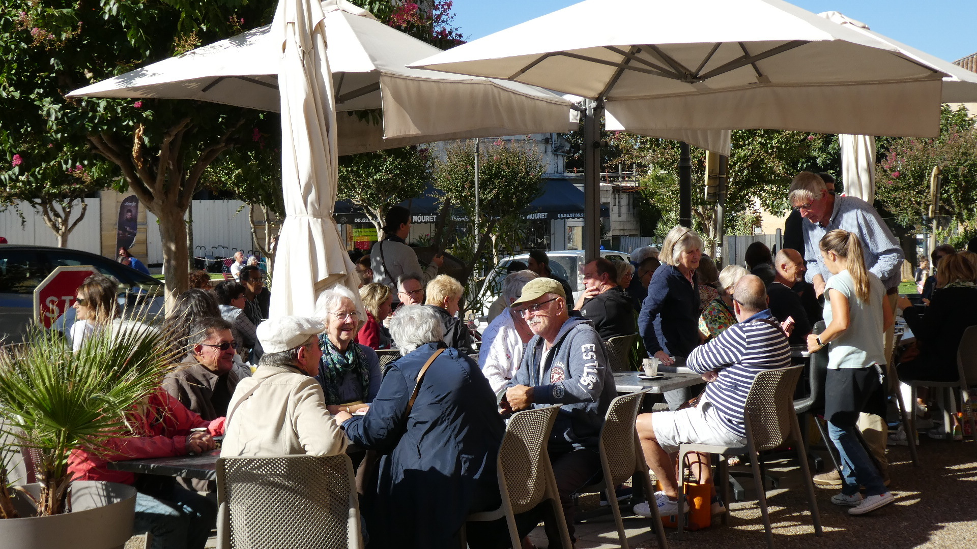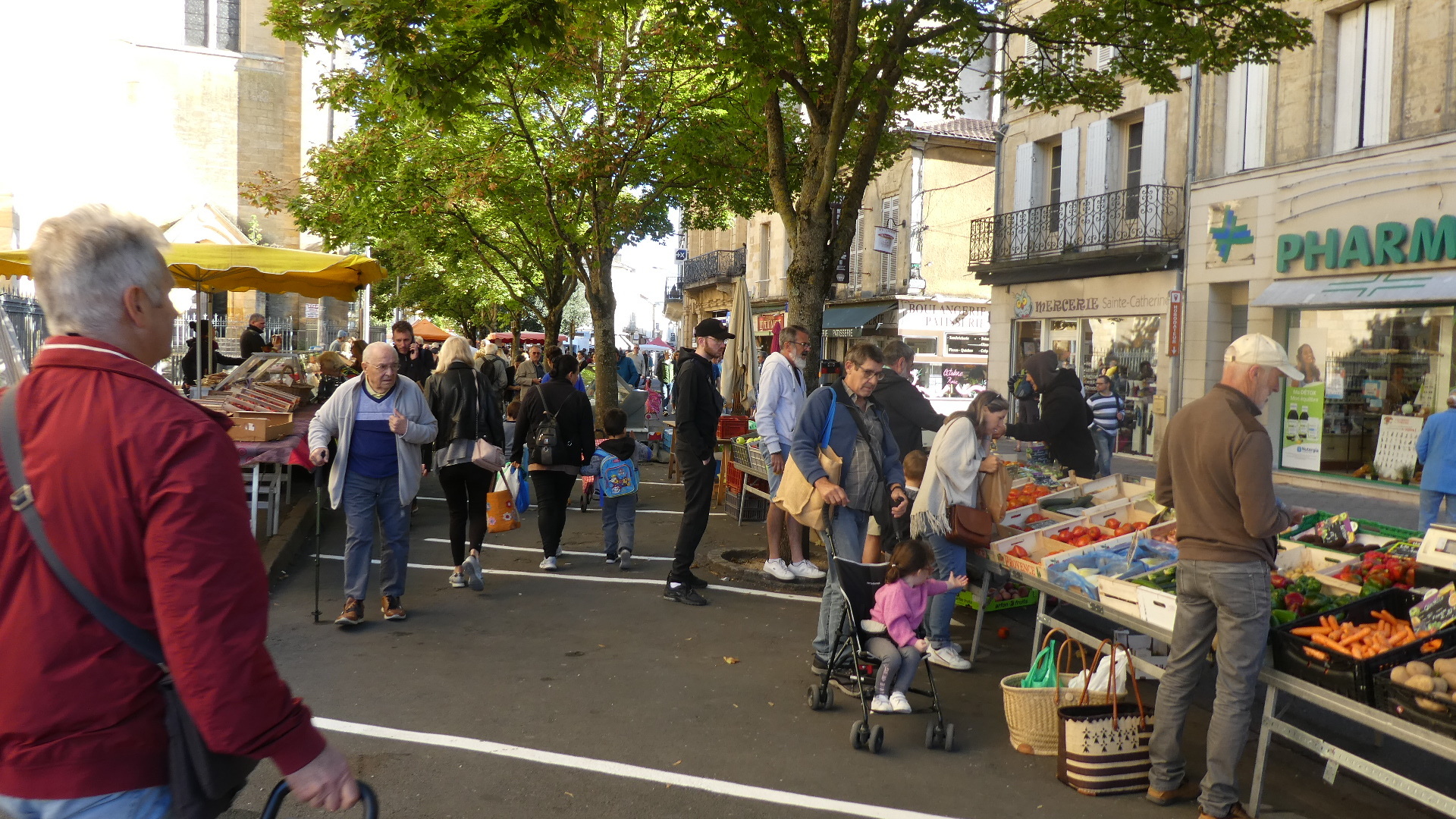 We were kind of targeting the famous waterfront of Bergerac, but we actually hit the church at the centre. We were overjoyed to find that we had also hit the Saturday market. This occupied the streets encircling the church, and overflowed down some side streets as well. The market was incredibly well attended, and it was difficult making our way pushing the bikes by the stalls and among the people. Despite the slight awkwardness of maneuvering the bikes, we found everyone to be good natured. More than that, they wanted to know who we were, where we came from and where we were going. In short, the UQ's. I got held up by several people that wanted to talk, and I was concerned as Dodie vanished up ahead not that I would lose her, but that she would say "Where the hell were you?".