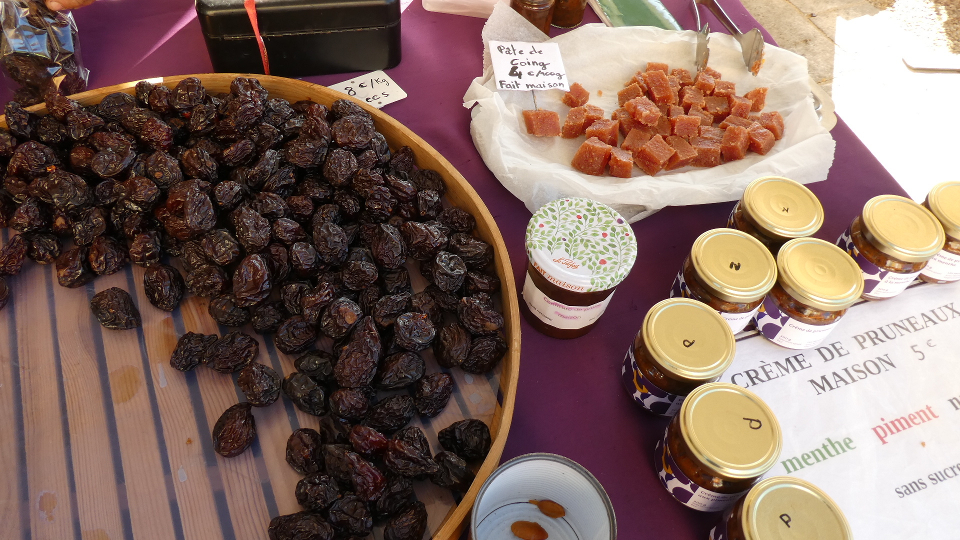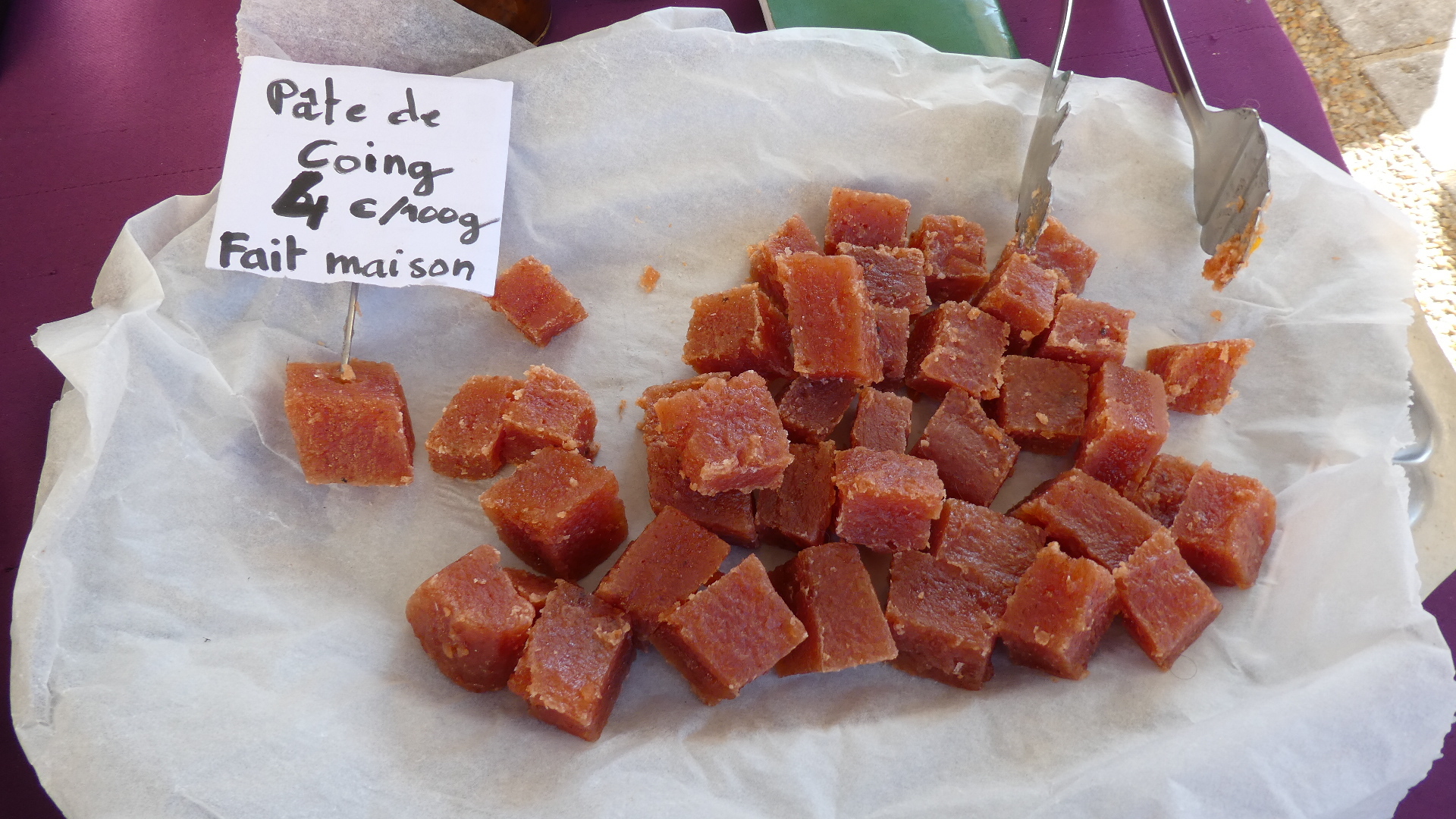We reached the major chateau of Monbazillac, which has a boutique and well organized tour. What we liked was their large and shaded parking lot/ picnic area. We chose a table overlooking the chateau and vines, and picnicked on chicken and potatoes from town, grapes from the field, coffee and hot chocolate and pain au raisins from Saint Georges. This was a truly an unbeatable picnic, for location, for the food we had, for the shade and the concrete table. I am counting on this blog to help us remember it!