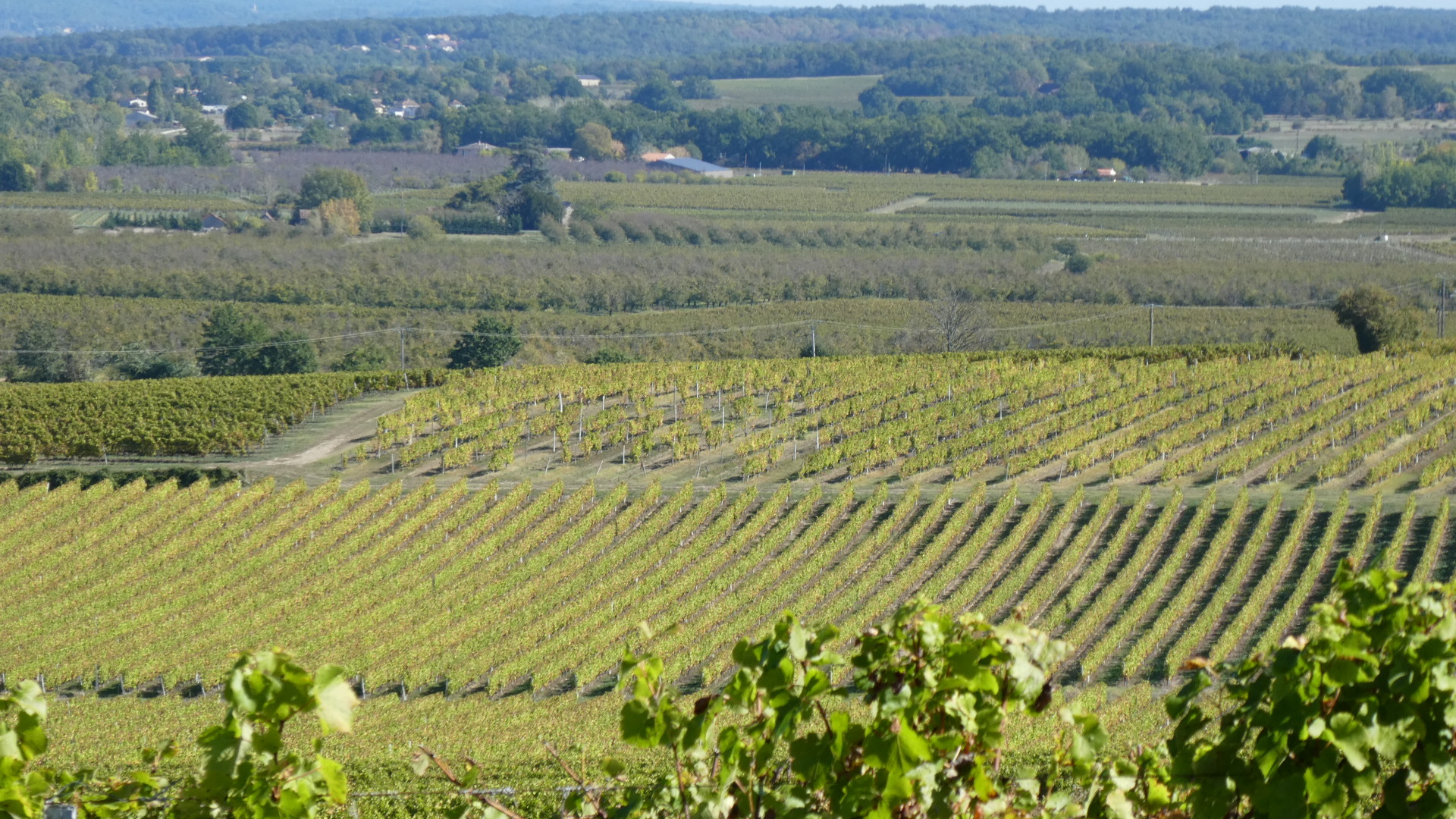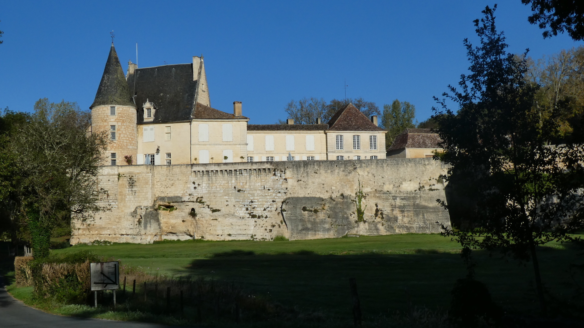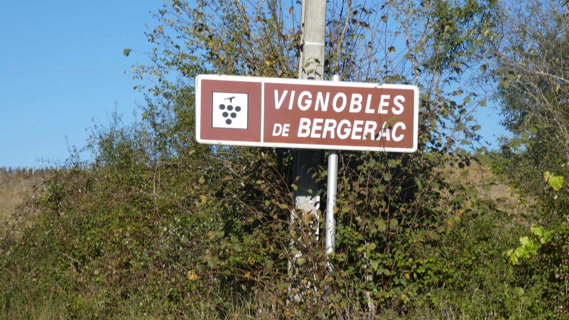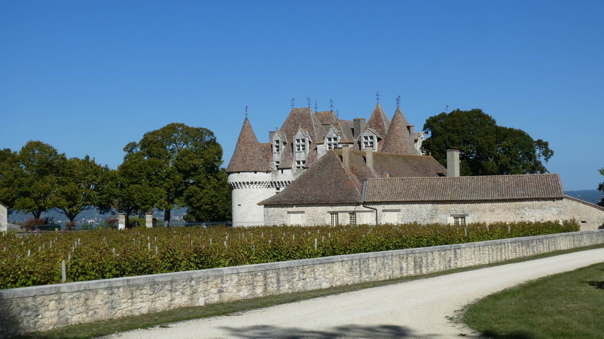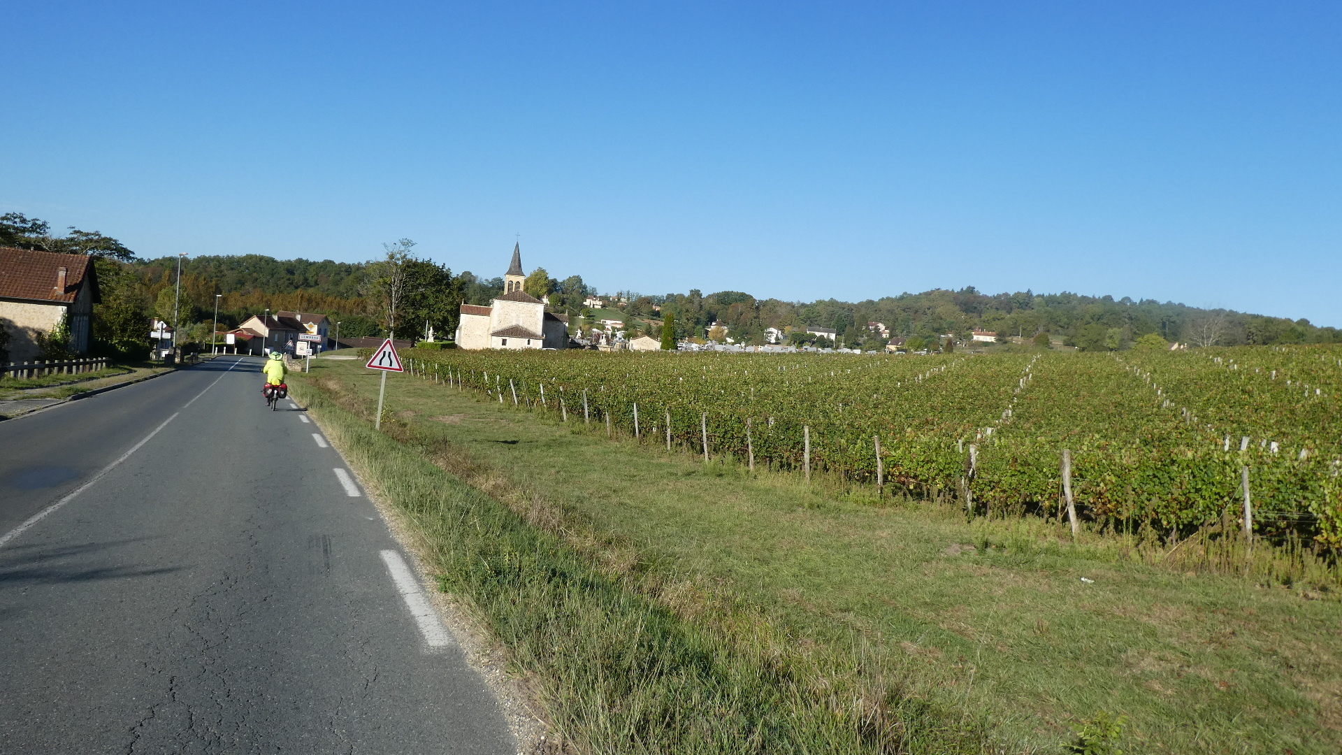 We quickly hit our first chateau, at Monastruc. While this was certainly nice to look over towards and I think they claim to make wine, I have since figured out the situation about vines here. The key to the vineyards is the Dordogne river, which is a major east west affair, joining the more north-south Garonne, close to where they both enter the sea at Bordeaux. The Dordogne vineyards are on the south side of the river, at least in the vicinity of Bergerac. So here we were charging down from the north, and we would not really encounter the Dordogne until Bergerac, which is on the river. Once we would cross the river there, (and with a fair bit of climbing the ridge on the south side) we would be in vine and chateau playland.