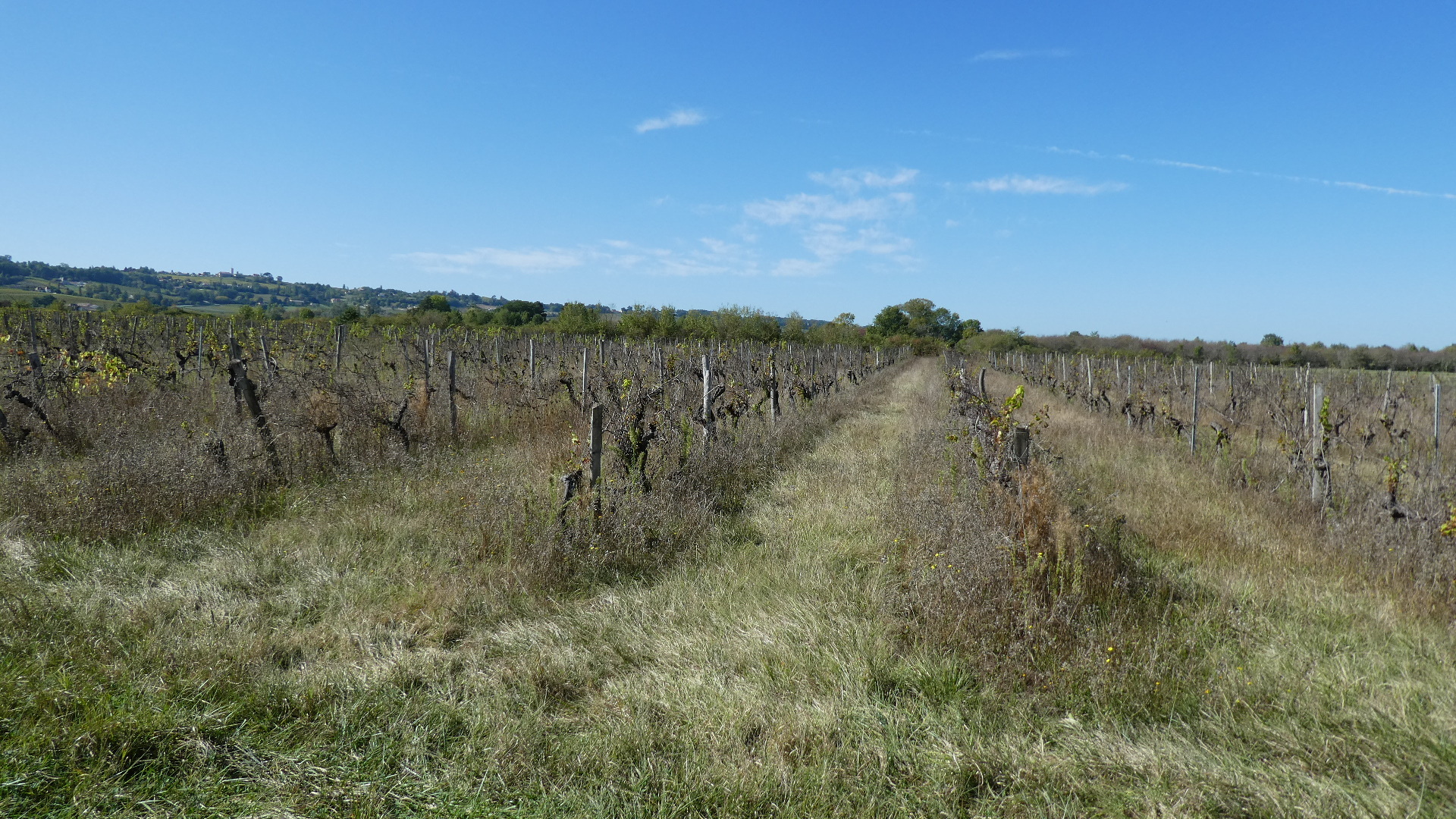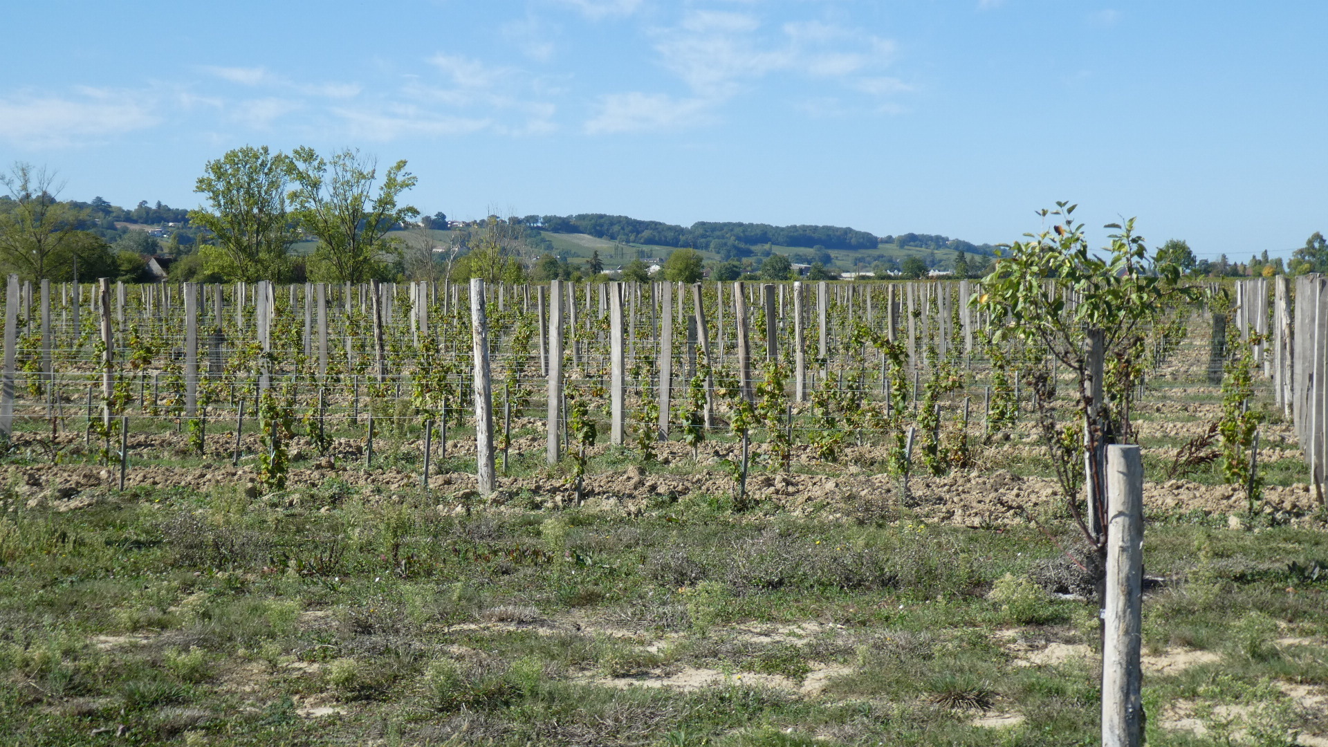 Now began a fairly long climb away from the river and up through vine and chateau central. The vines were everywhere, and running off to the horizon, but they held some puzzles for us. First off, what variety is being grown here? Next, why are they still all on the vine, getting mushy or even already turning to raisins? We also saw a neglected vineyard and wondered if they were closing down - related to not havesting? But no, we also saw new plantings being started.