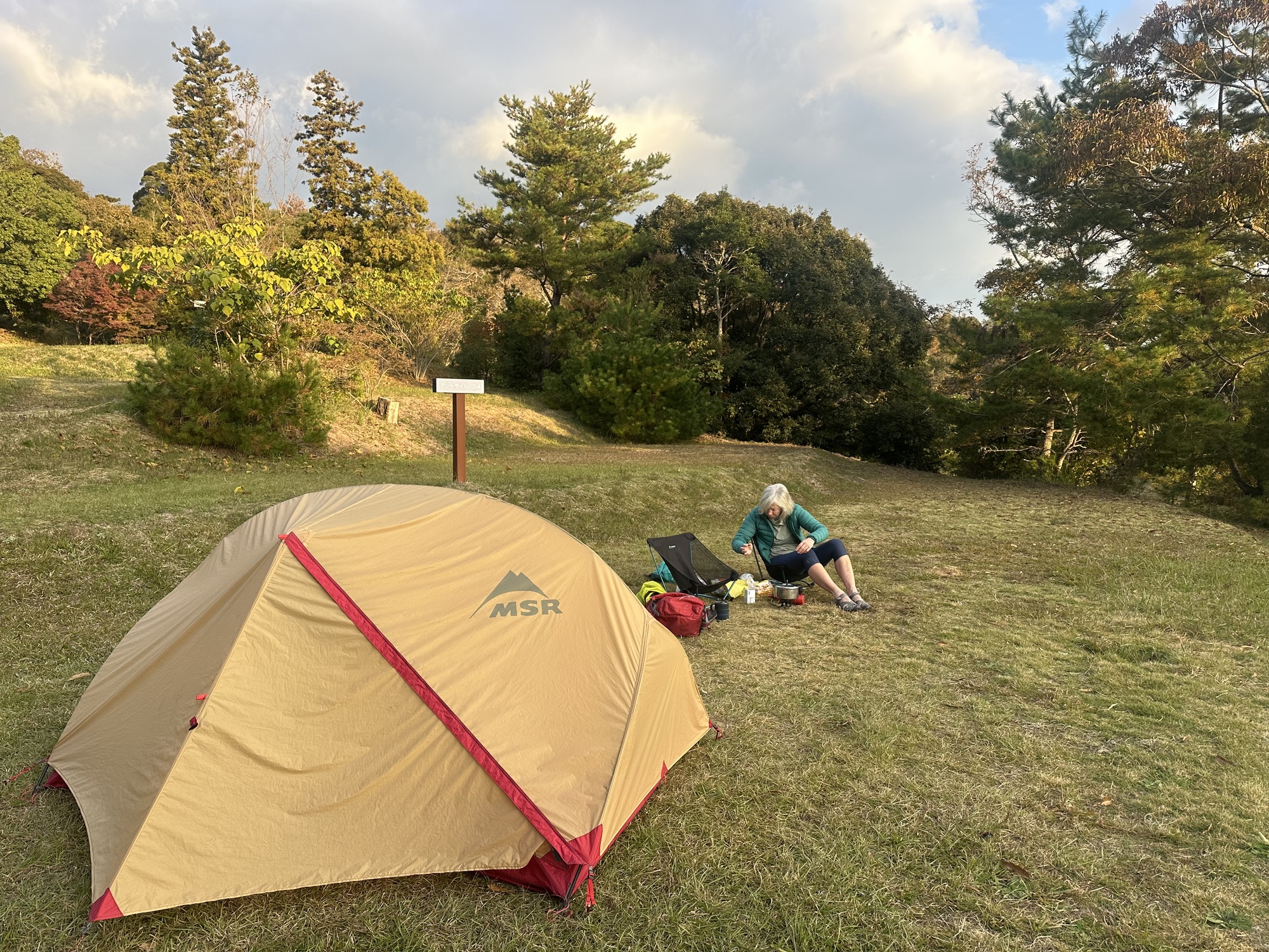 We ended the day by leaving the highway to cruise through some calmer secondary roads en route to our destination for the day, a campground in a regional park outside the small town of Sanyo-onada. The park was quite lovely, with a network of paved walking paths around a series of small lakes. The campground was on a terraced hillside overlooking a lake, and — can you guess? — yes, empty! Like so many of the campgrounds we’ve been to in the last few weeks, this one was deserted except for us. We set up our tent and then headed off through the park in search of an onsen that google maps told us was nearby.