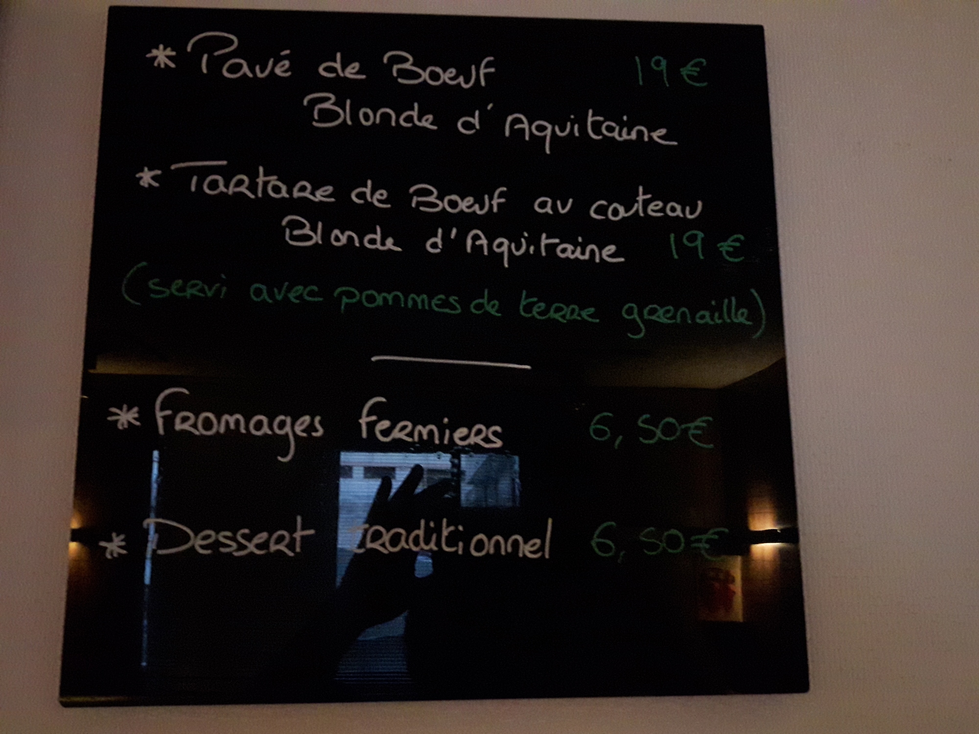 The promise of bacon at breakfast came true, and the rest was fairly good as well. We also noticed on the wall a bit of a menu touting local beef - the Blonde d'Aquitane. We take this to be our favourite (to look at) cafe au lait cows.