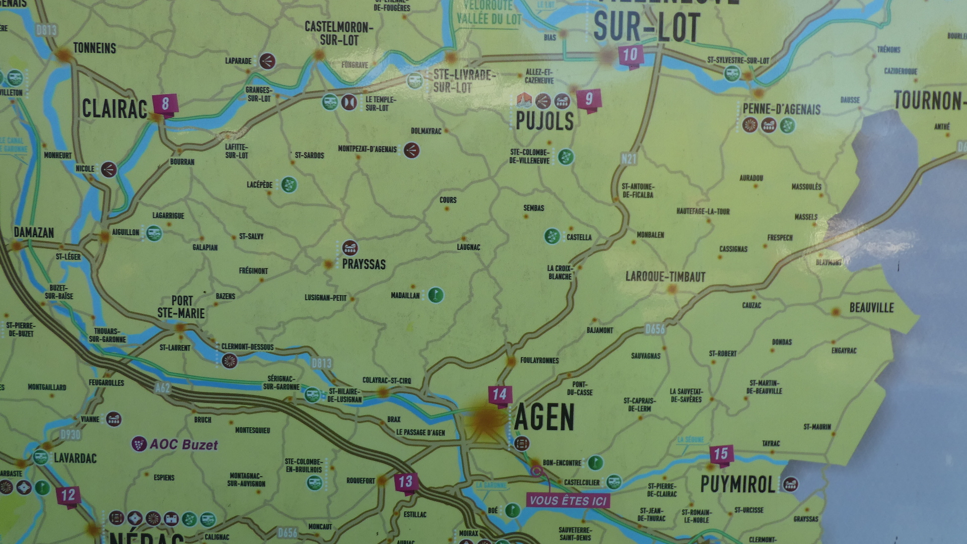 We began by noting, a bit ruefully, that from Villeneuve/Pujols we could have cruised bikeways along the Lot until jumping onto bikeway along the Garonne, and into Agen. Instead, we took the overland route Pujols/Prayssas(Lussac)/Agen and paid the price in climbing and then traffic.