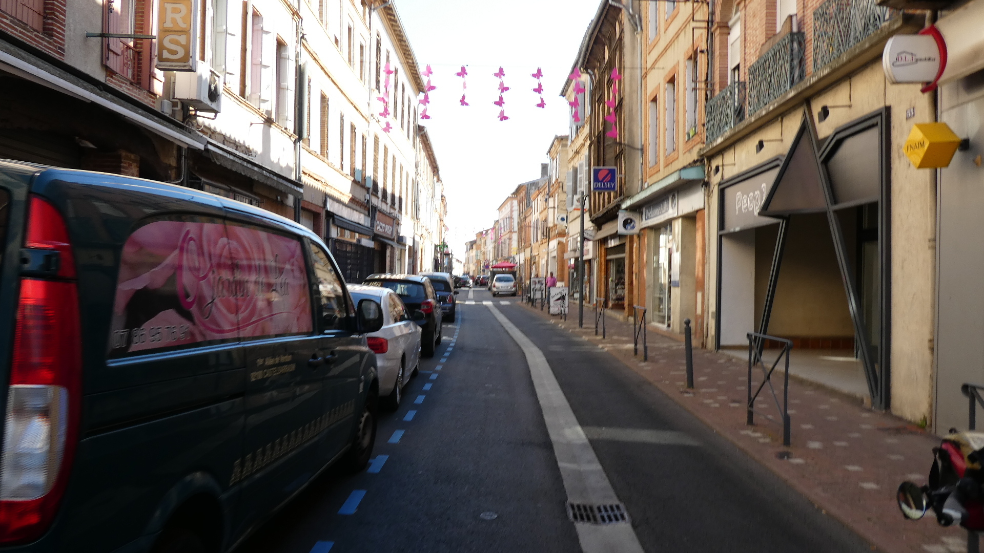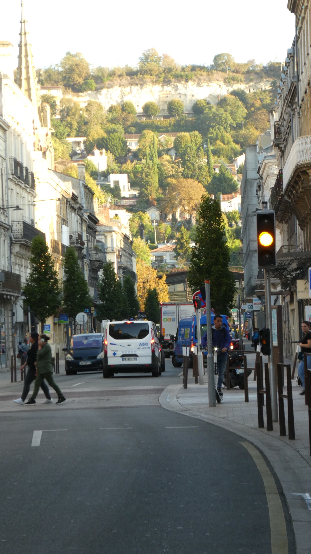 We didn't spend much more time in Agen, which had somehow failed to impress or intrigue us. We did take a shot down to the end of our street, revealing a possibly scary hill. Also scary - no bike lane in the street!