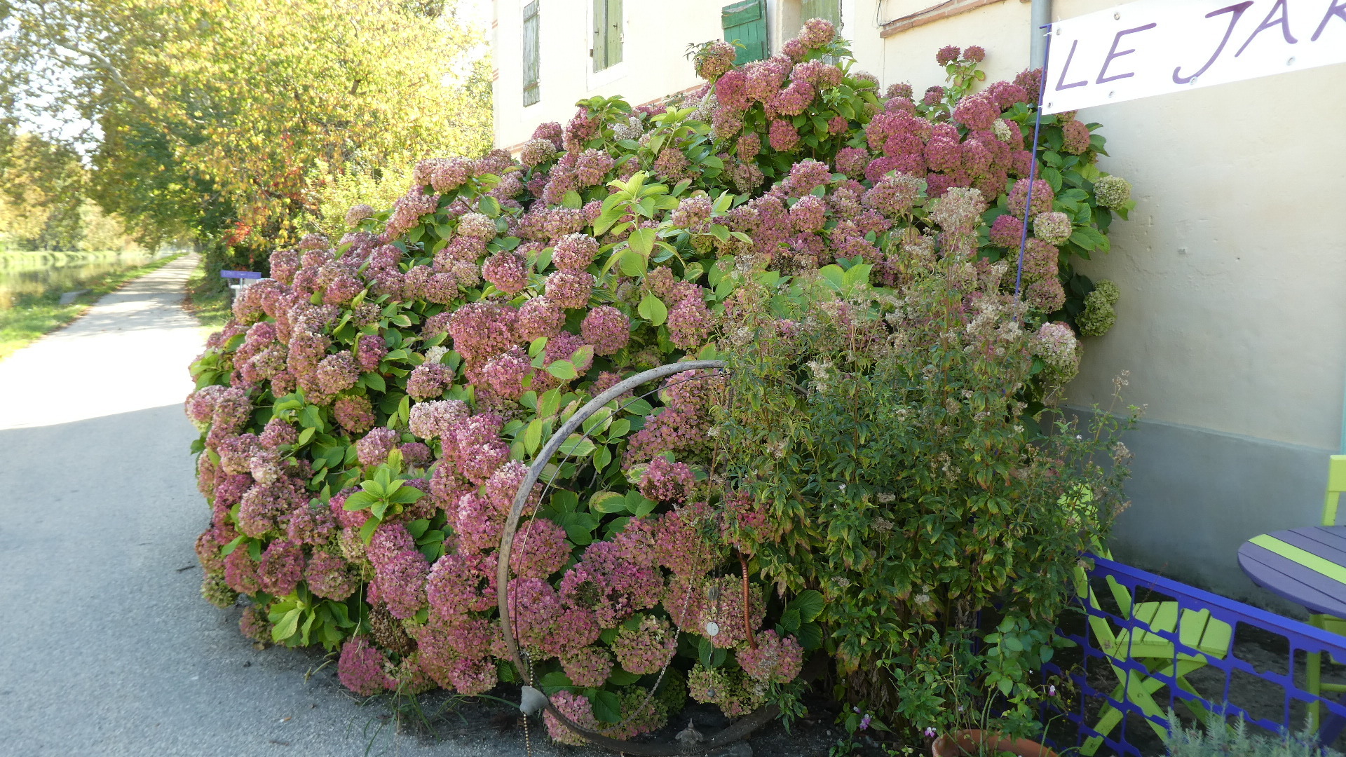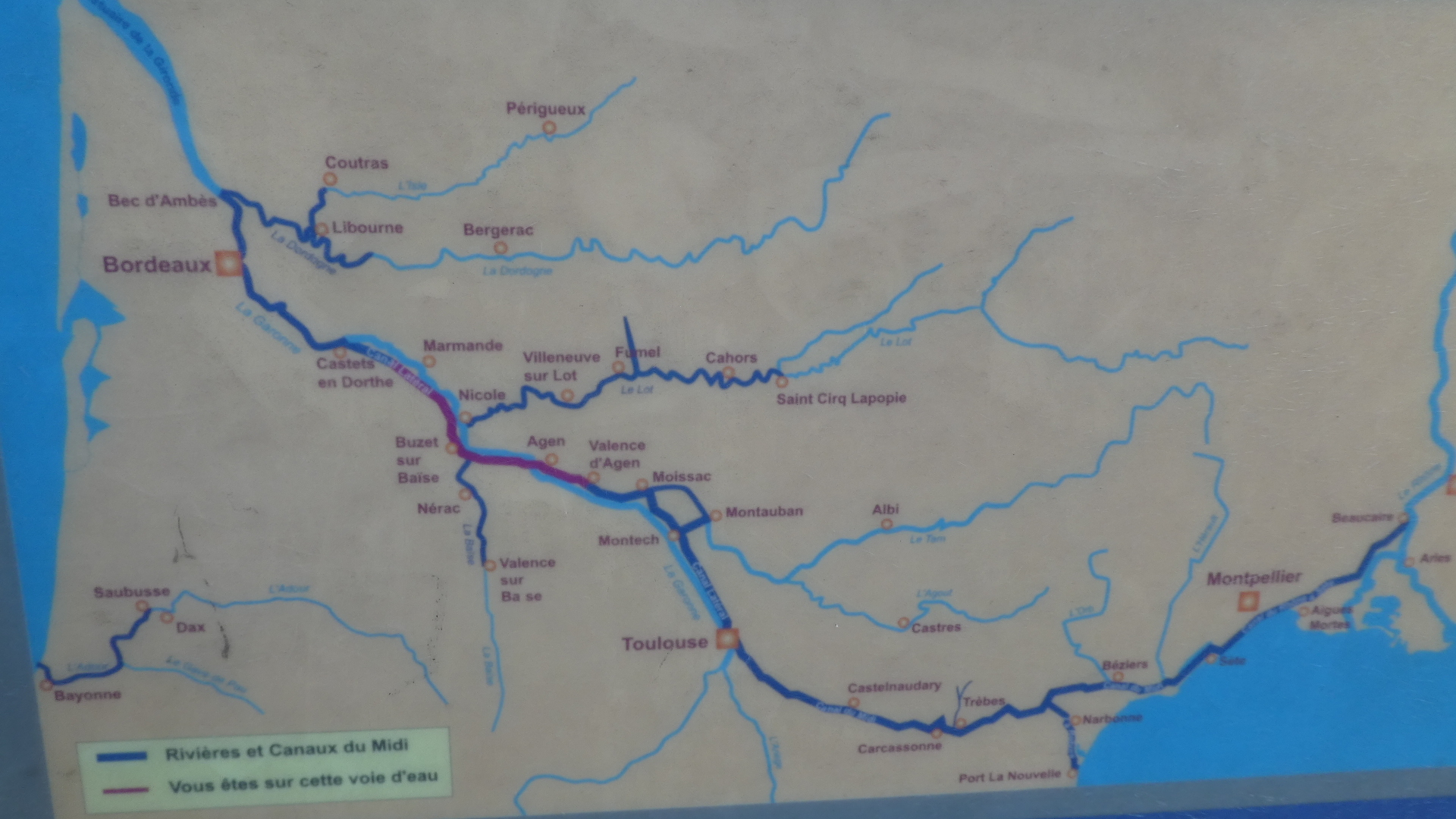 Now that we are on the Garonnne system, we will take advantage of canals all the way to the Med. The Garonne itself rises in the Pyrenees and flows to the Atlantic at Bordeaux. But from Toulouse there is the Canal du Midi. We recall that that the path along the Canal du Midi is decent, until Carcassone, though that memory could be faulty! Still looking at this rather fuzzy map, we are currently near Moissac, on the Tarn. That is downriver from Albi and where the Classens are Poking About. Hi Classens!