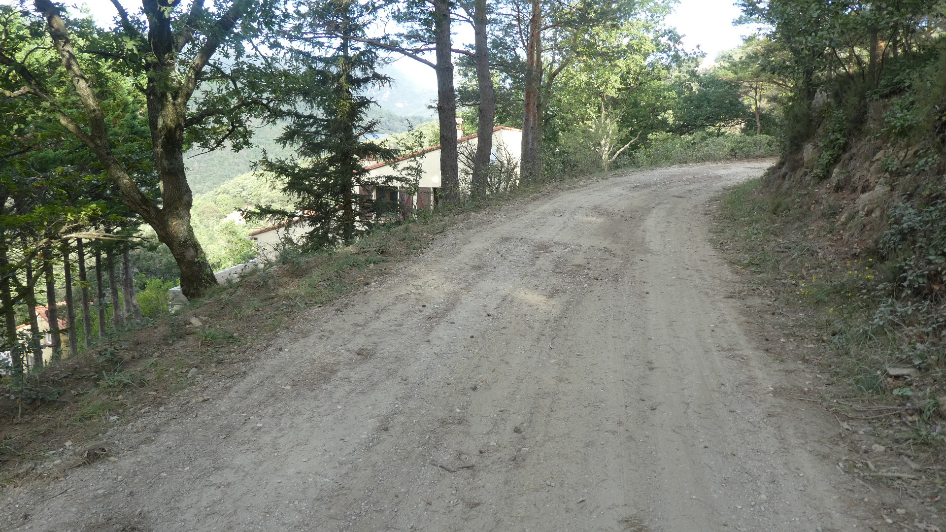 A strange aspect of the pushing up here was that we were passing numerous houses. This shot down any fantasy that we were broaching some remote mountain pass. One house also had about five white dogs. Maybe these were Pyrenees? Their faces are not quite right.